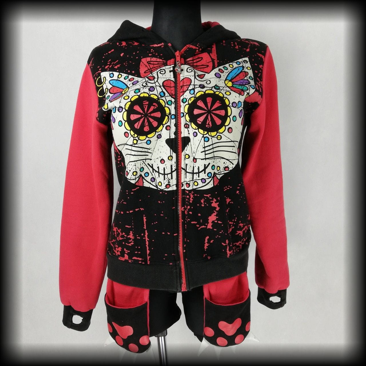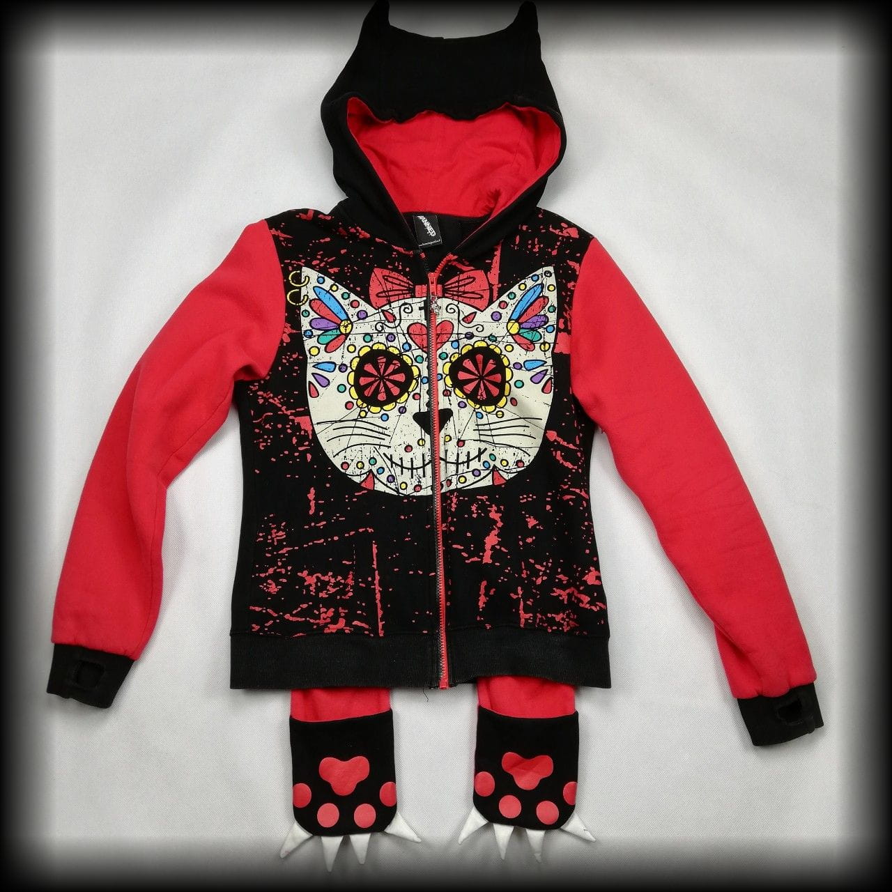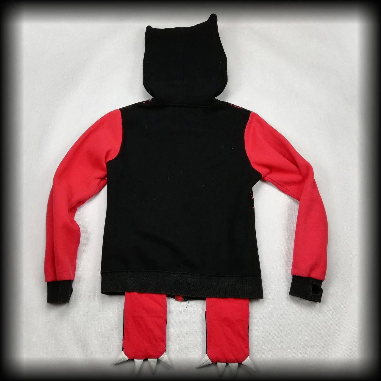 Czarno czerwona bluza z kapturem (uszyty a'la uszka), z dużą kocią czachą na środku, odpinanymi kieszeniami łapkami i otworami na kciuki