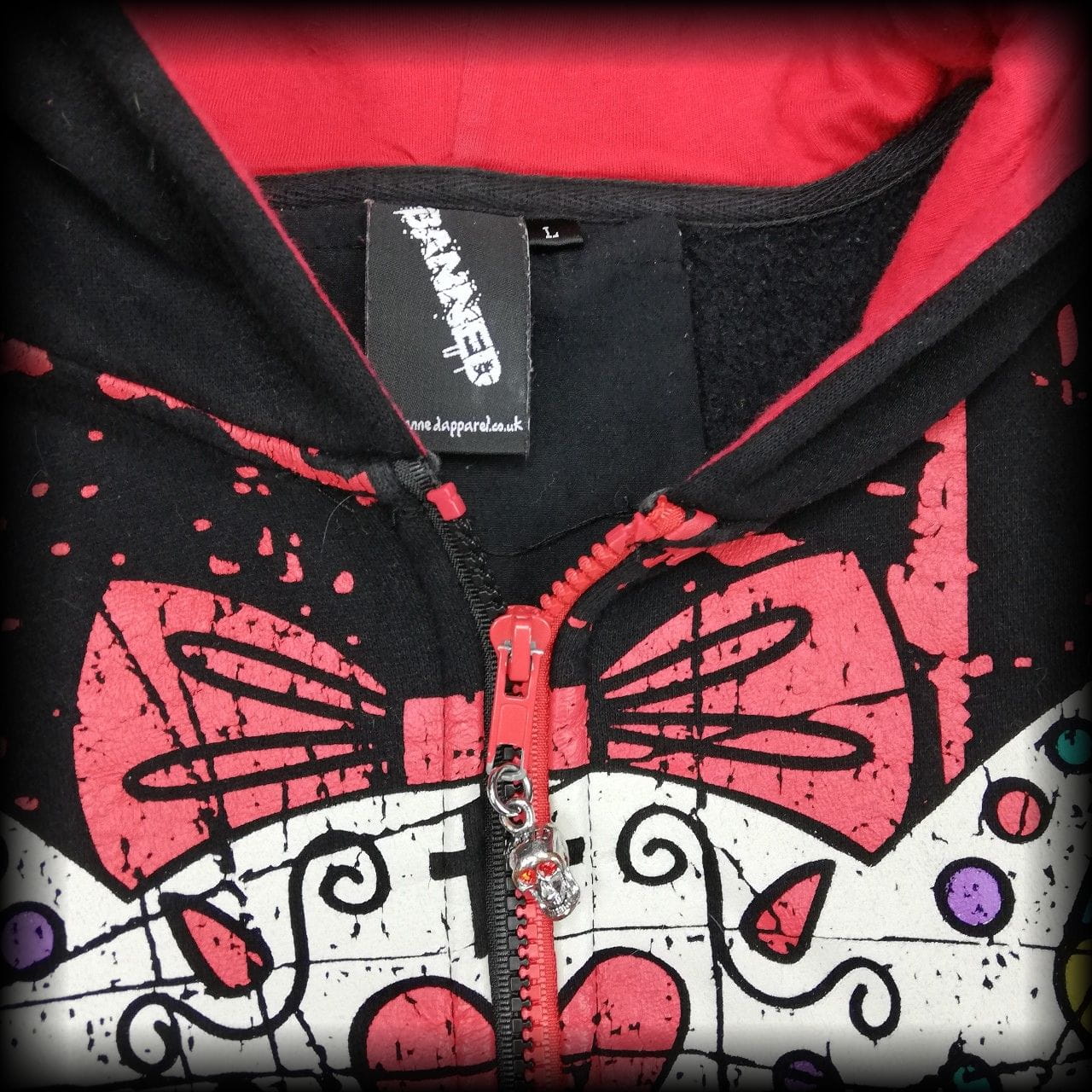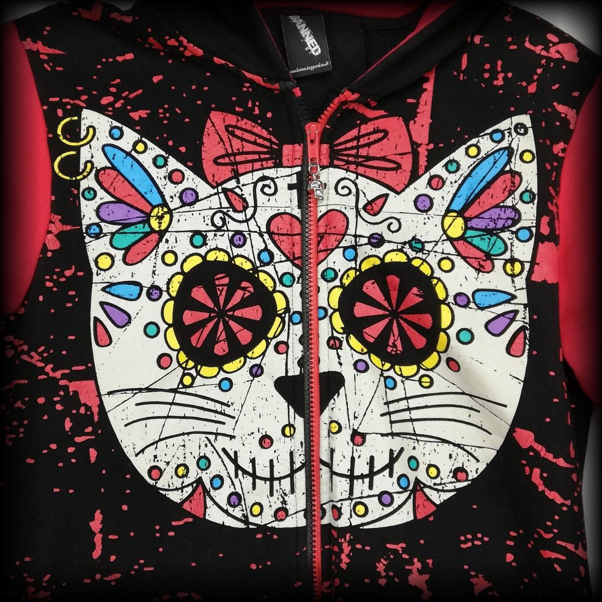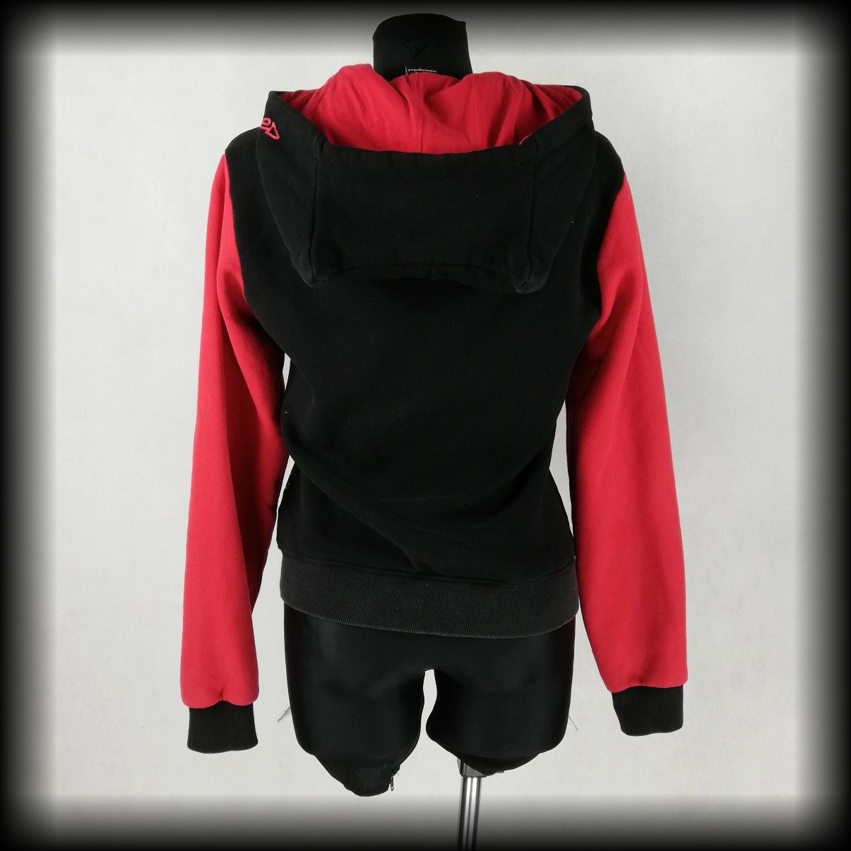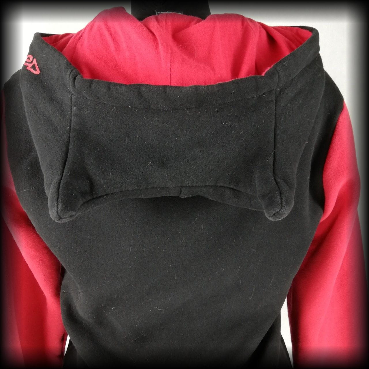 Czarno czerwona bluza z kapturem (uszyty a'la uszka), z dużą kocią czachą na środku, odpinanymi kieszeniami łapkami i otworami na kciuki