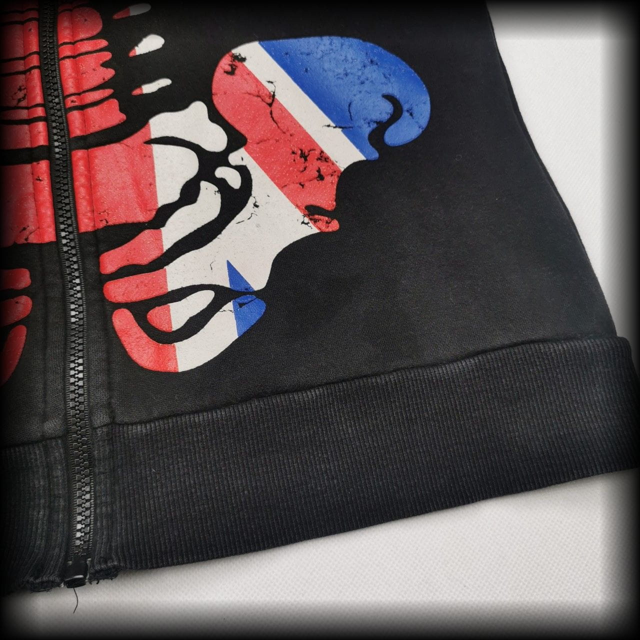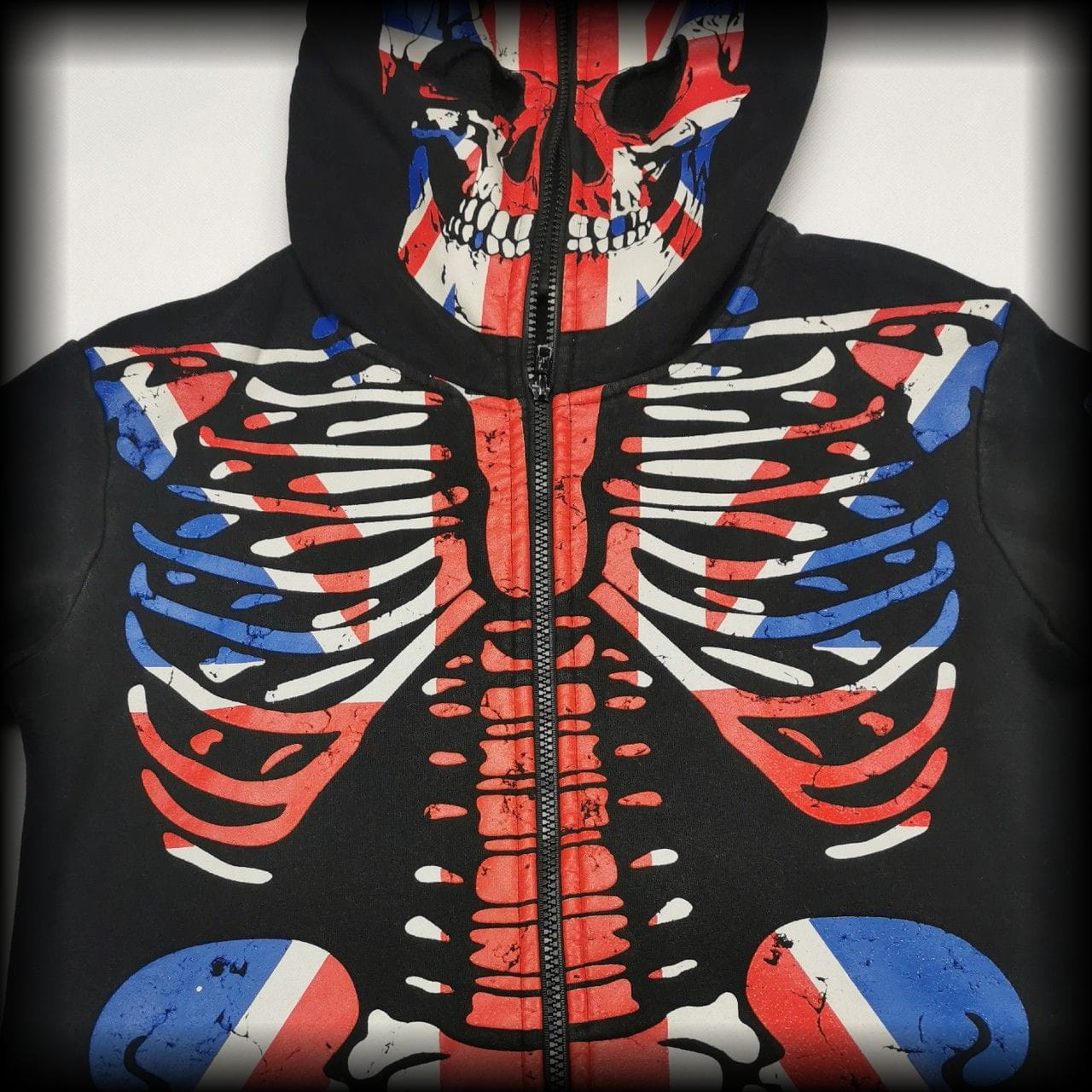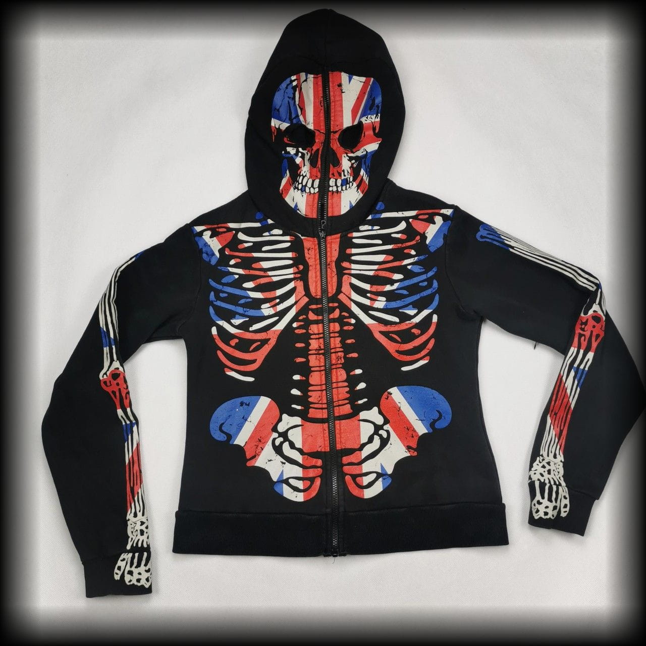 Czarna z czachą i szkieletorem w kolorach flagi angielskiej. Zamek zapina się również na twarzy - ma otwory na oczy