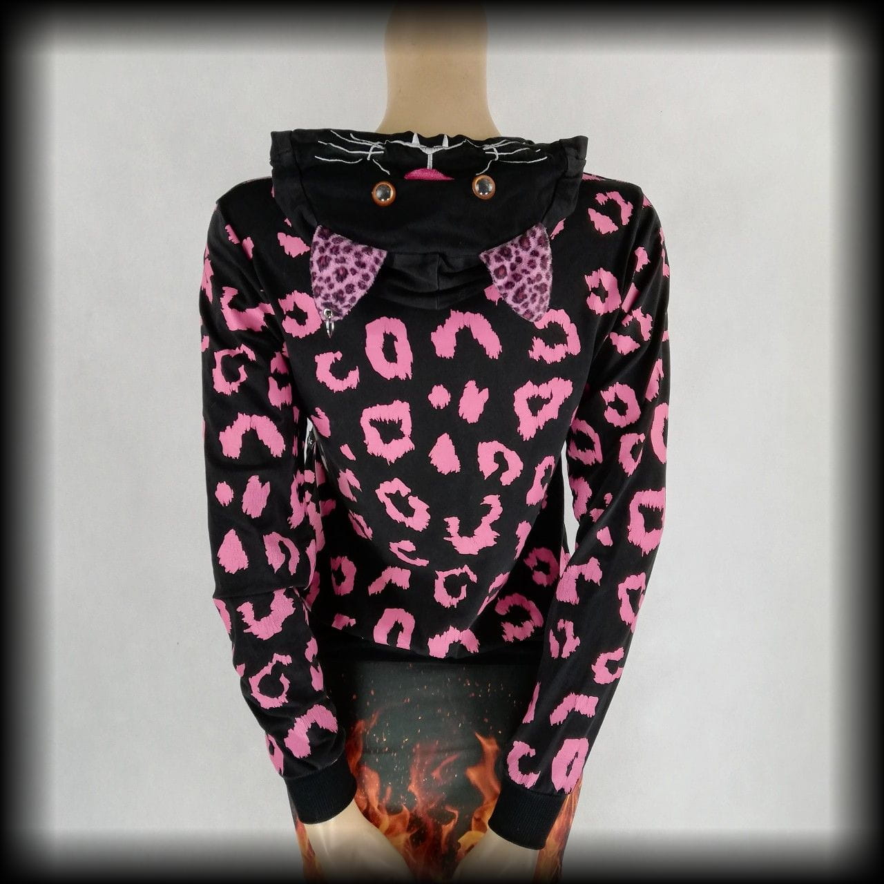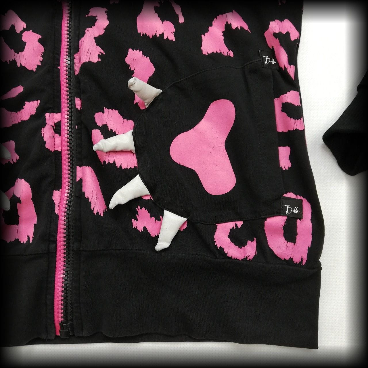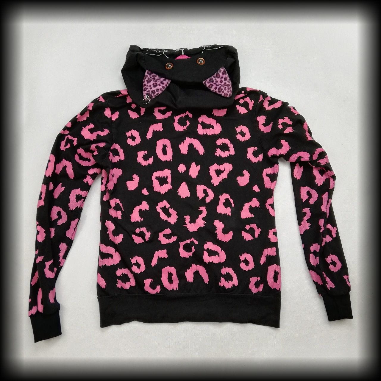 Czarna cienka bluza w różową panterkę. Z głową i łapkami misia