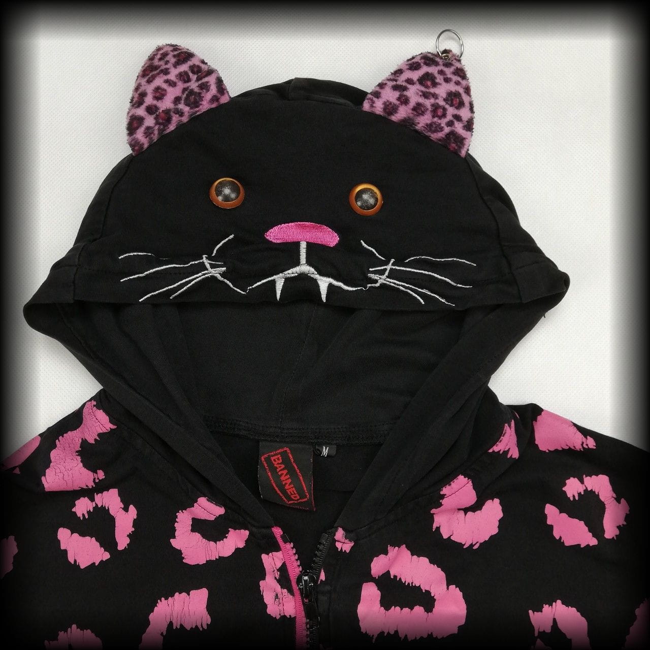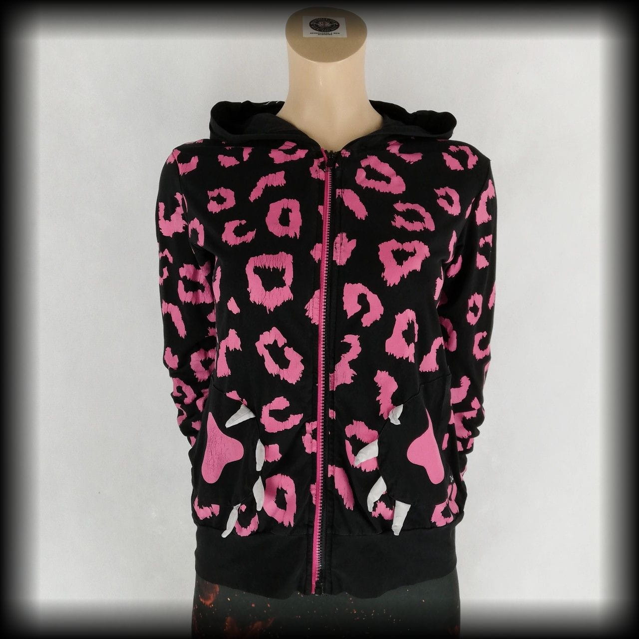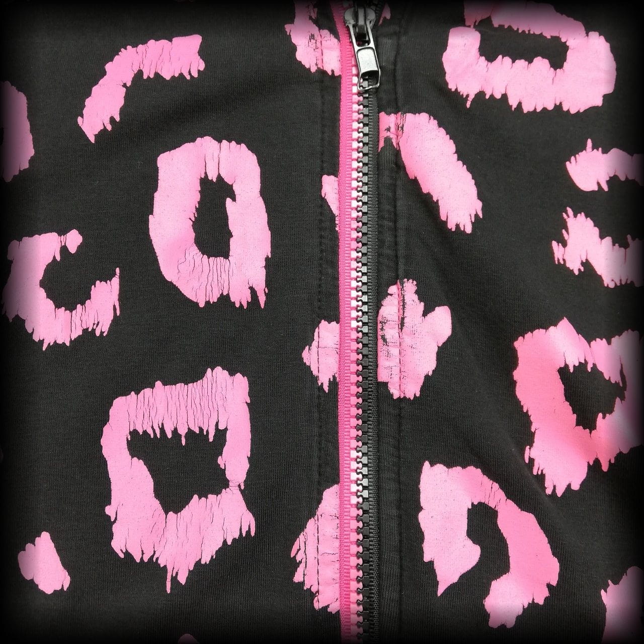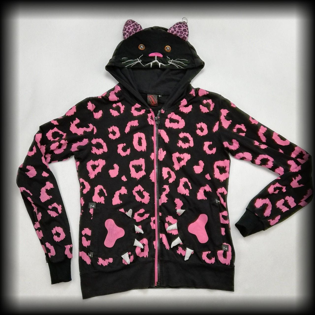 Czarna cienka bluza w różową panterkę. Z głową i łapkami misia