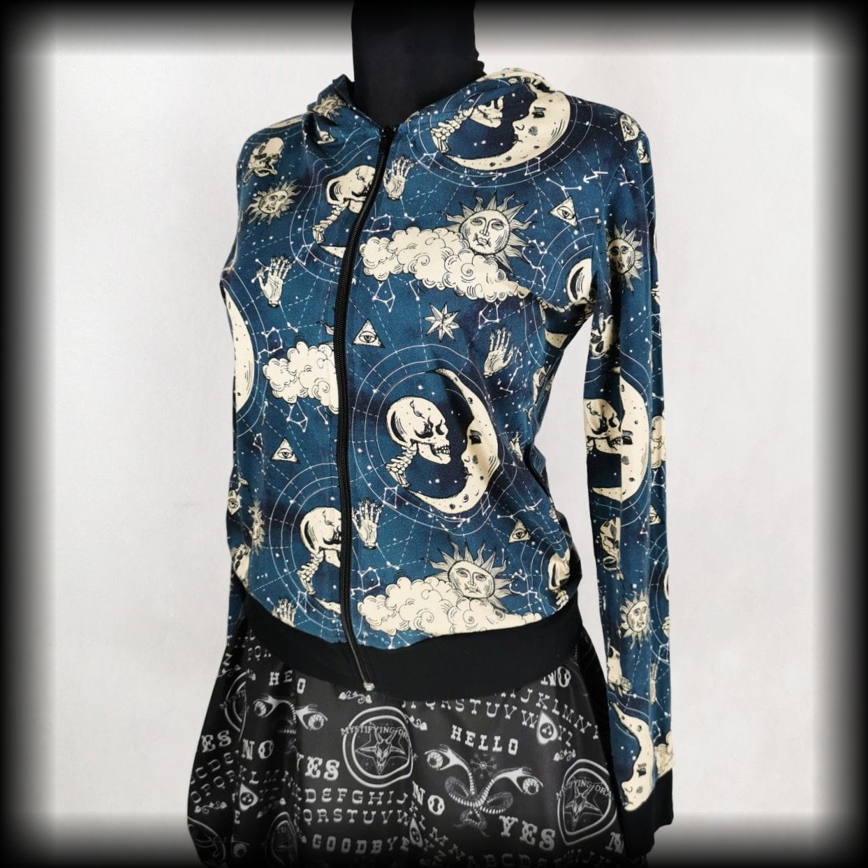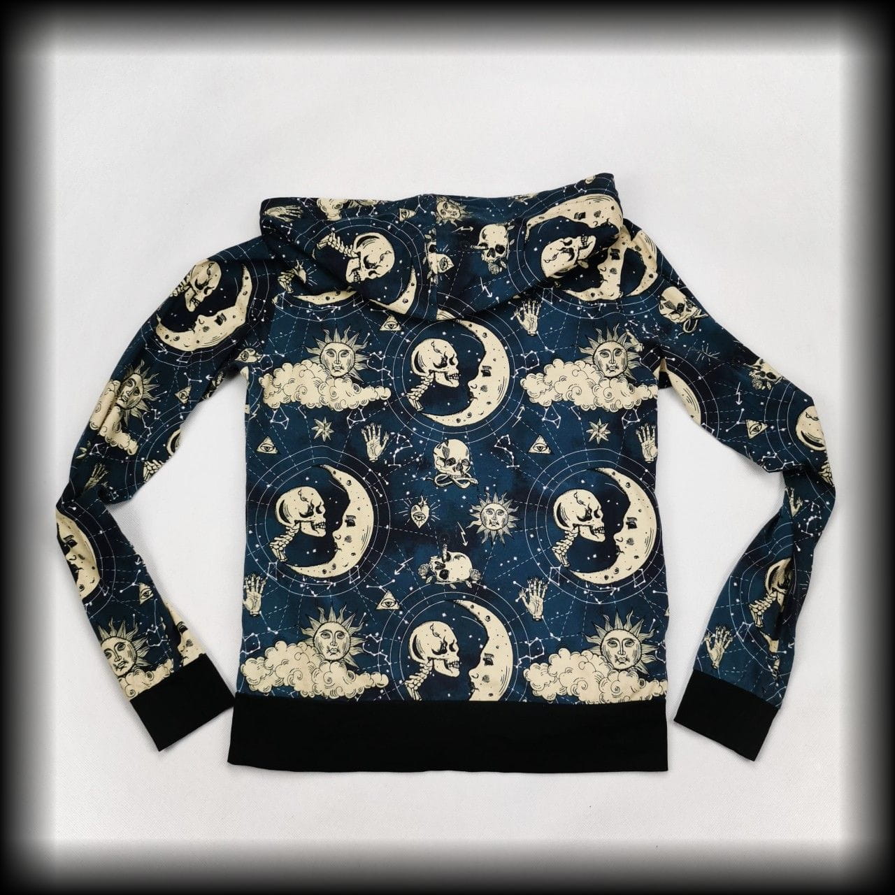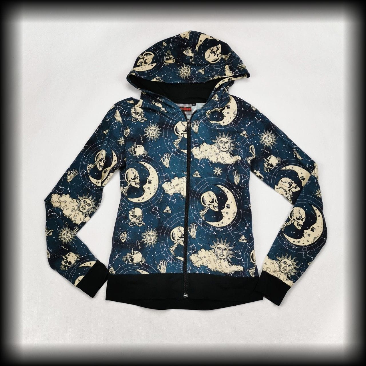 Damska cienka bluza z kapturem w astronomiczny wzór, m.in. czachy, księżyc, słońce. Rozpinana, z kapturem