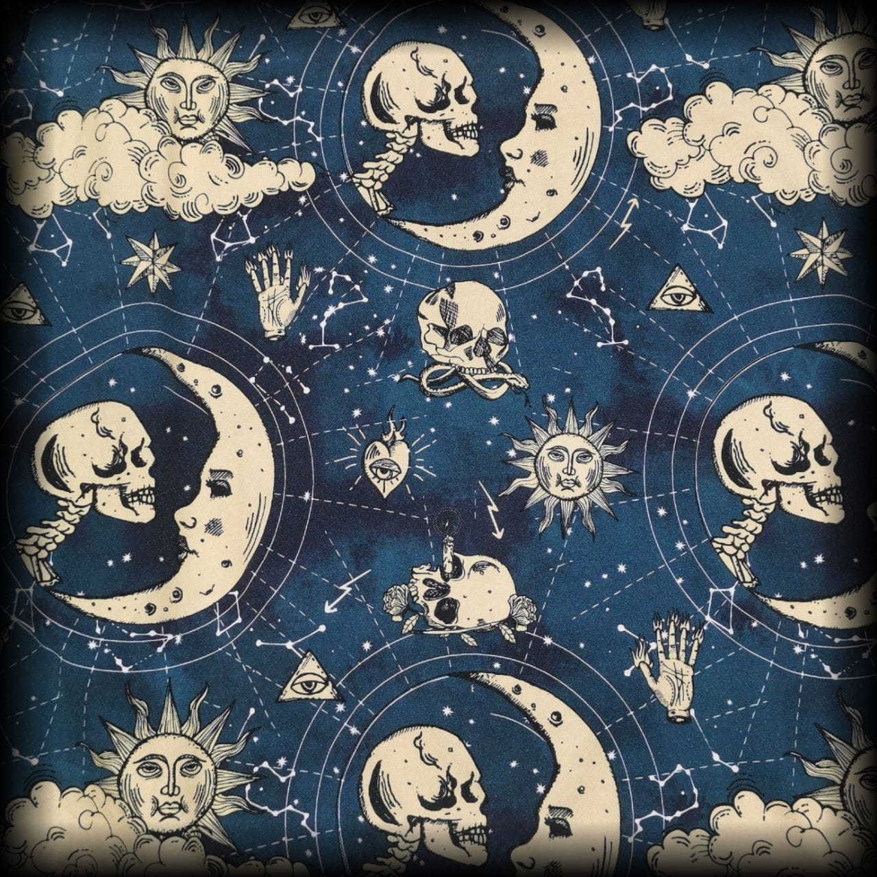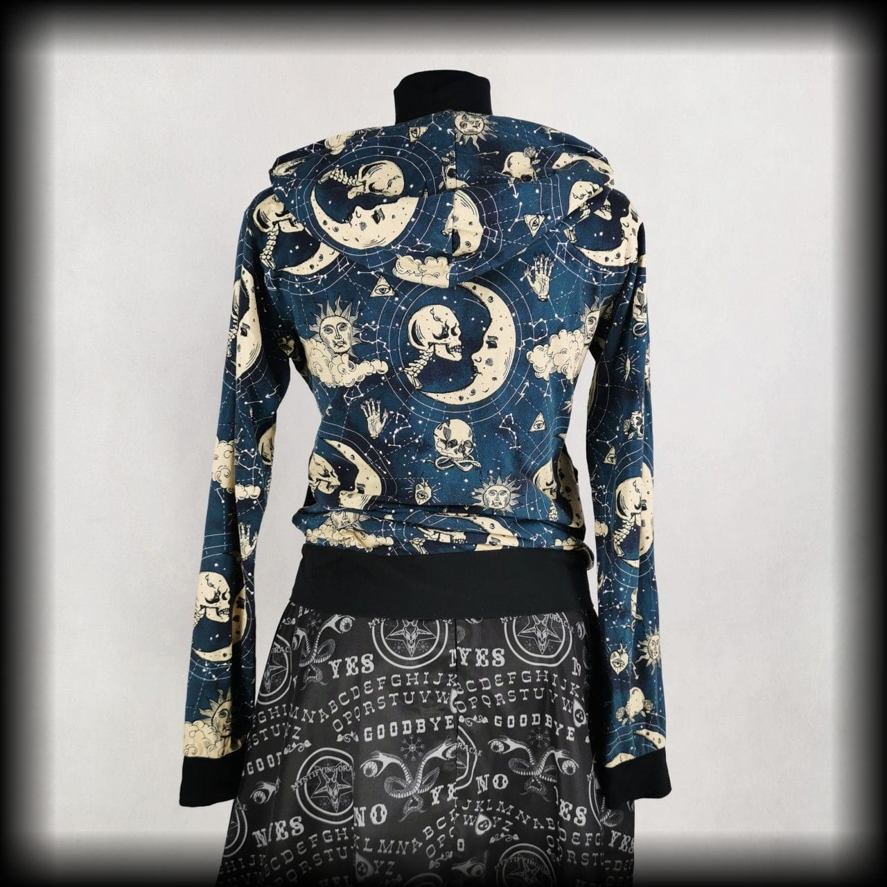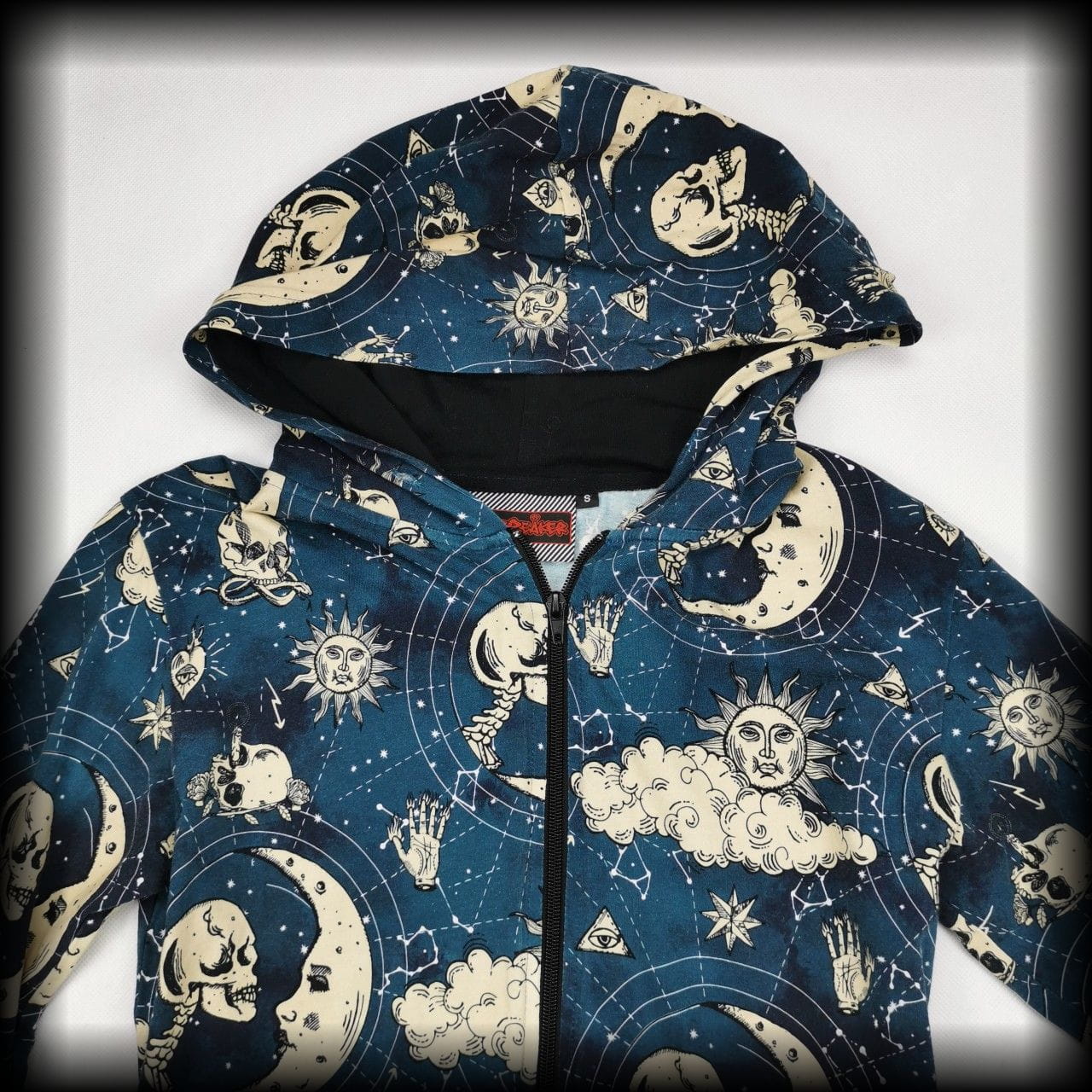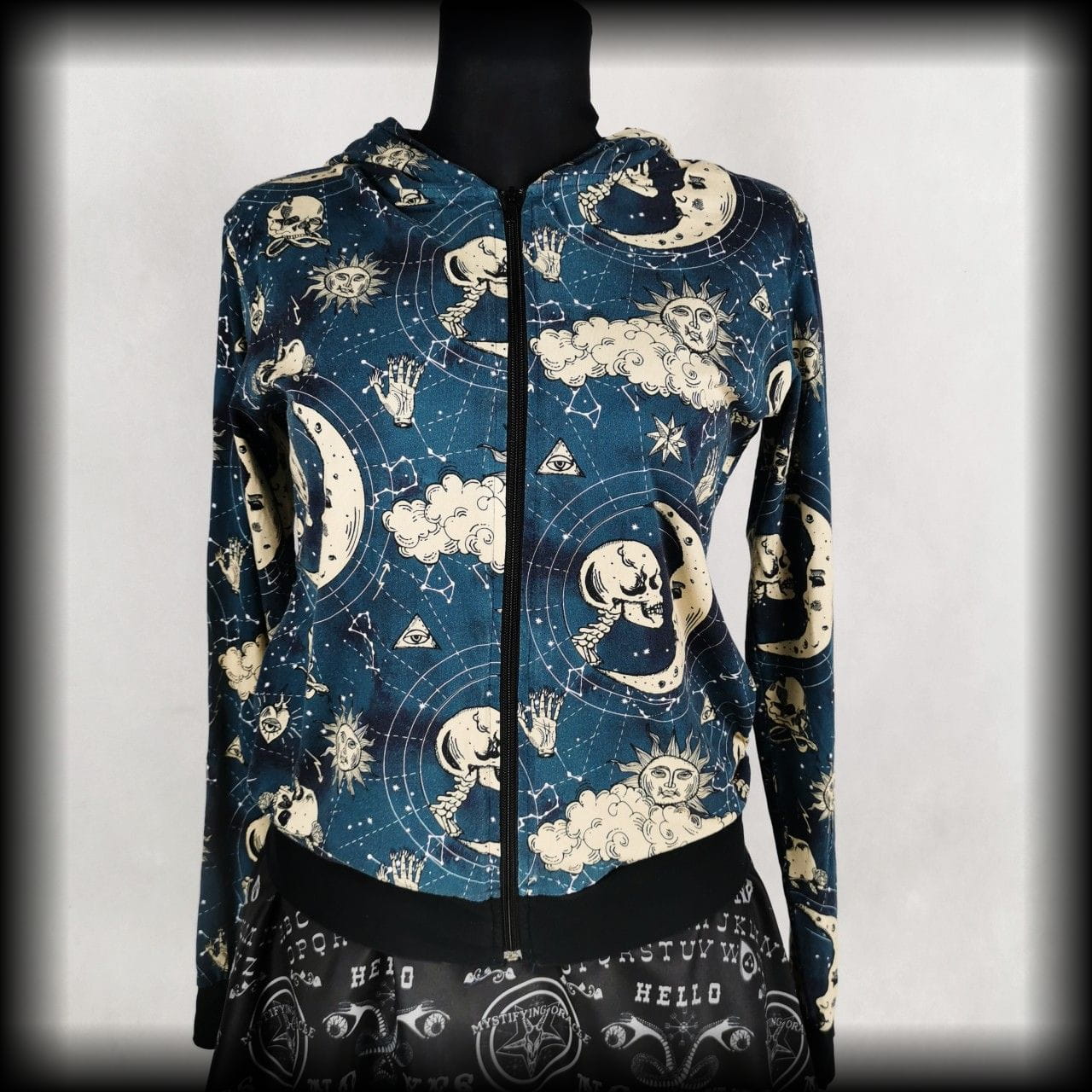 Damska cienka bluza z kapturem w astronomiczny wzór, m.in. czachy, księżyc, słońce. Rozpinana, z kapturem