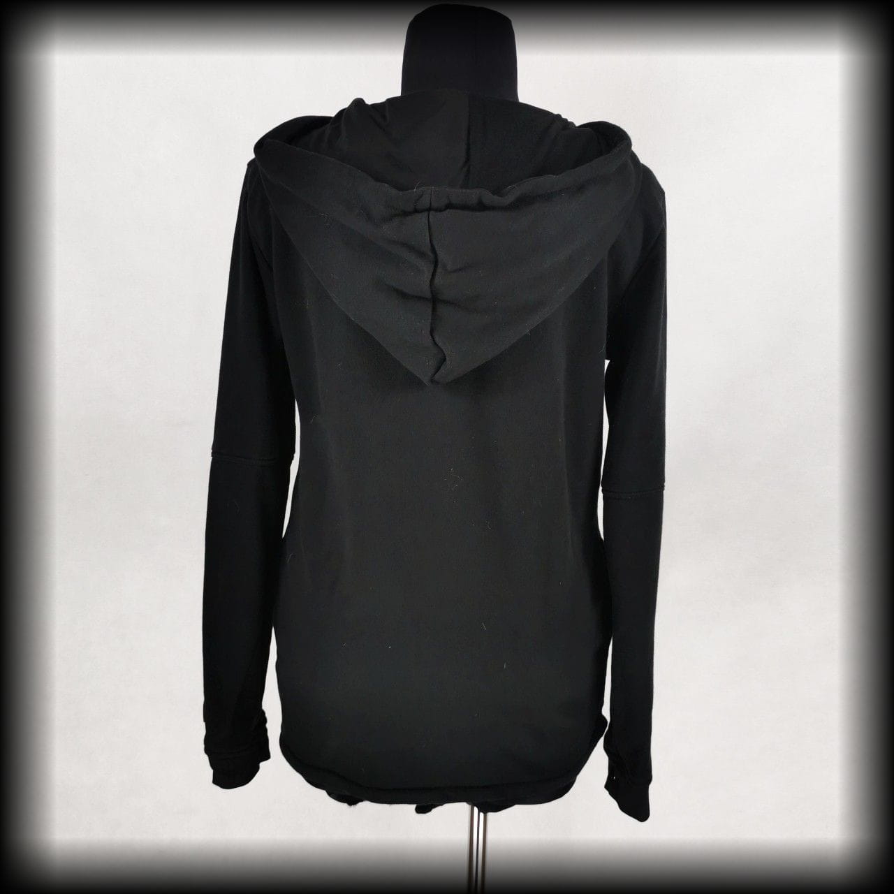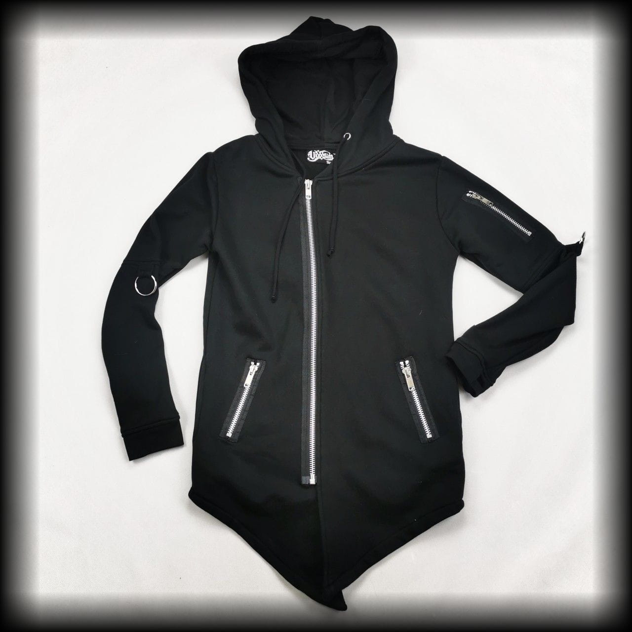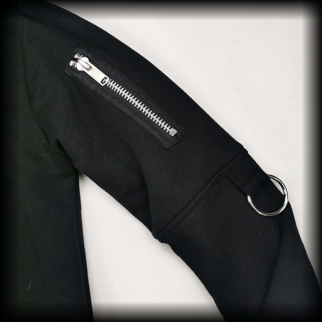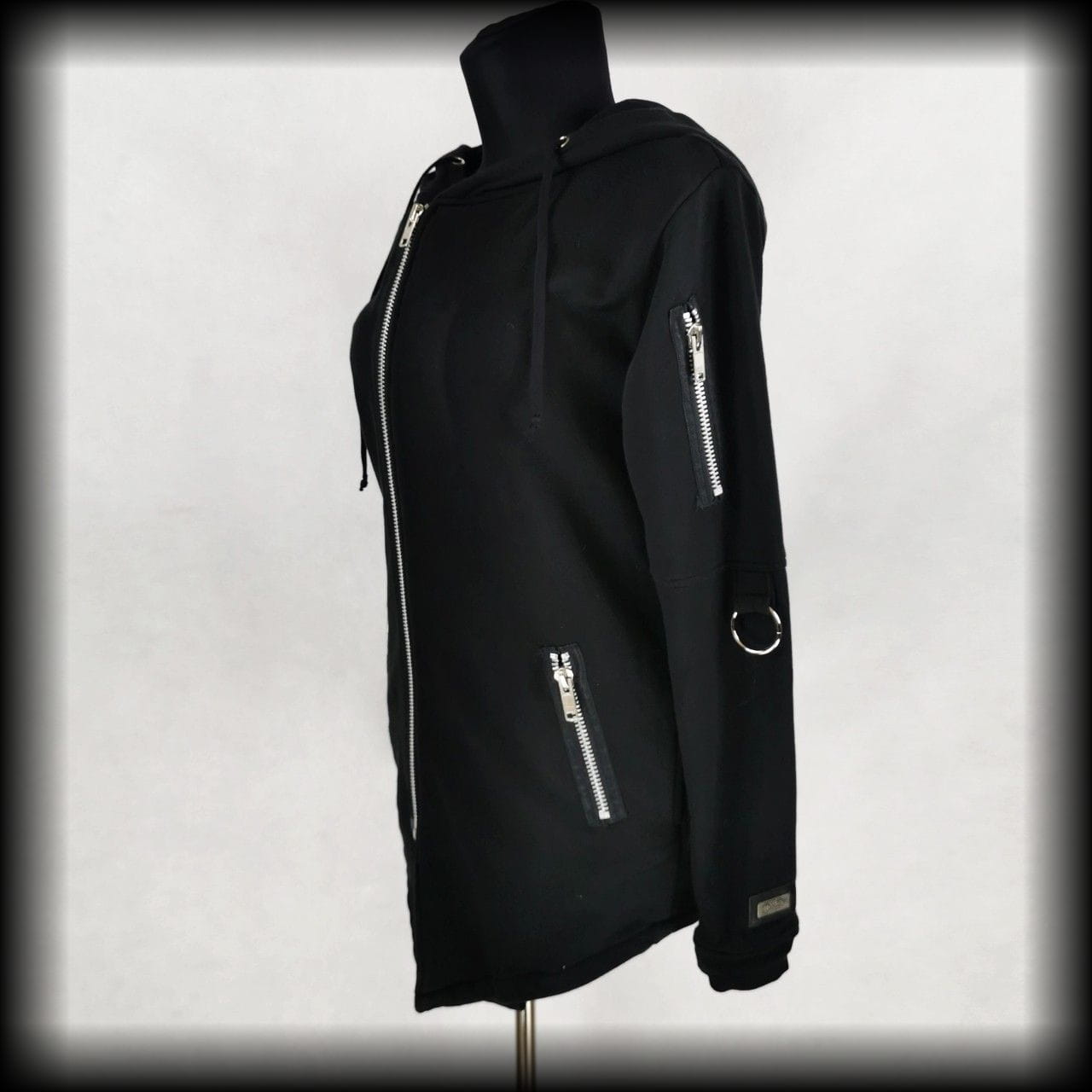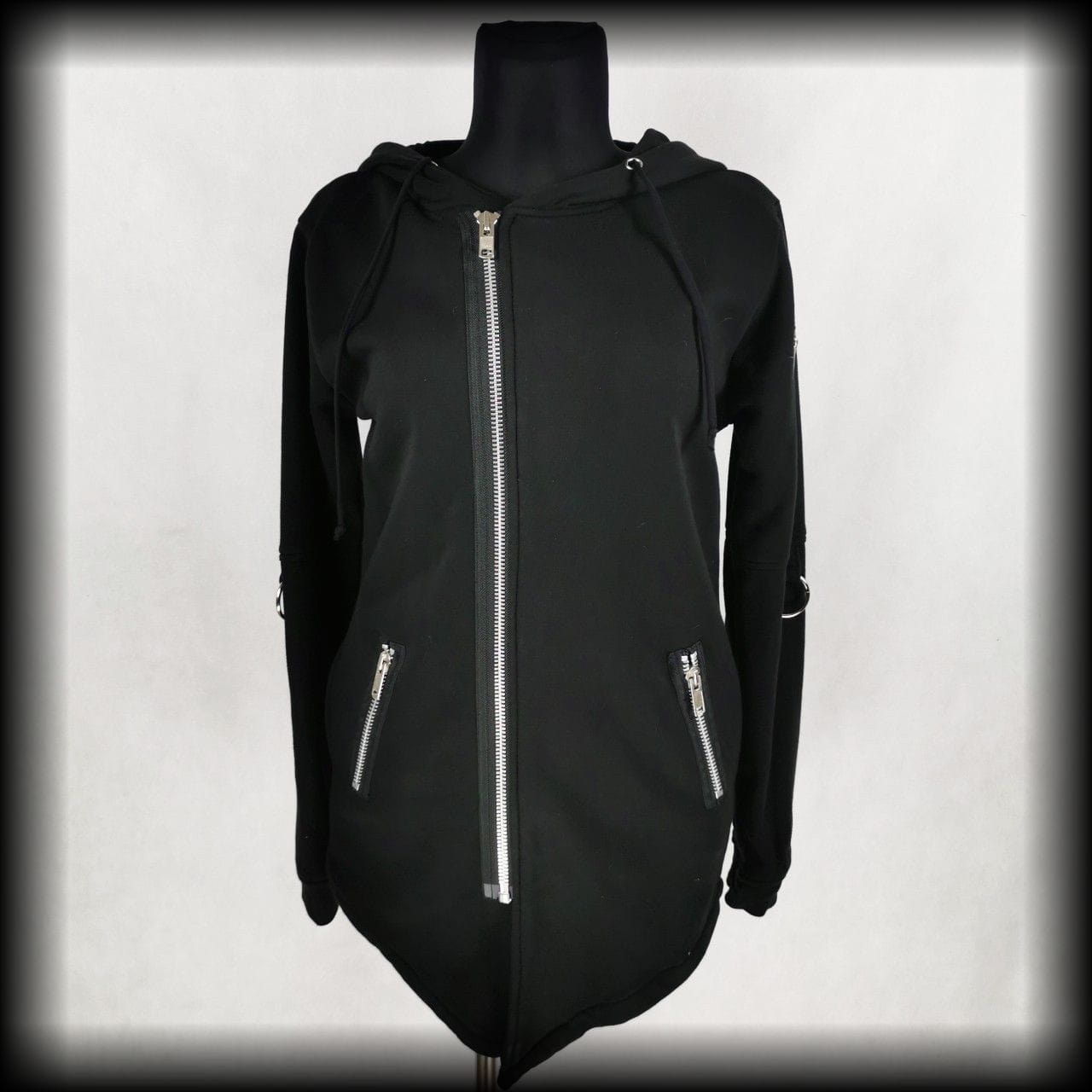 Czarna długa bluza z kapturem. Ozdobiona zamkami i O-ringami