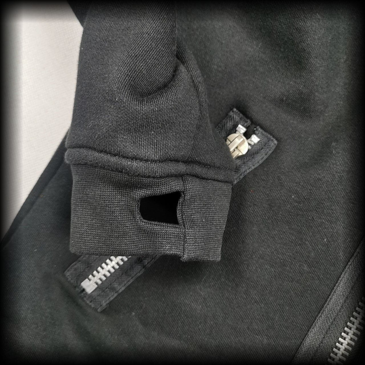 Obszerny kaptur i otwory na kciuki w rękawach