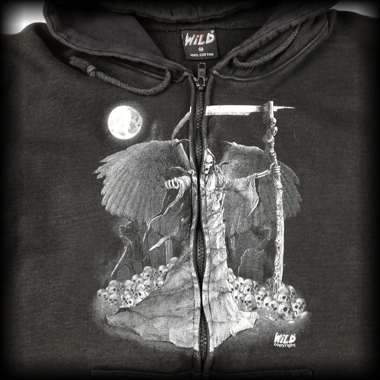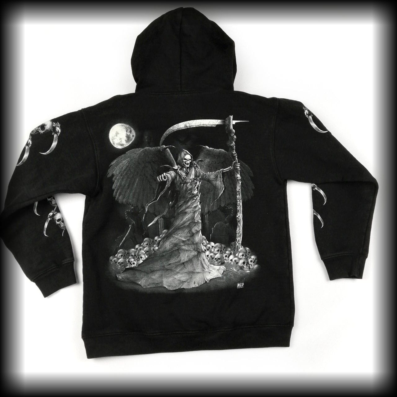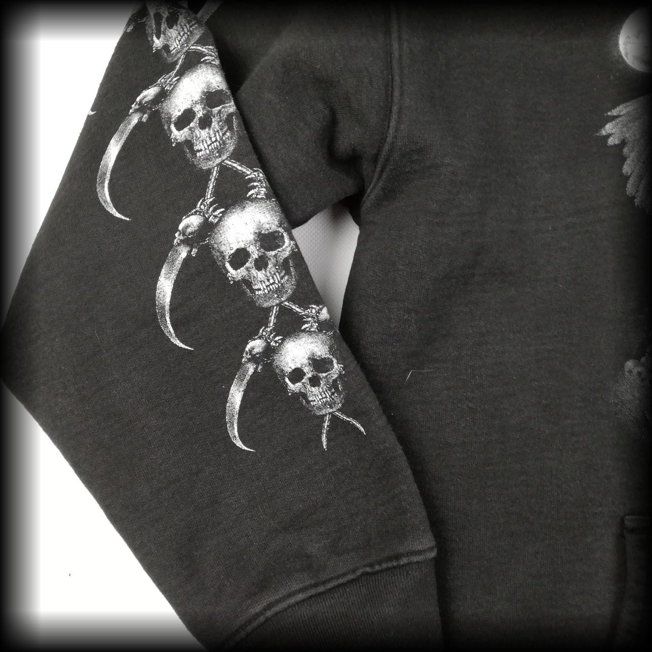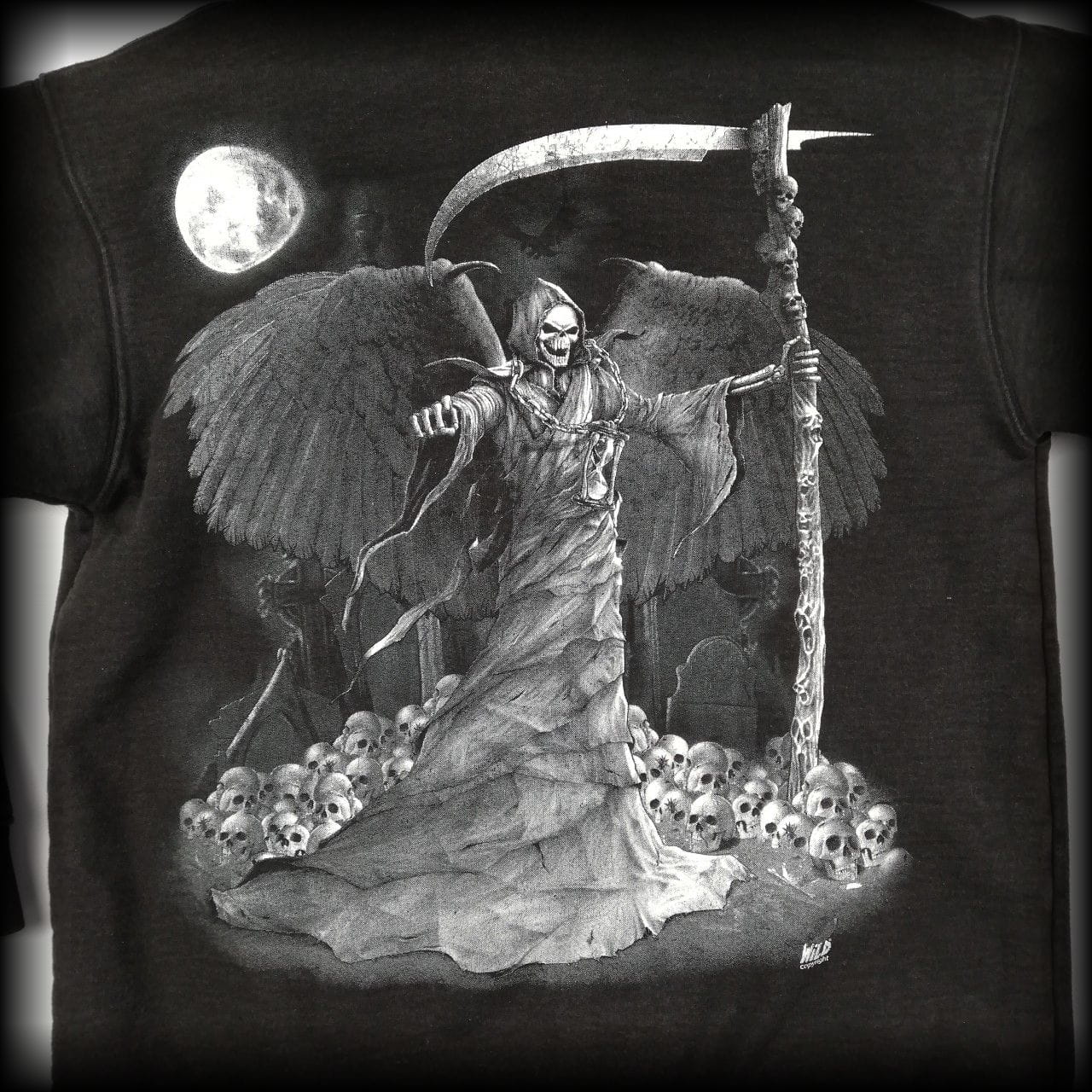 Anioł śmierci i czaszki. Na rękawach również czaszki