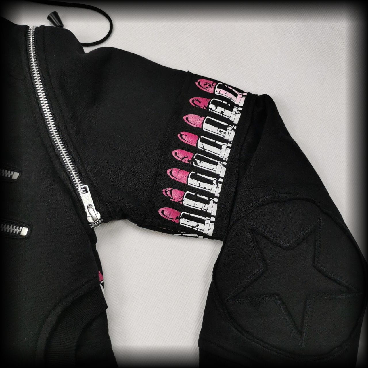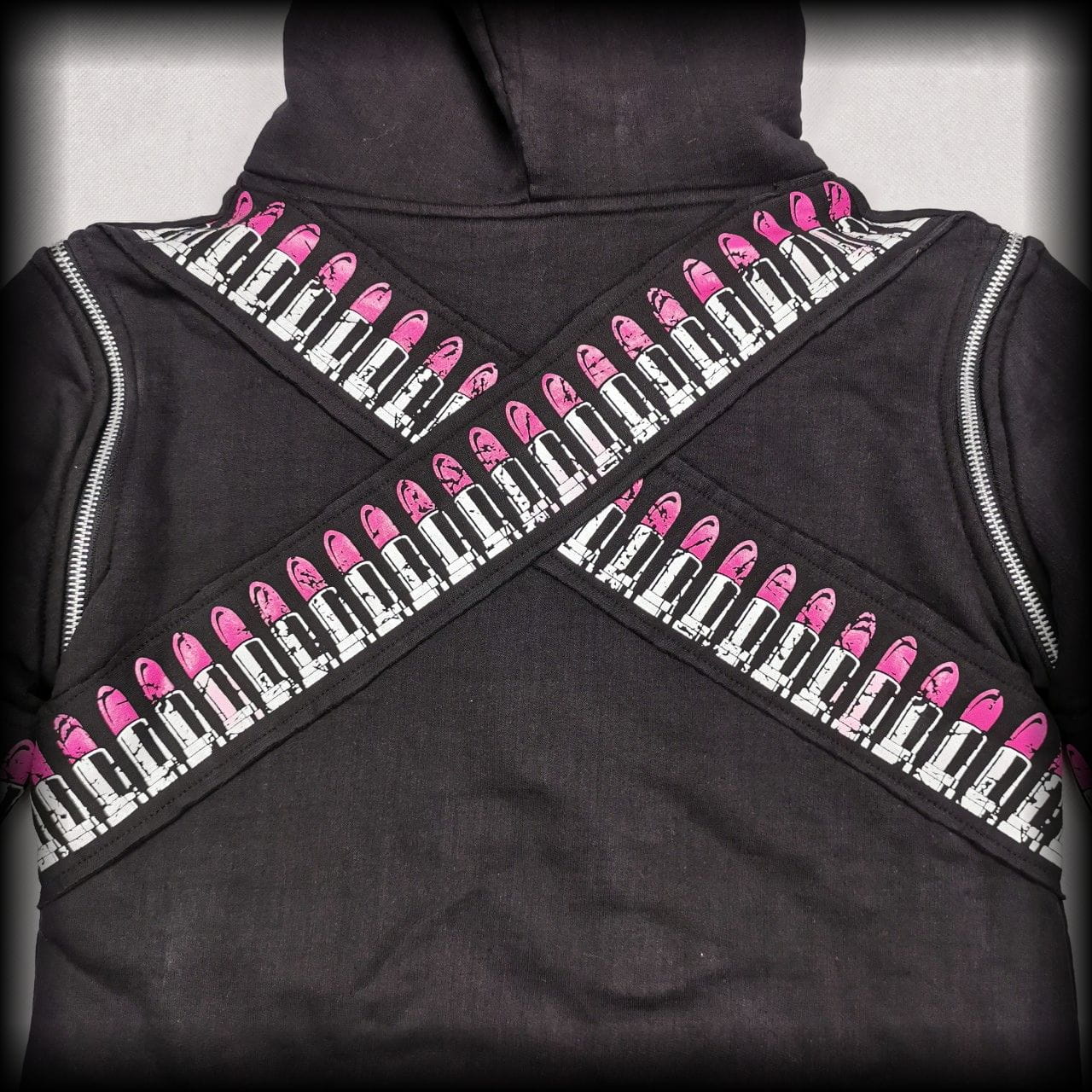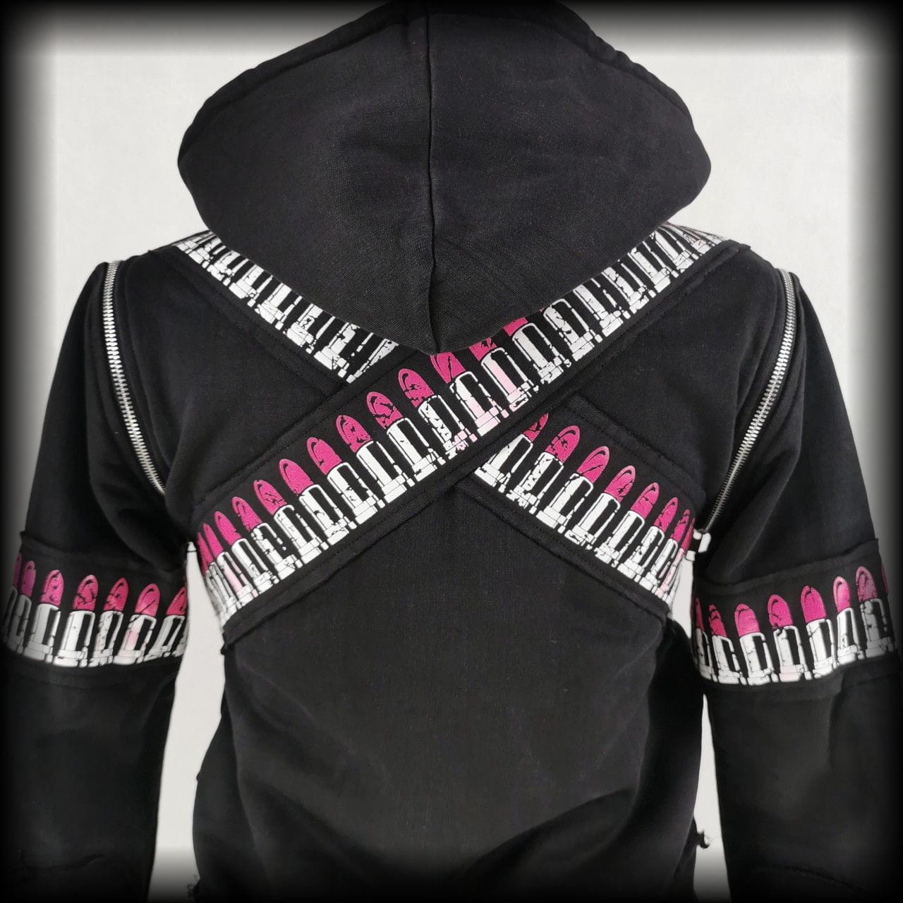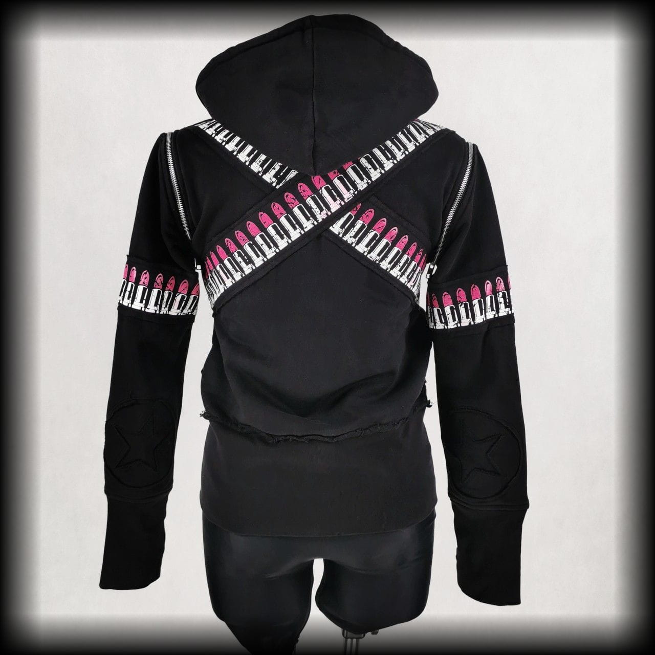 Czarna bluza, która może być kamizelką. Obszyta pasami z pomadkami
