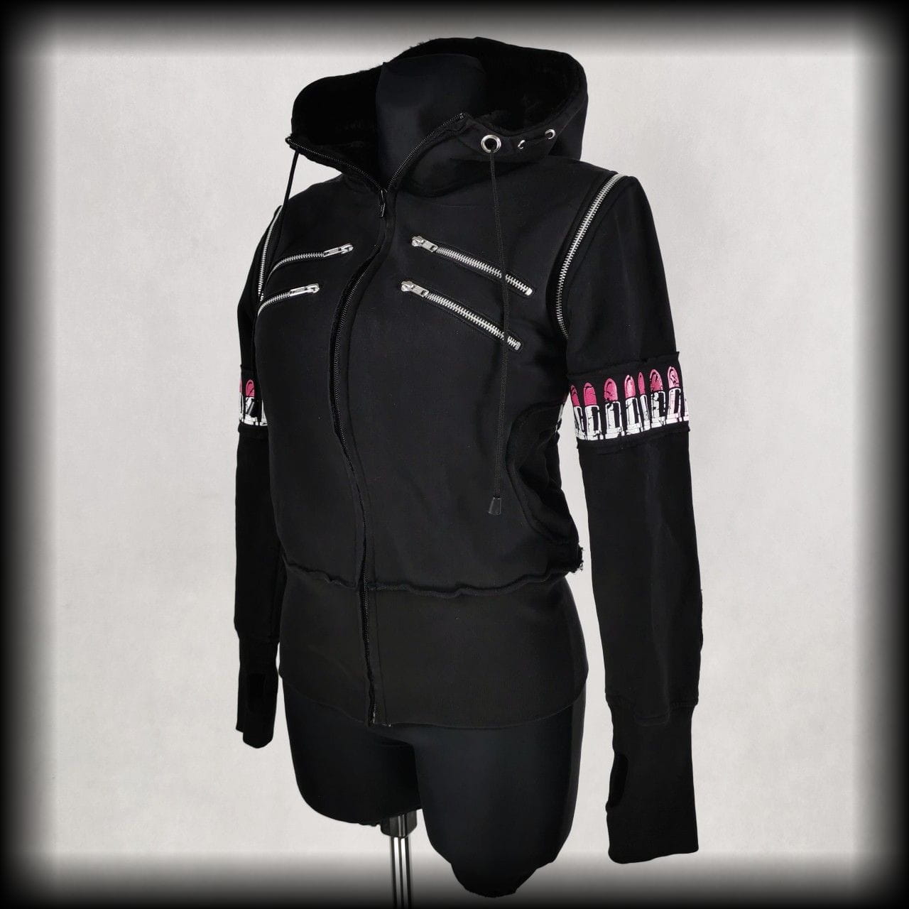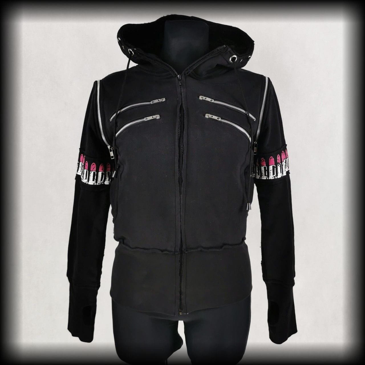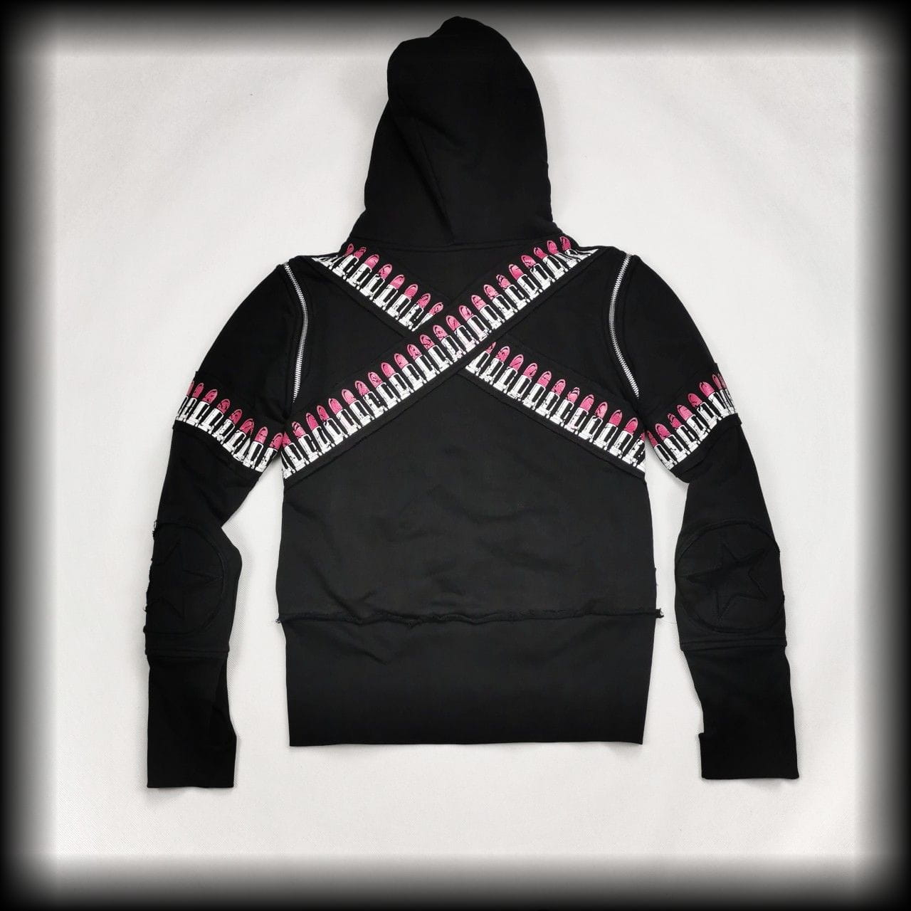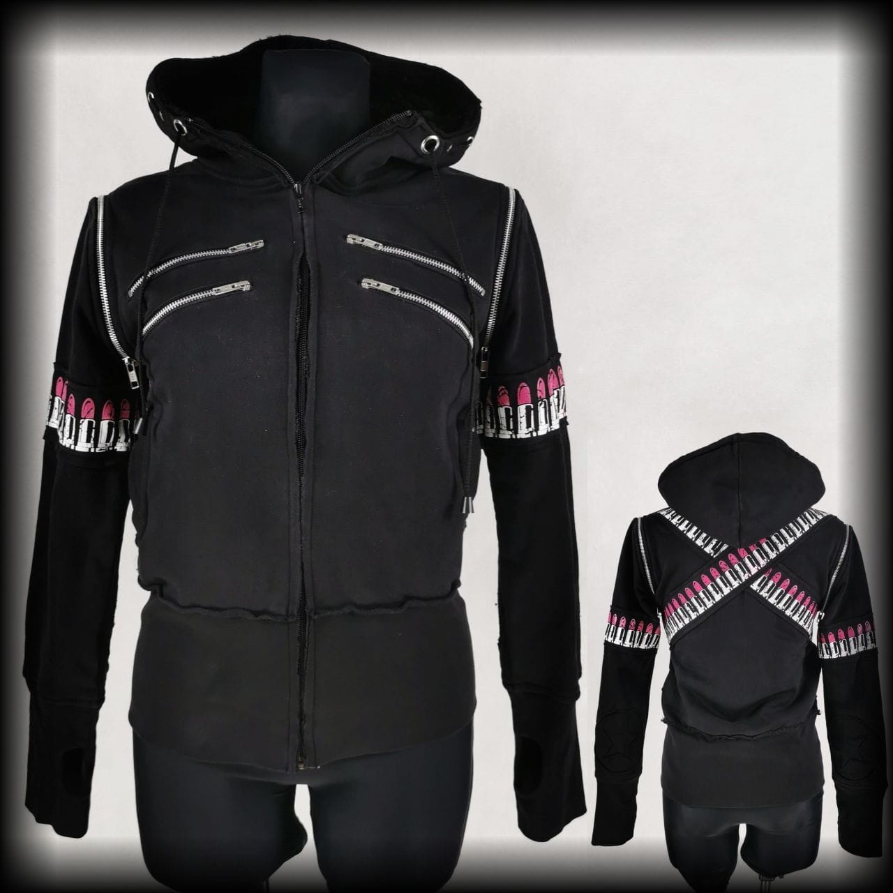 Czarna bluza, która może być kamizelką. Obszyta pasami z pomadkami