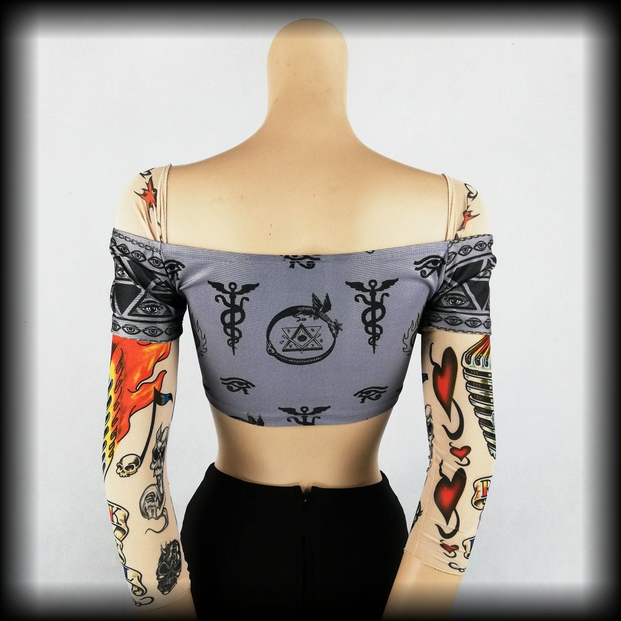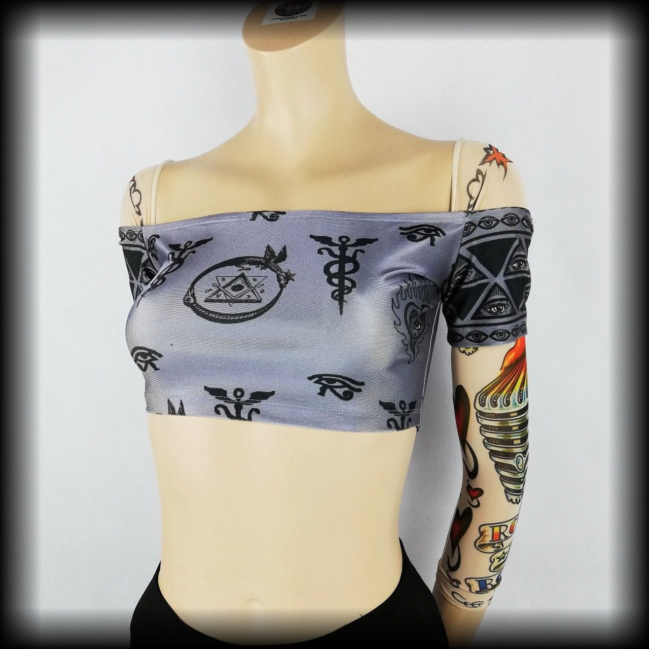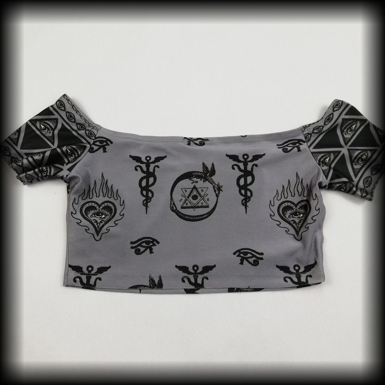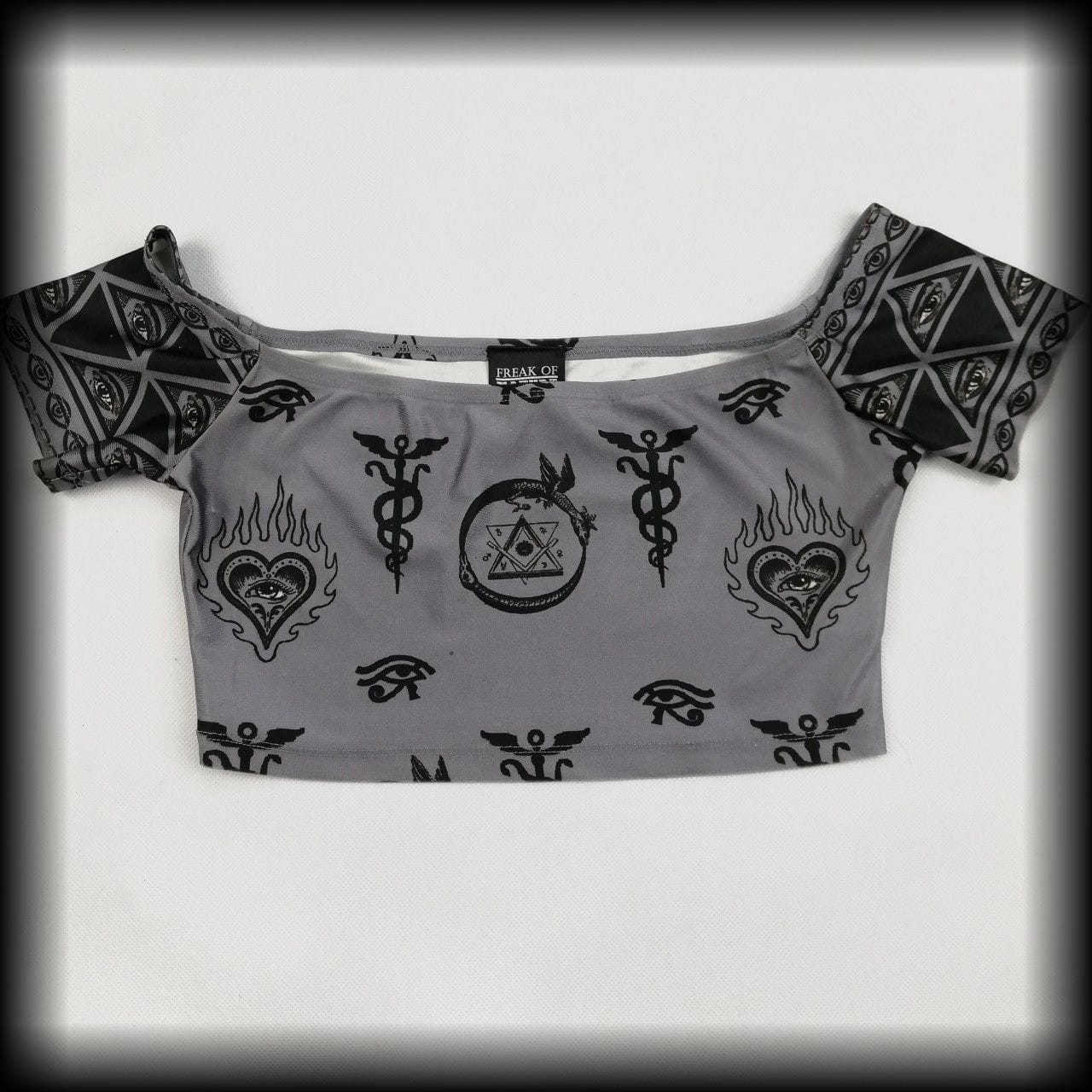 Szara bluzka typu crop top z krótkimi rękawkami w okultystyczne wzory