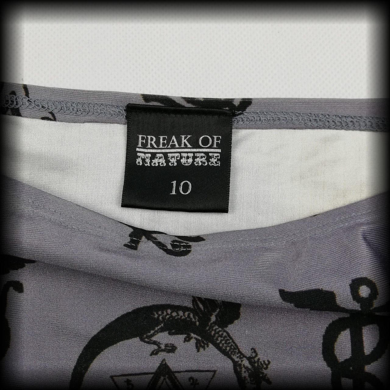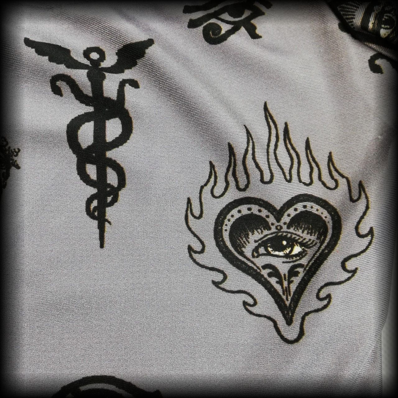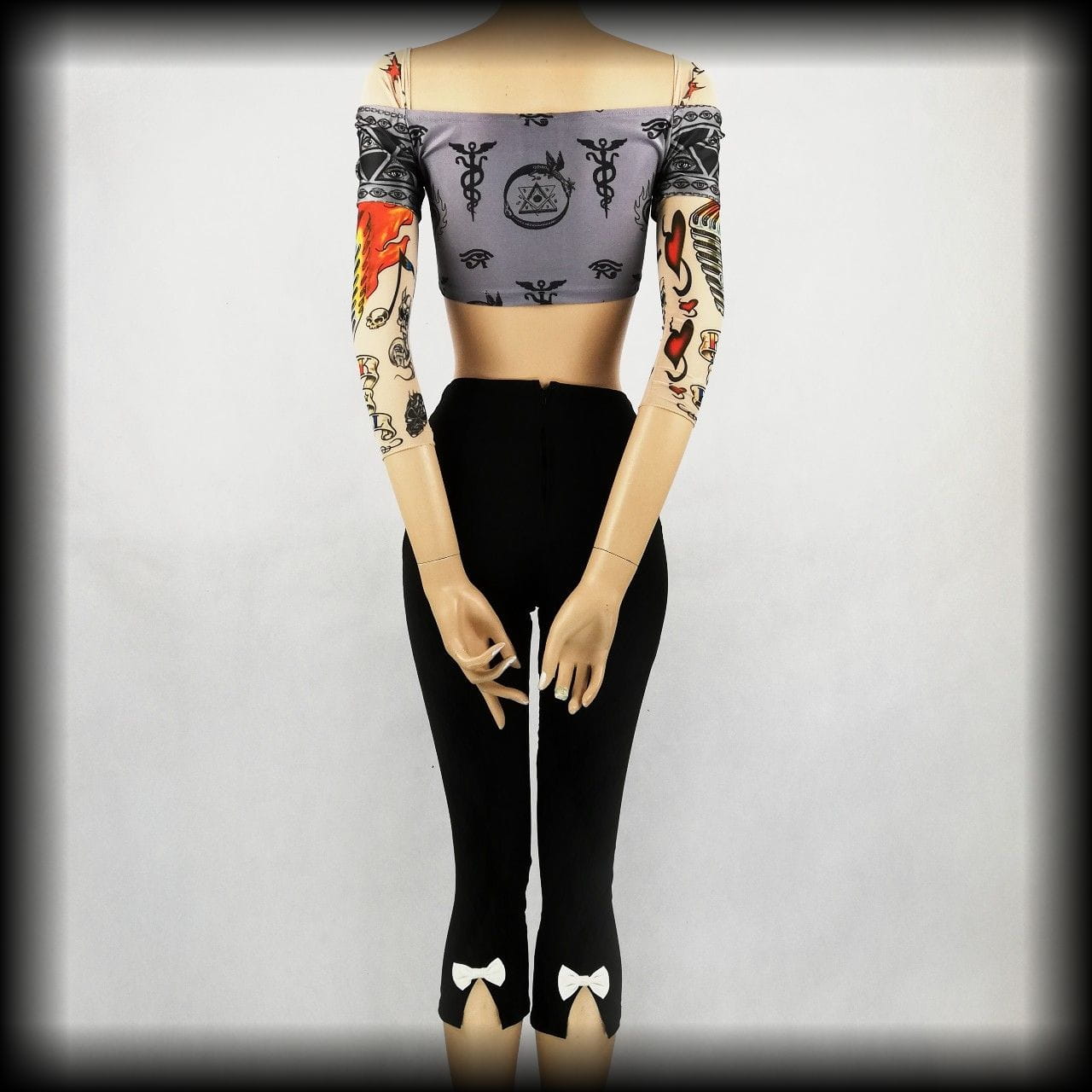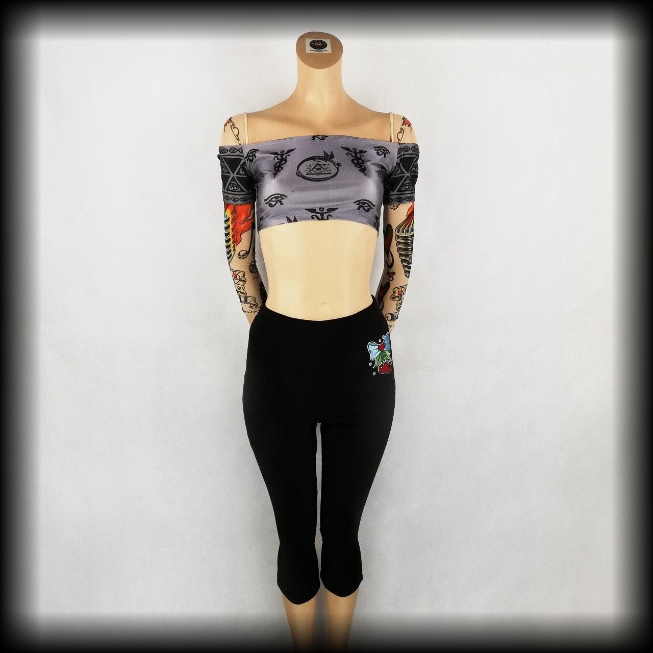 Szara bluzka typu crop top z krótkimi rękawkami w okultystyczne wzory