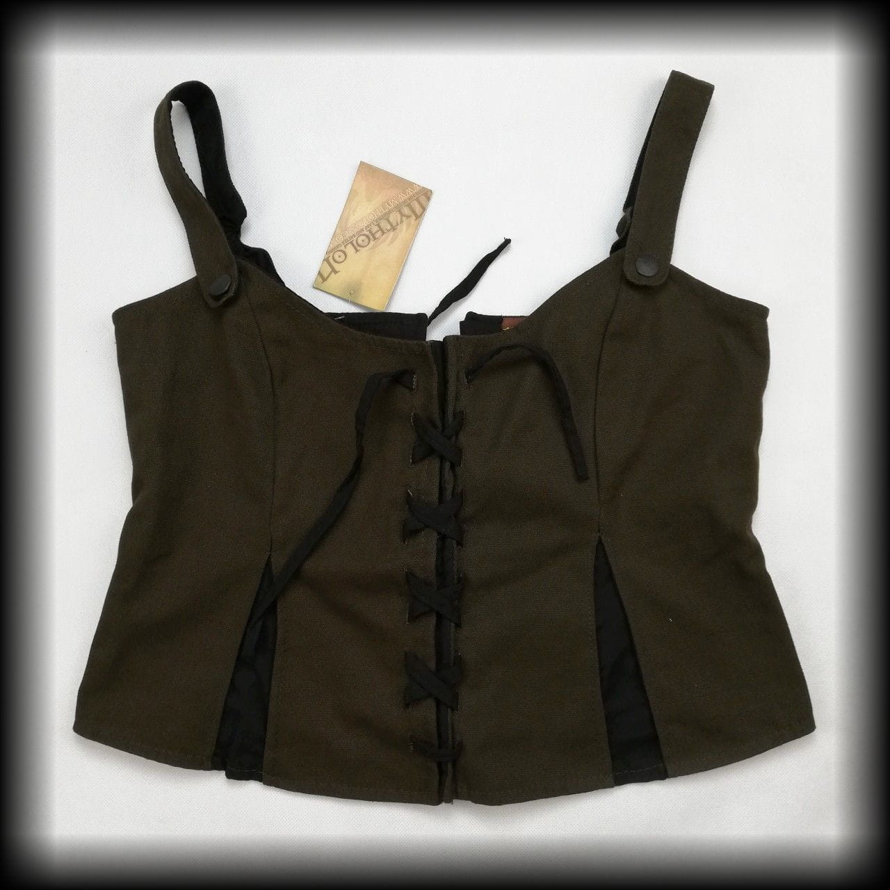 Brązowa bluzka na ramiączkach. Z przodu i z tyłu wiązana jak gorset