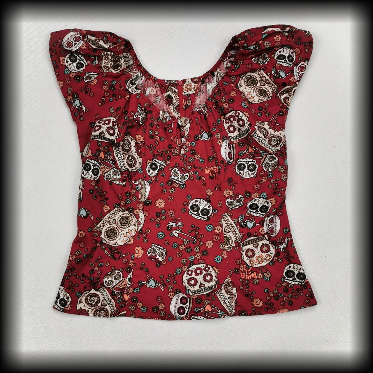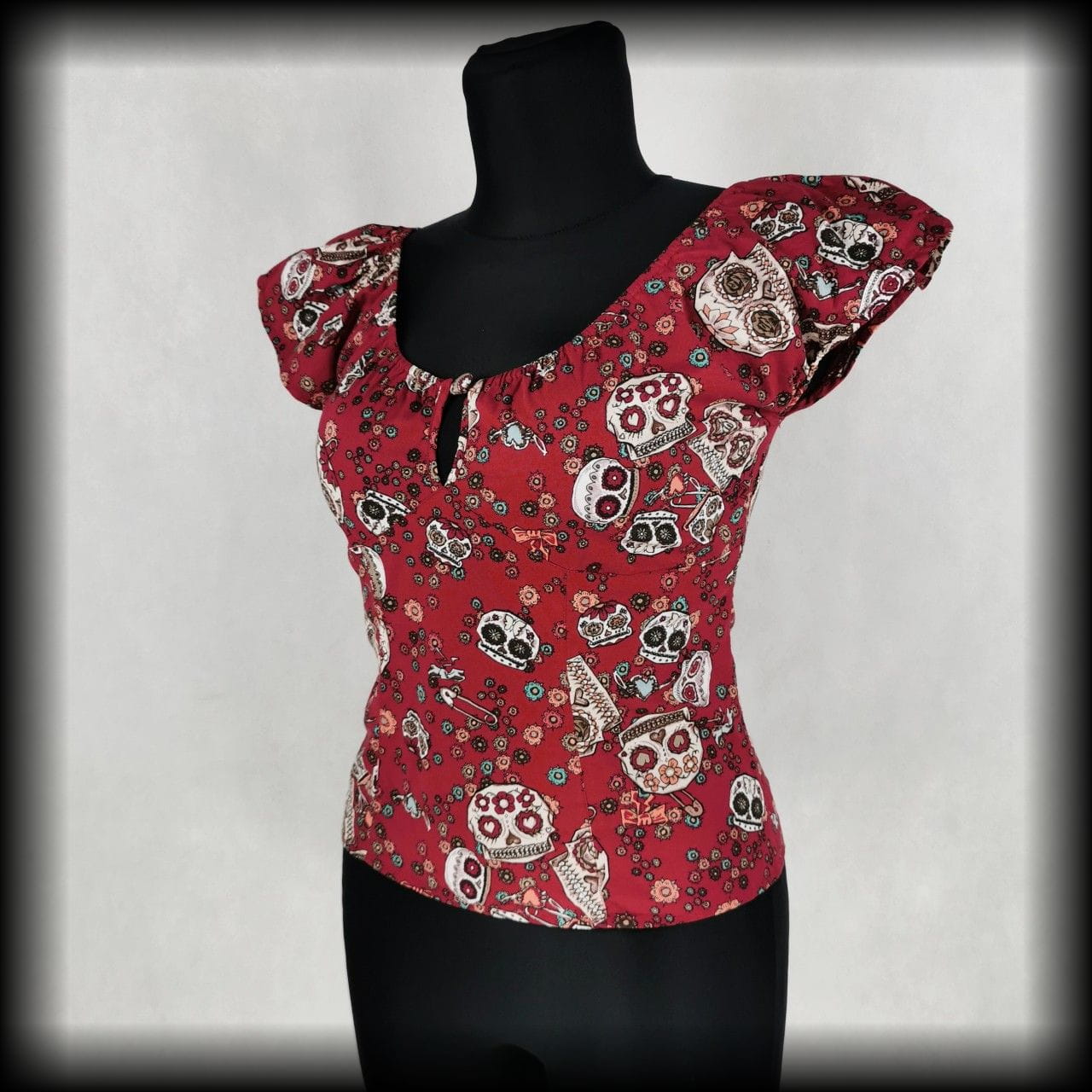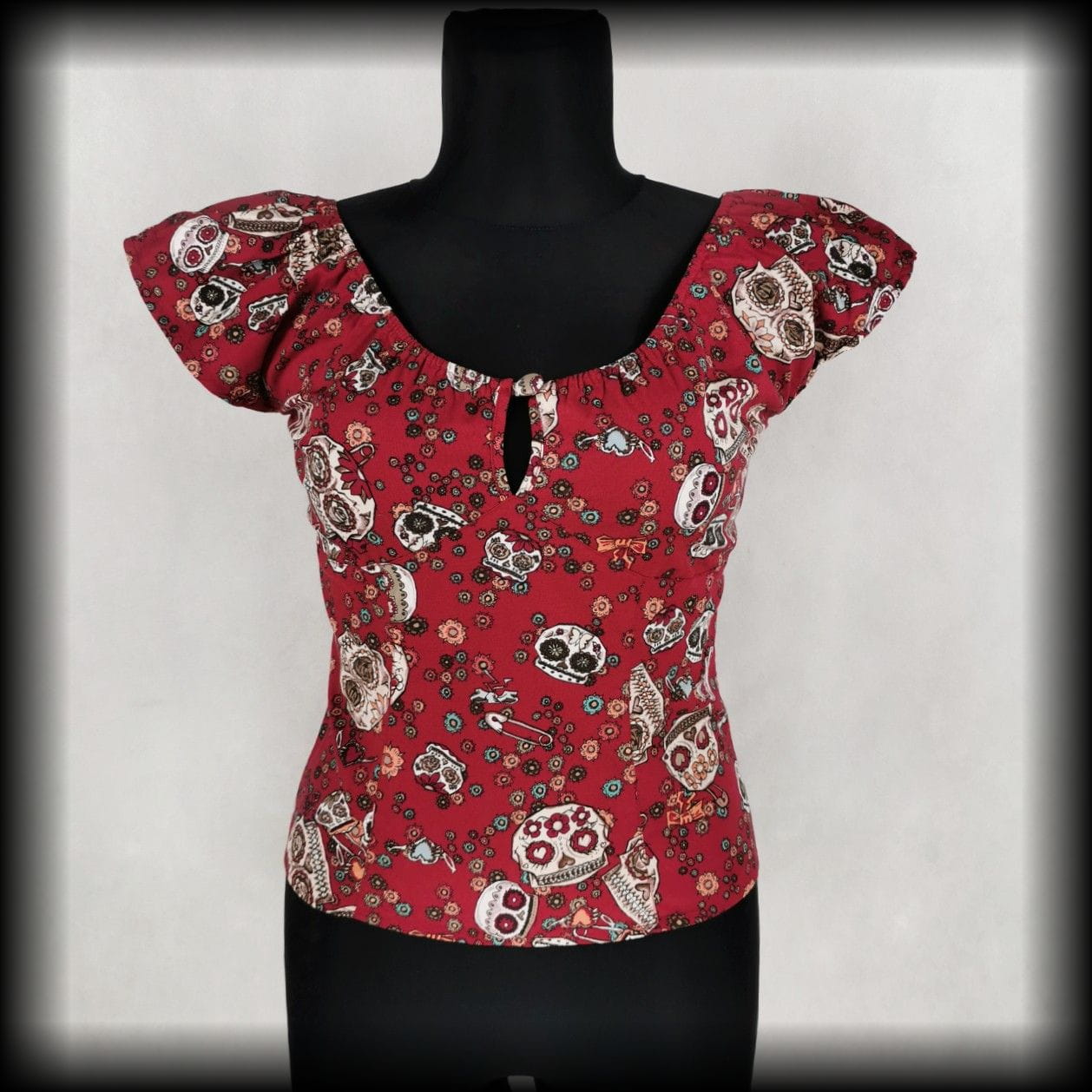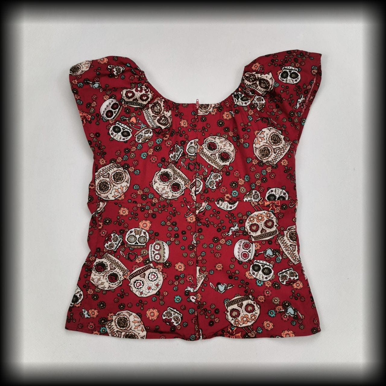 Czerwona bluzka z krótkim rękawkiem w meksykańskie czaszki, kwiaty i agrafki