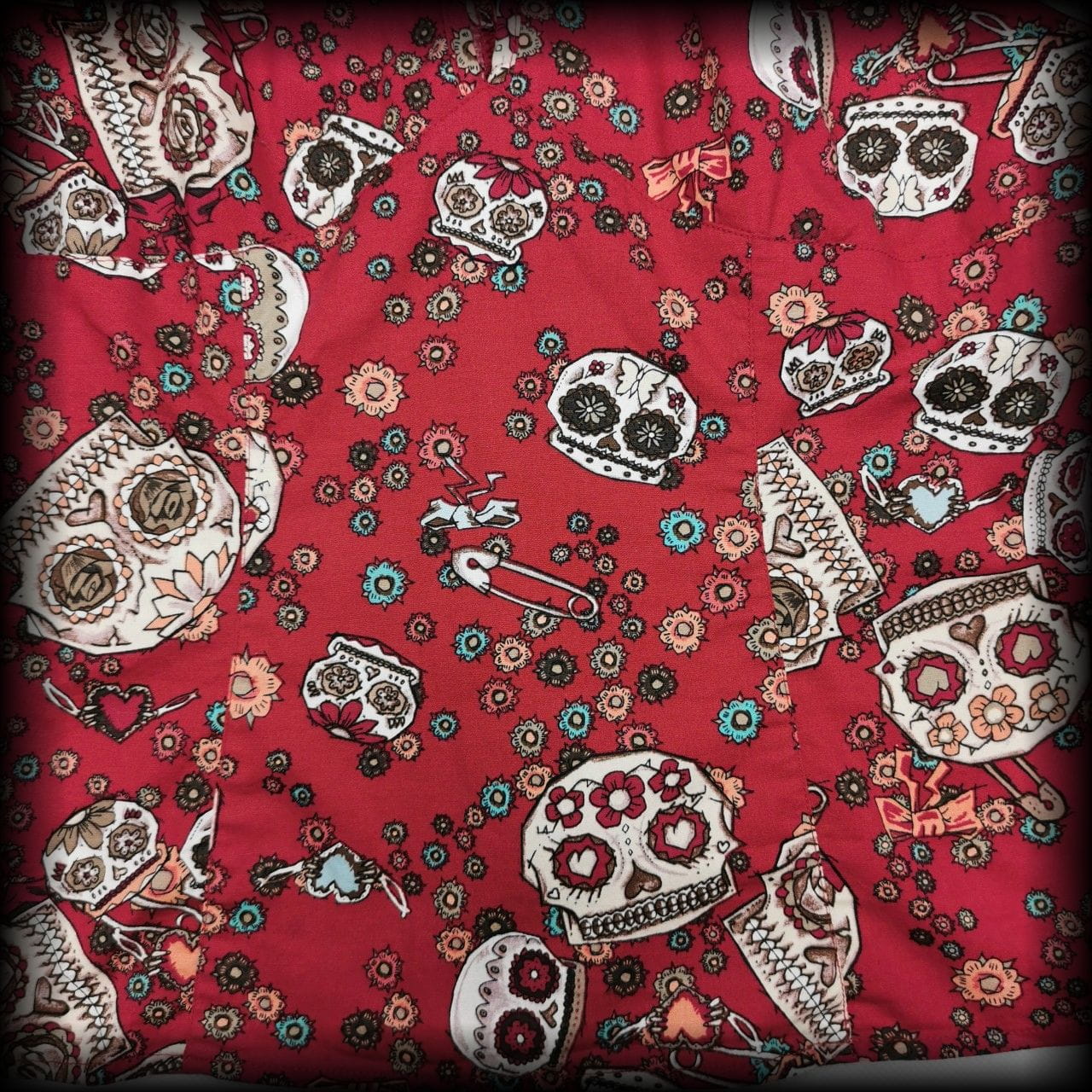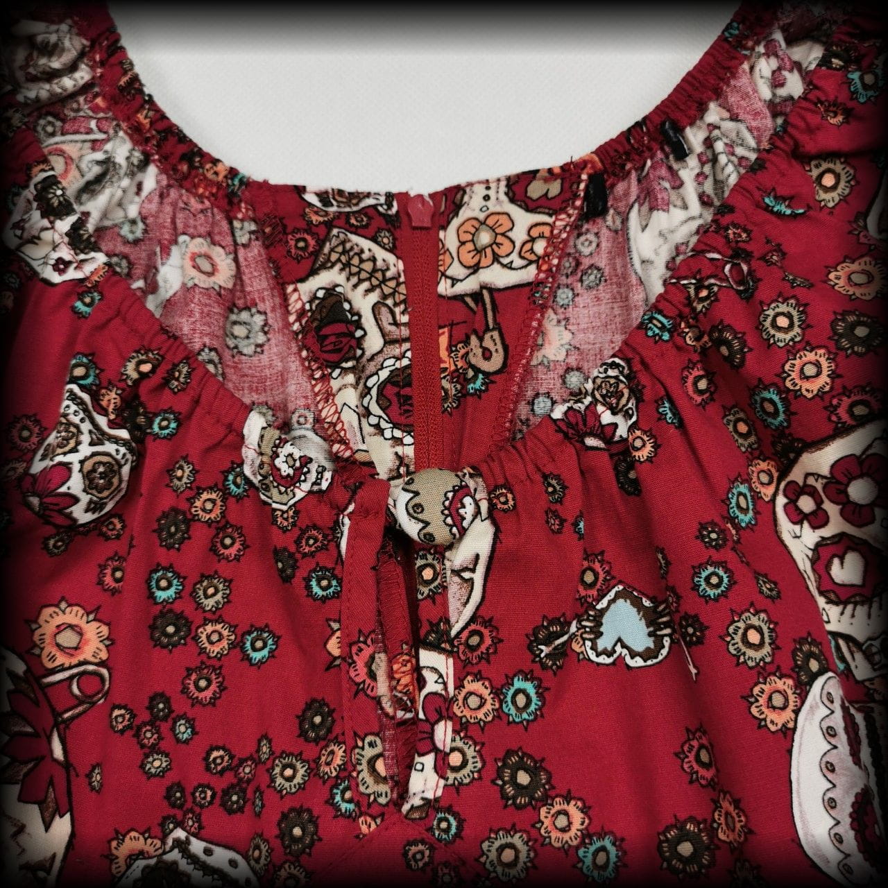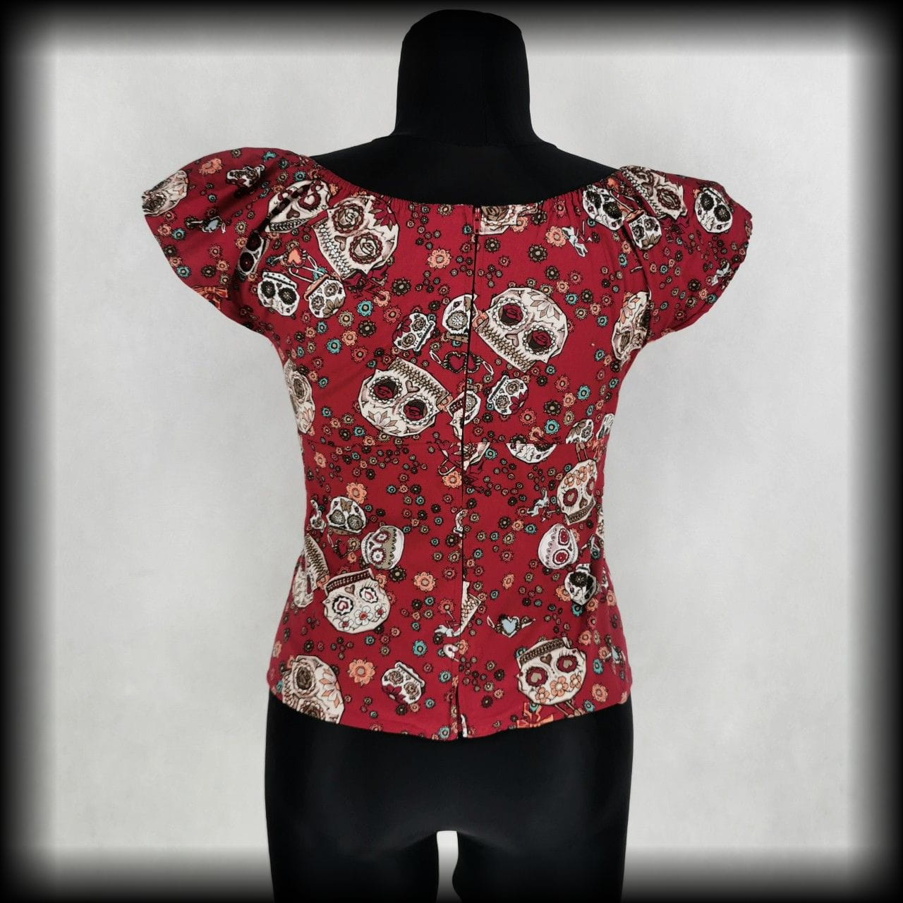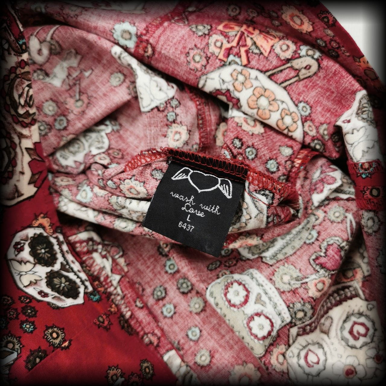 Czerwona bluzka z krótkim rękawkiem w meksykańskie czaszki, kwiaty i agrafki