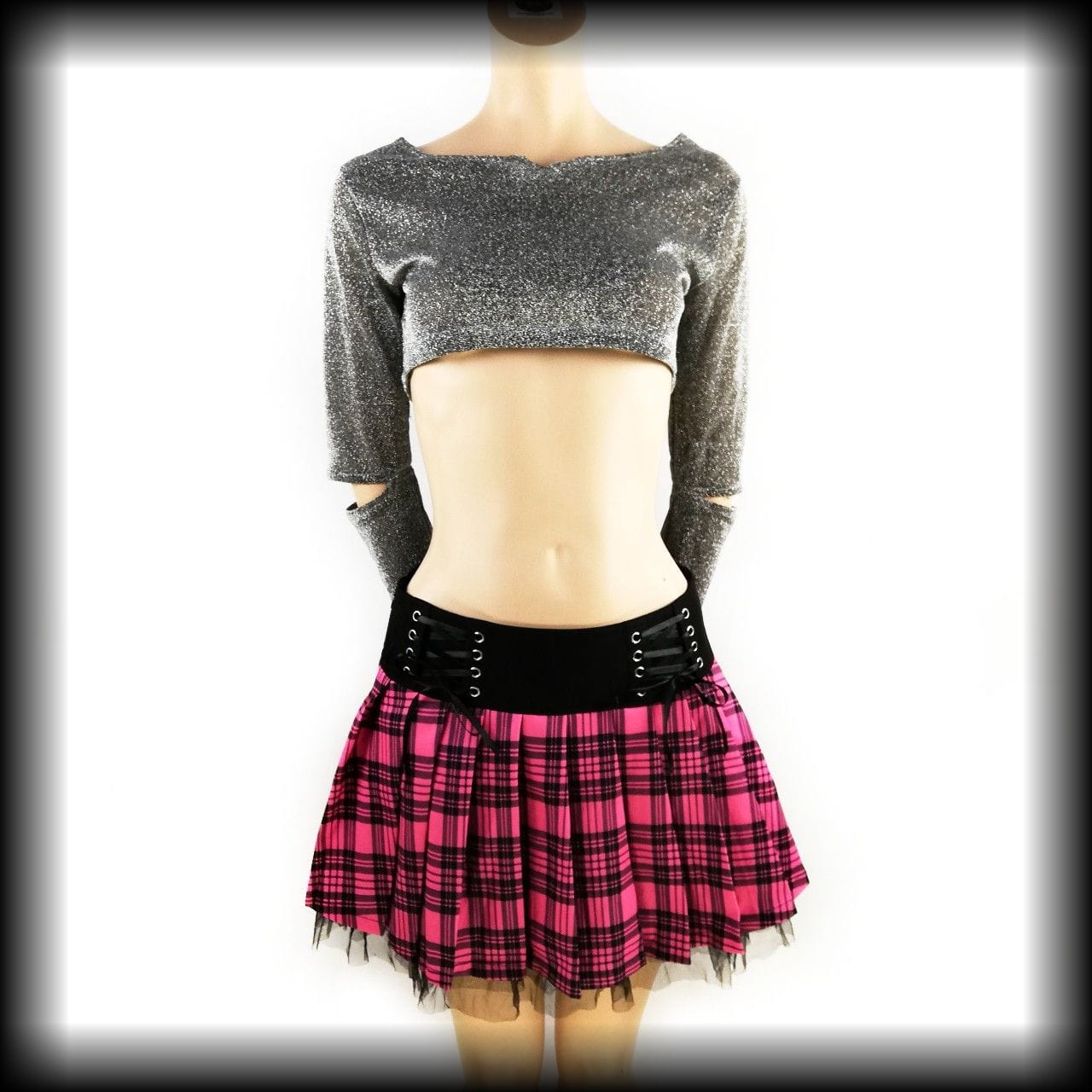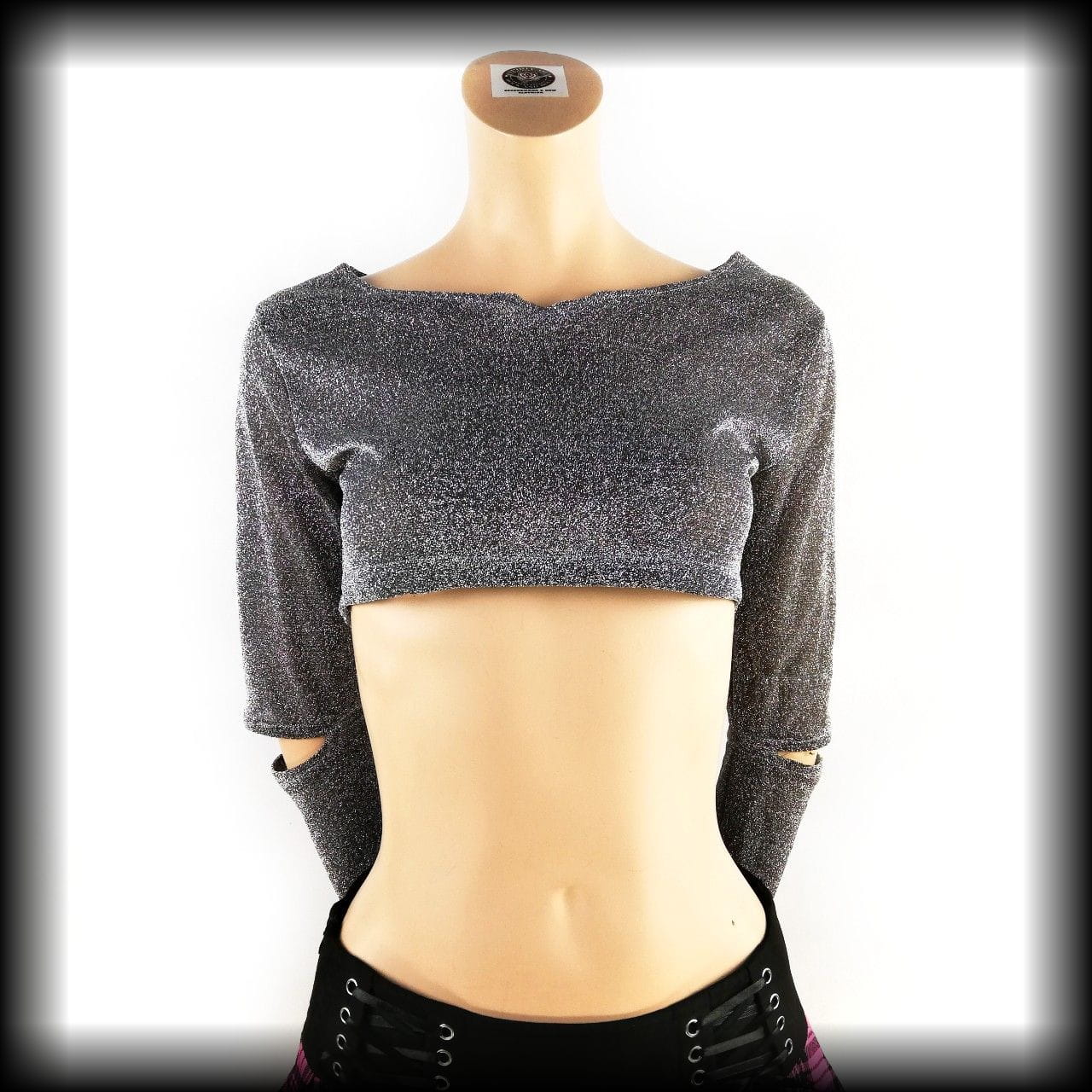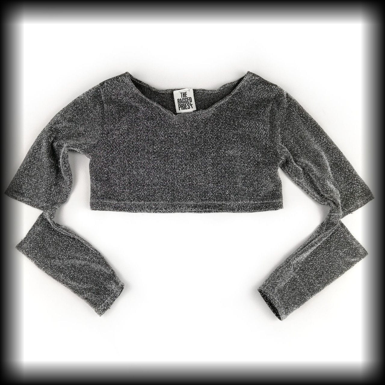 Srebrna bluzka typy crop top z długimi rękawkami. Pełna brokatu i lekko transparentna