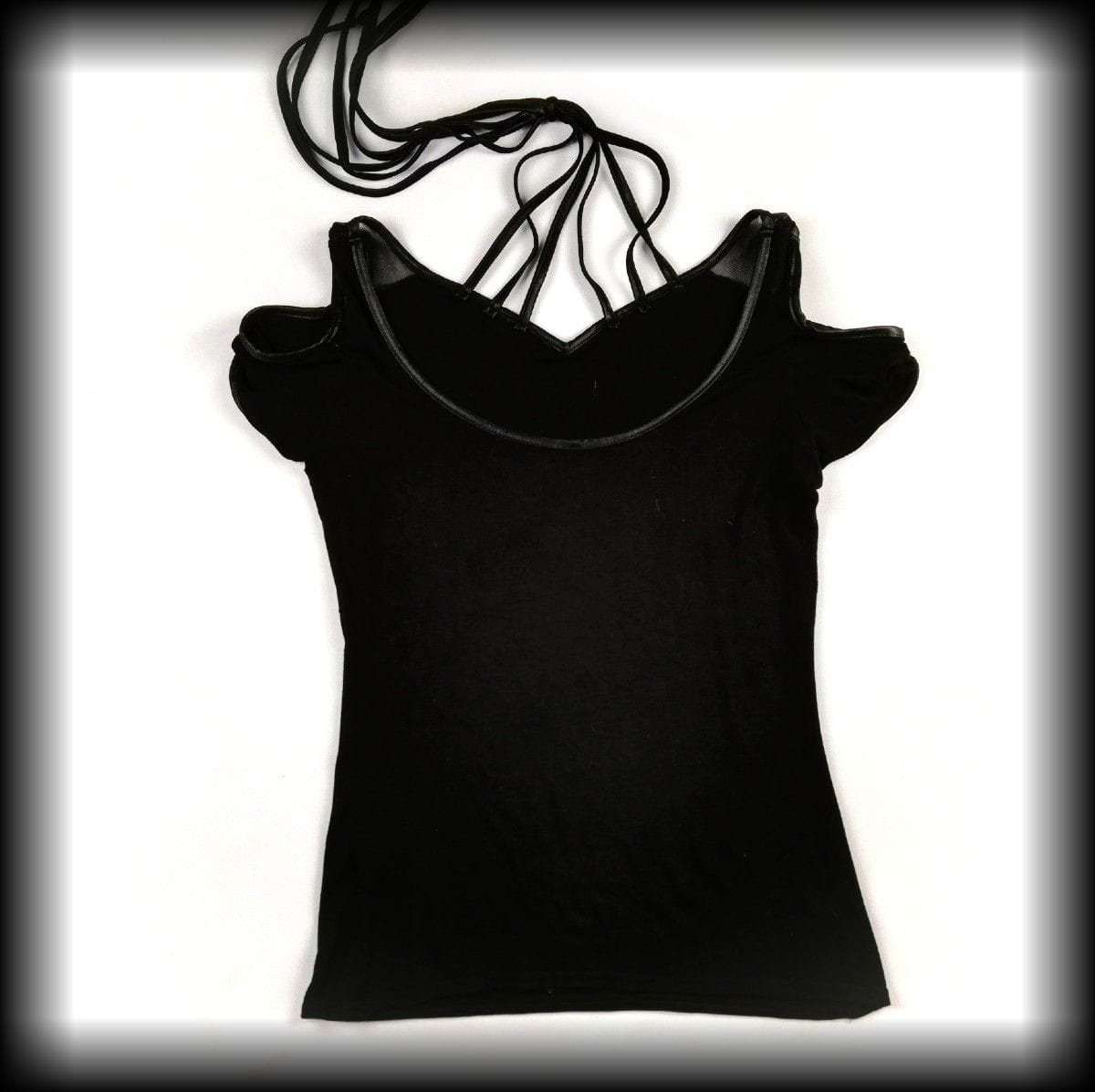 Czarna bluzka z dzianiny z krótkim rękawem z odkrytymi ramionami i interesującym wiązaniem na szyi. Z tyłu głębiej wycięta