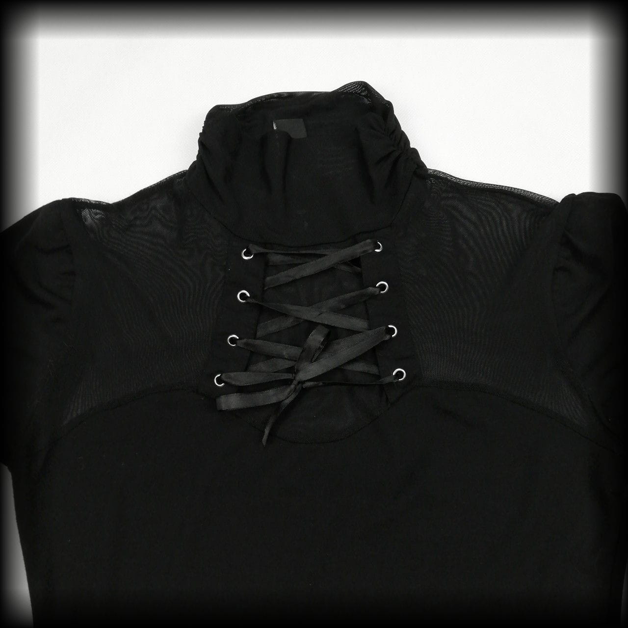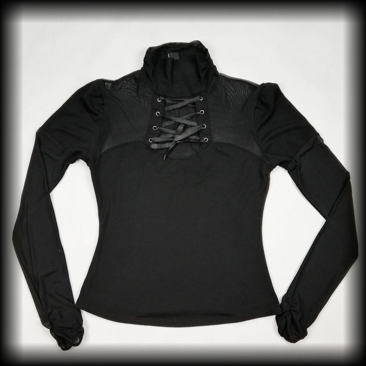 Czarna bluzka z długim rękawem i golfem. Posiada transparentne wstawki i wiązanie gorsetowe
