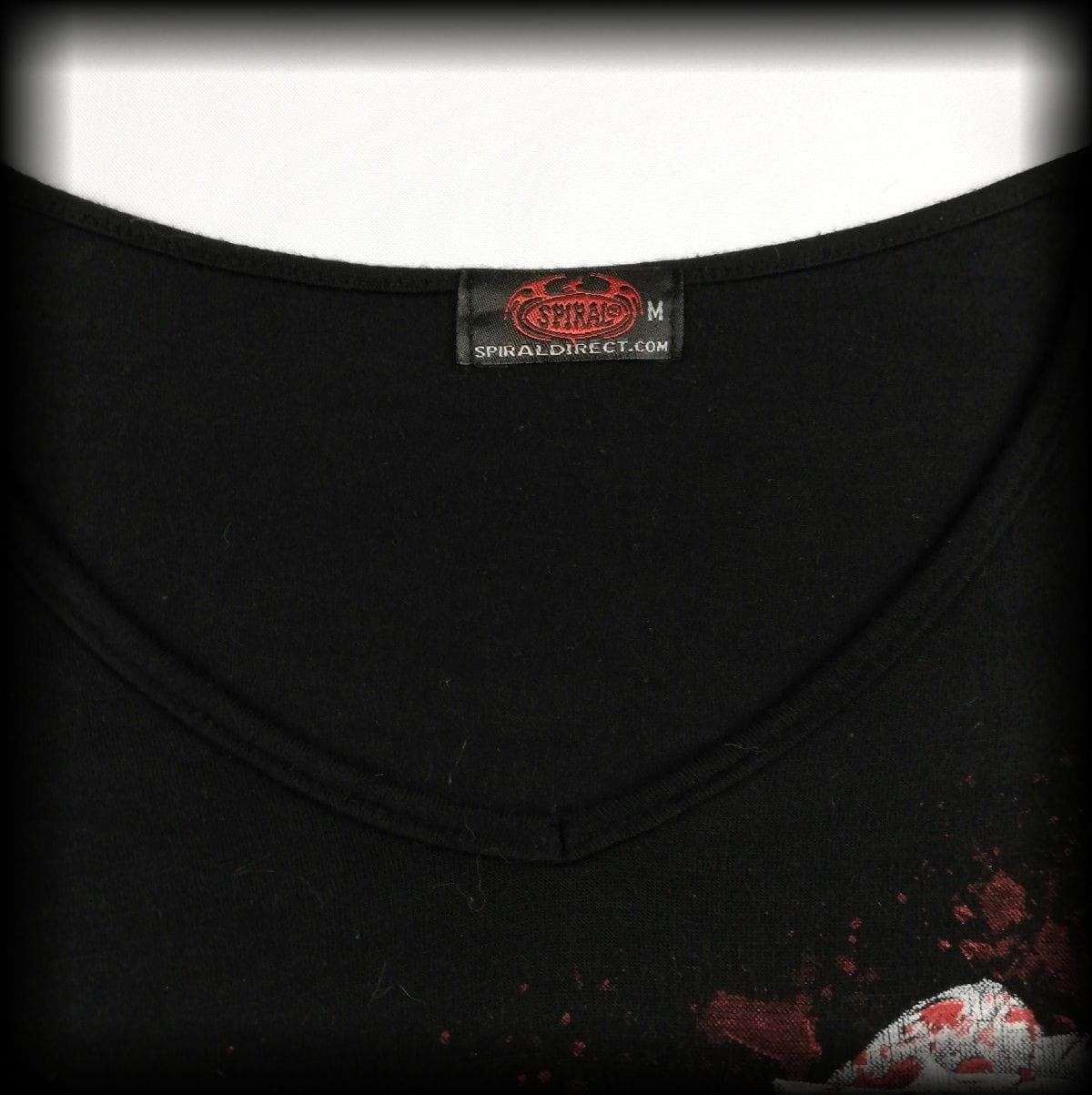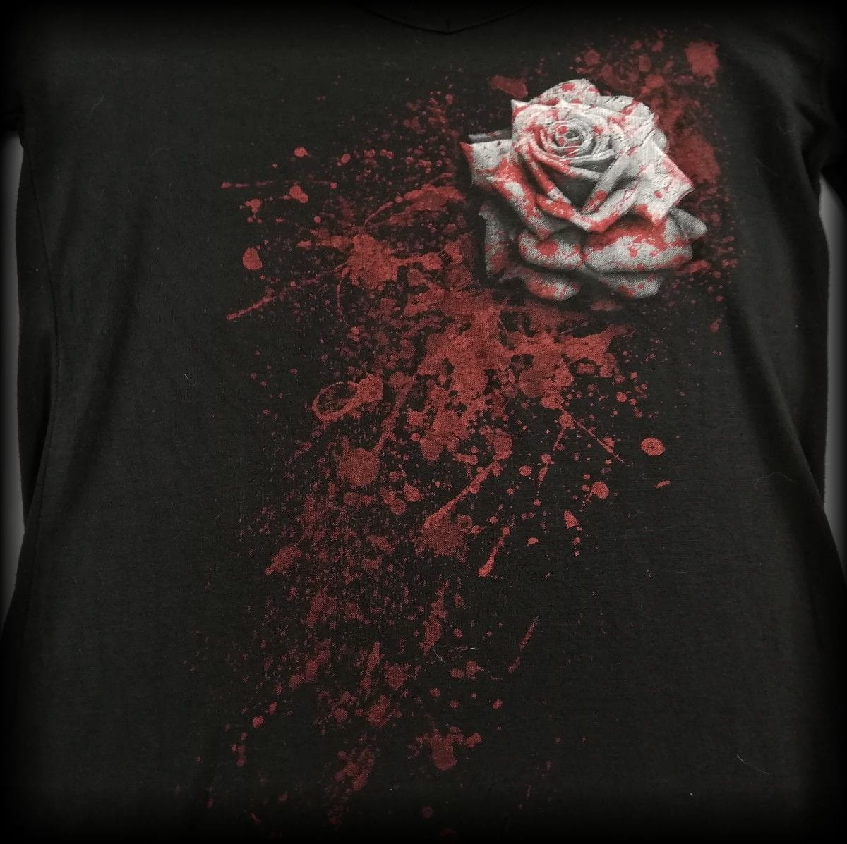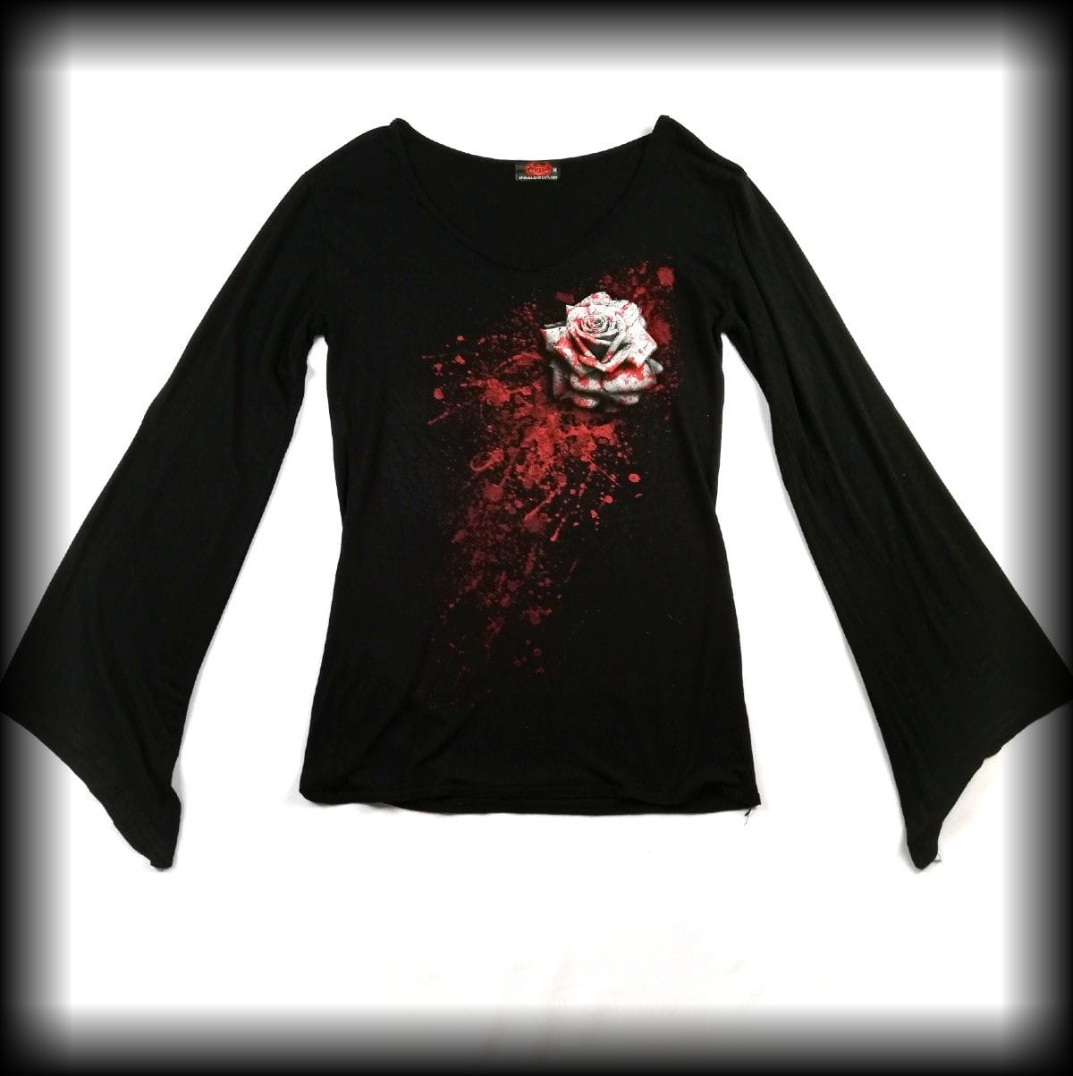 Czarna bluzka z długimi rozszerzanymi rękawami i nadrukowanym motywem zakrwawionej róży