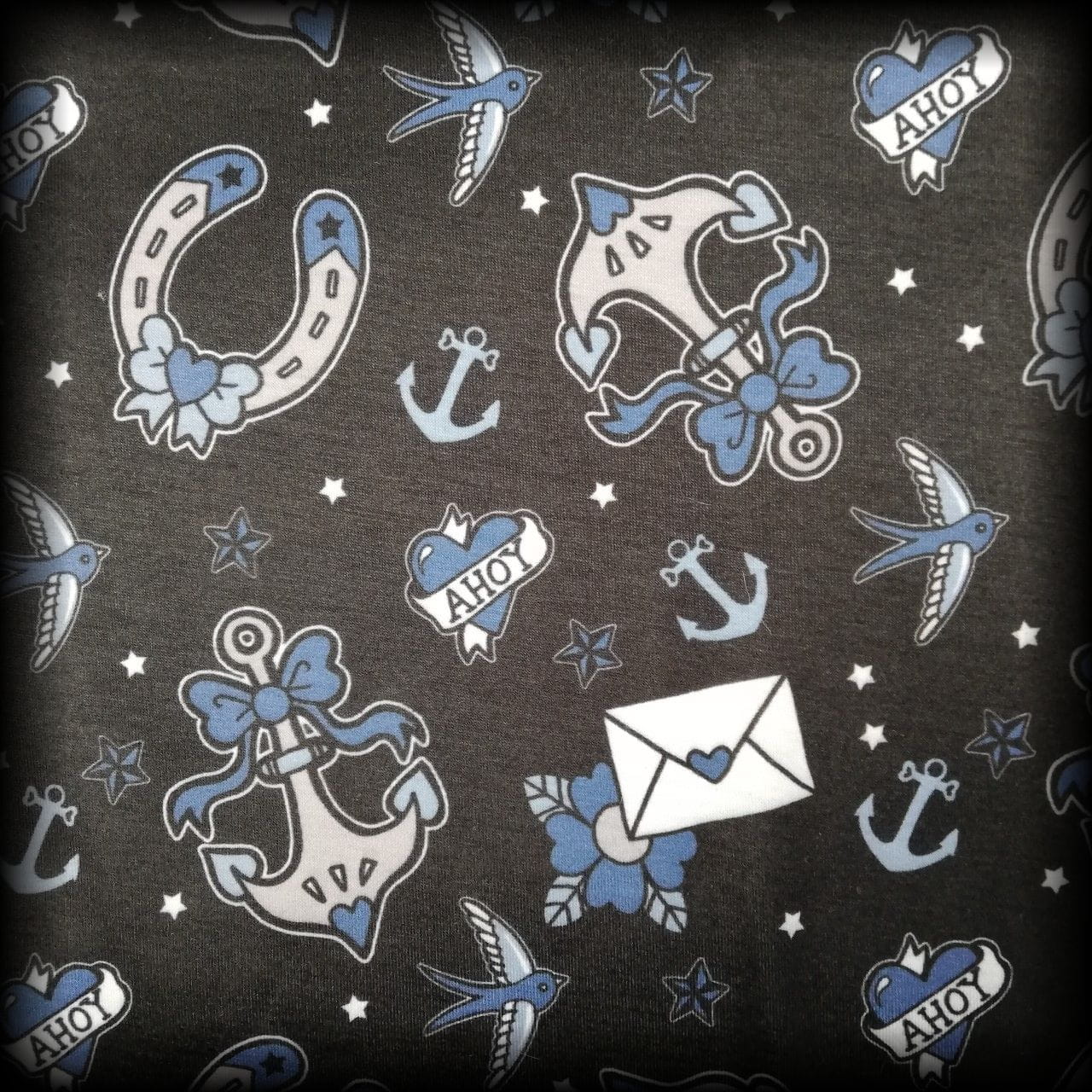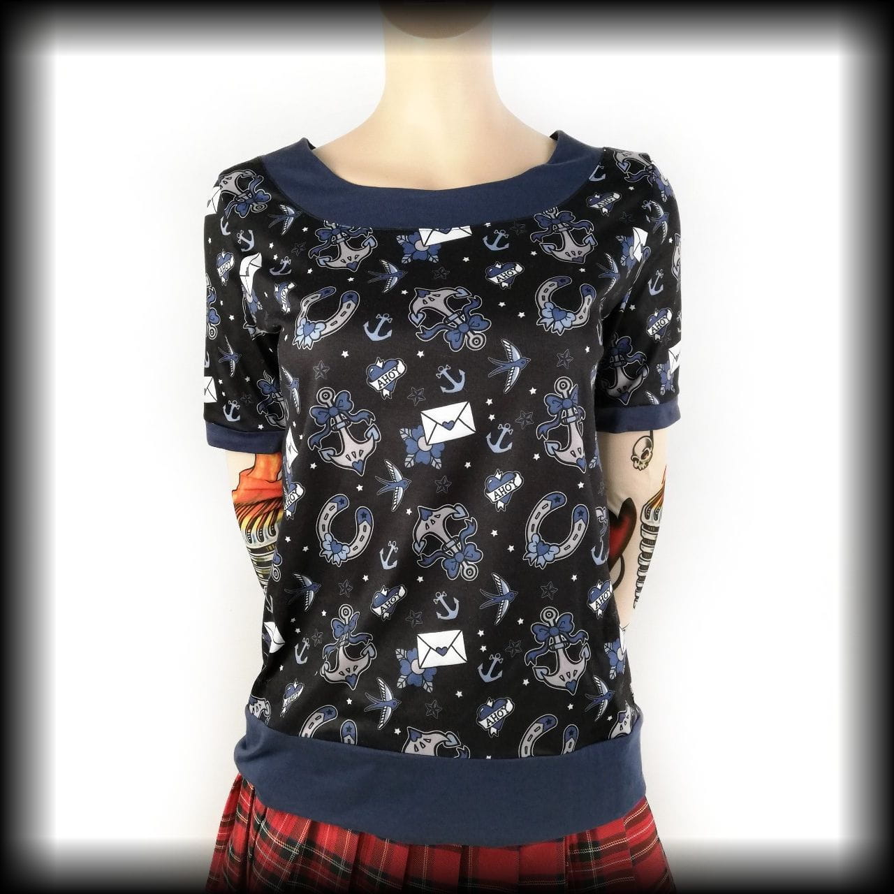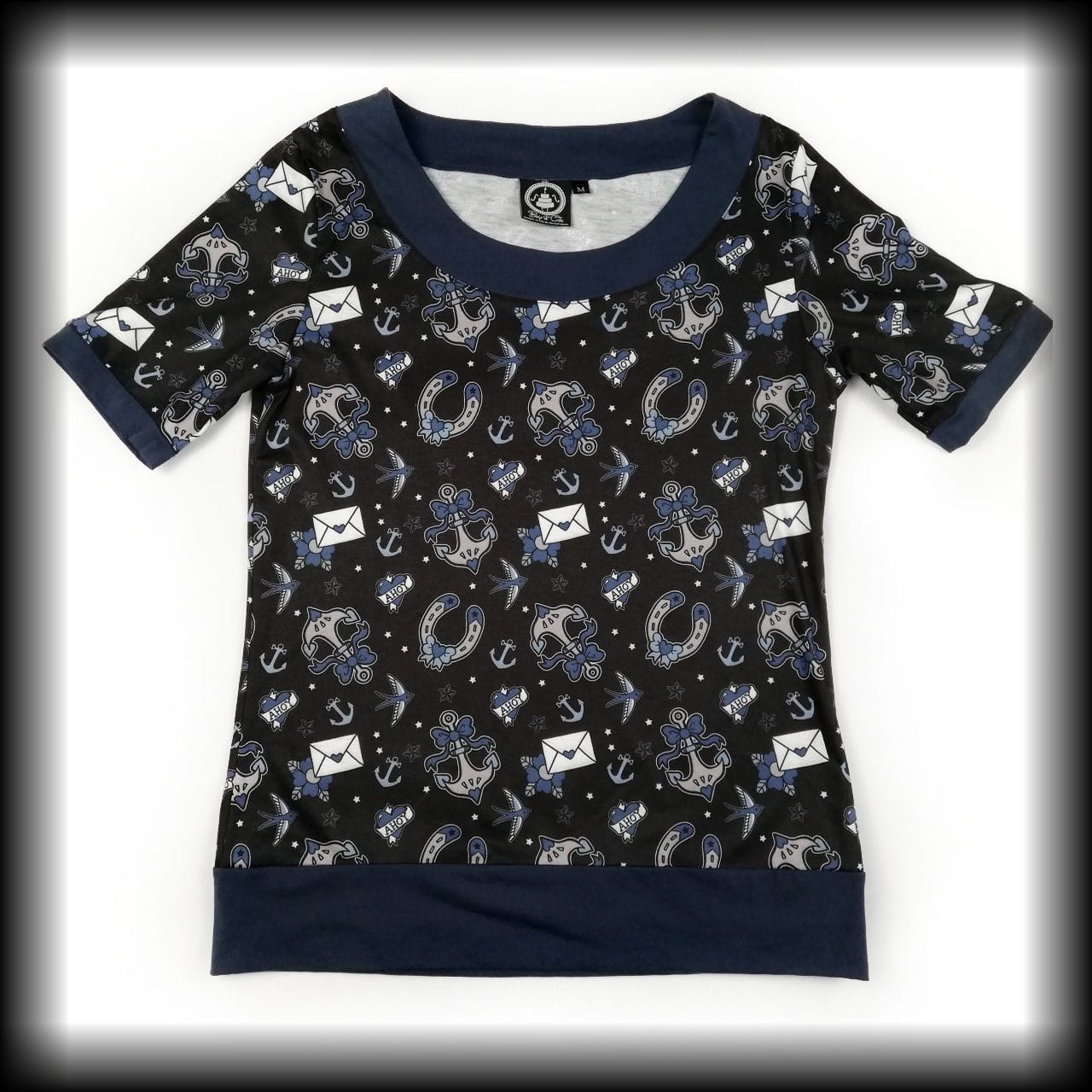 Czarna bluzka z granatowymi wykończeniami we wzór starych tatuaży w marynarskim klimacie. Kotwice, podkowy, jaskółki i listy miłosne!