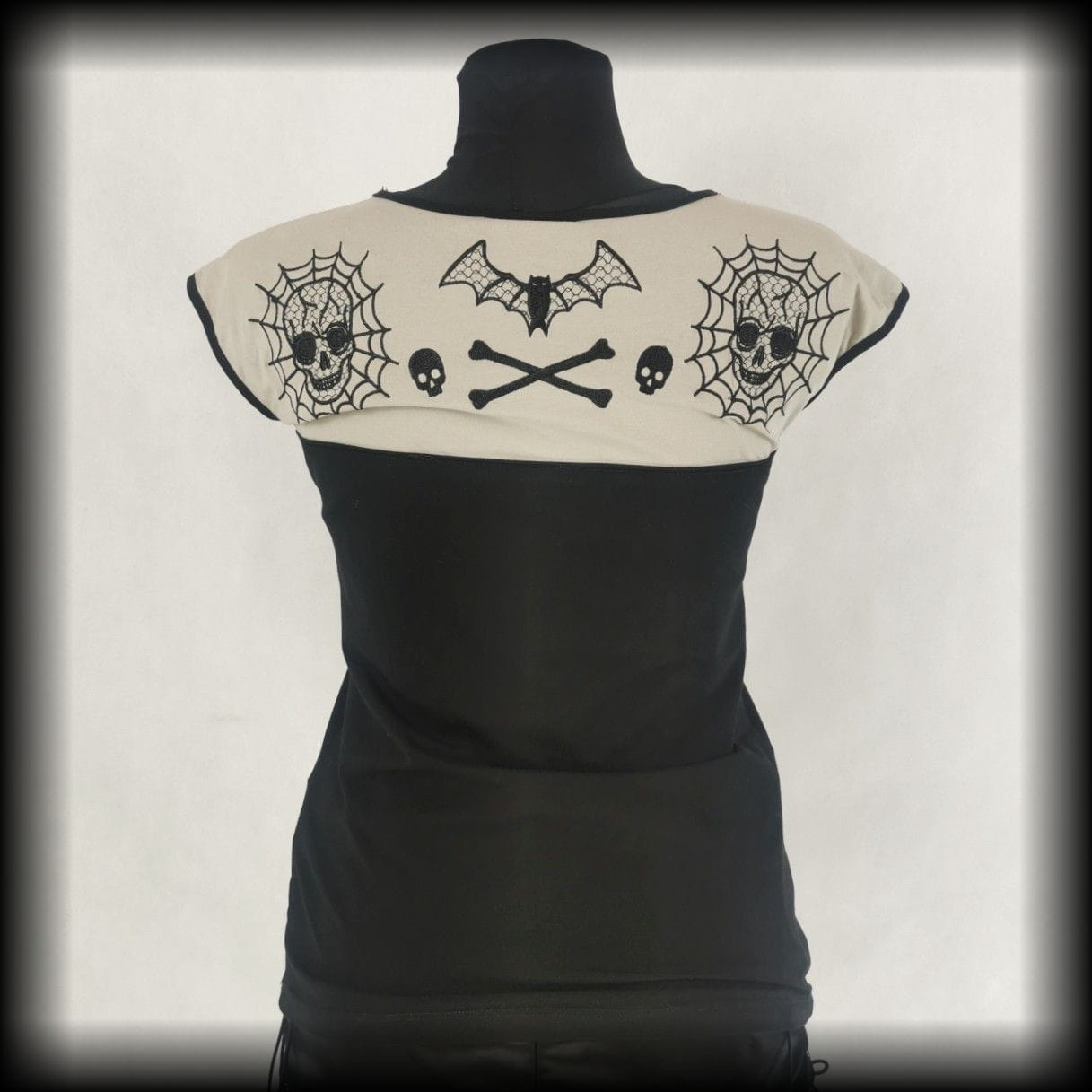 Czarno bezowa bluzka w klimacie psychobilly z wyszytymi aplikacjami: czaszki, nietoperze i pajęczyny