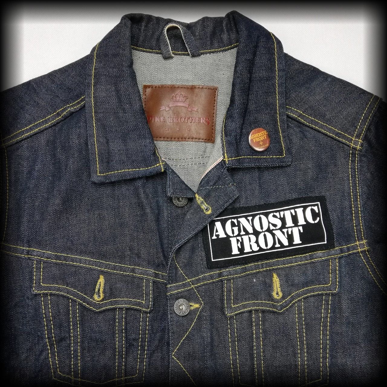 Granatowa kurtka jeansowa z nadrukiem na plecach z Agnostic Front z glanami oraz czarną naszywką z ich logo z przodu.