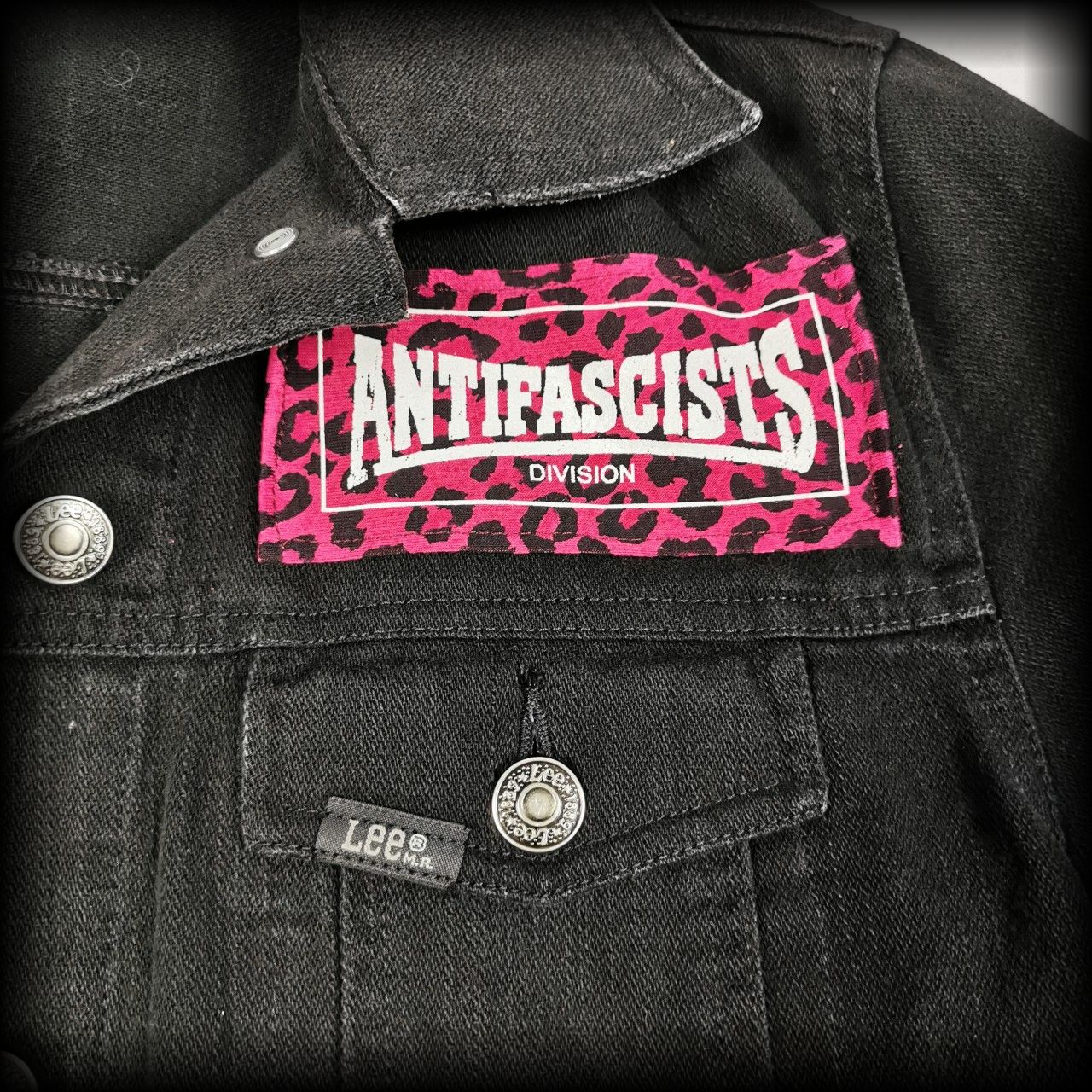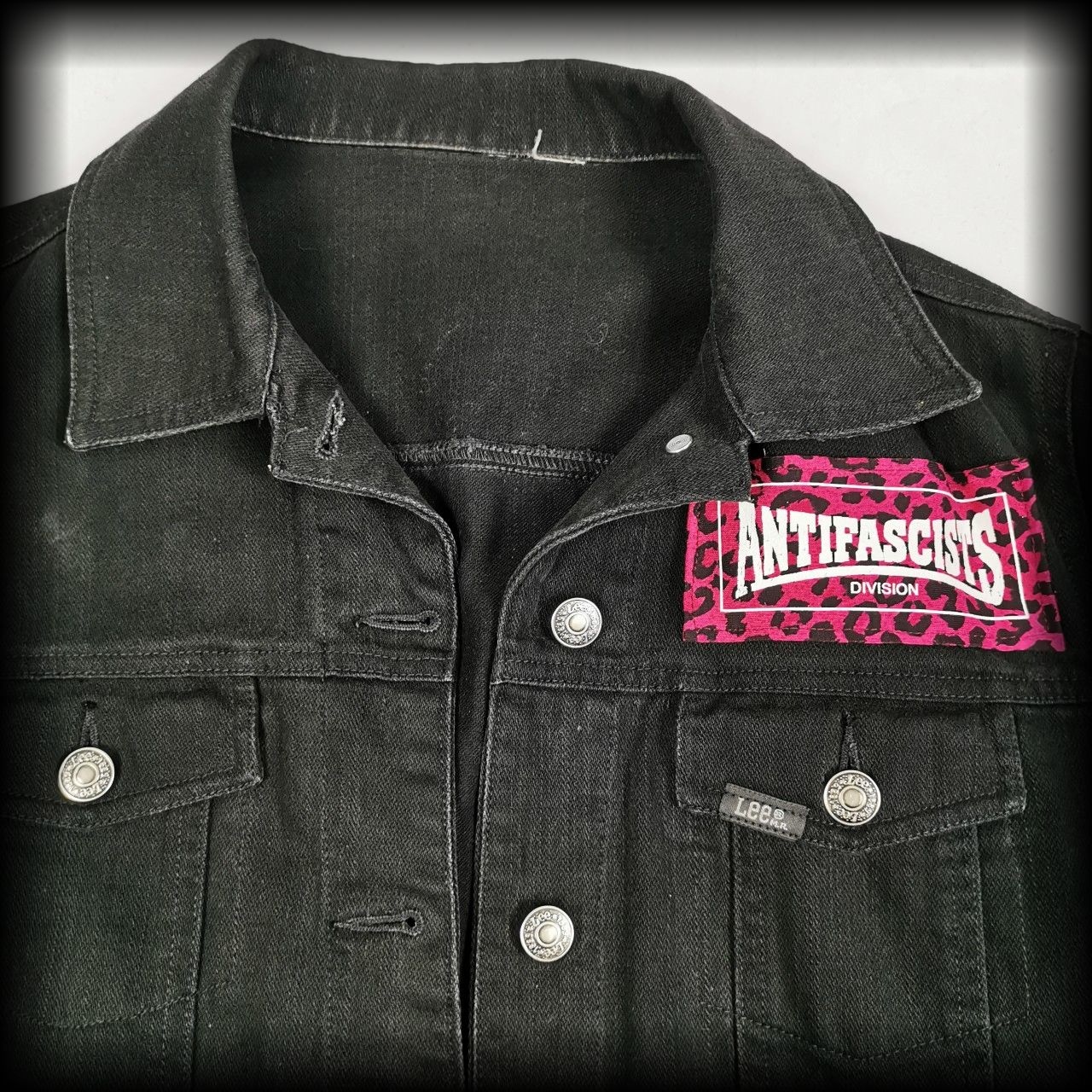 DIY - z tyłu nadruk z Doom, z przodu naszywka w różową panterkę Antifascists