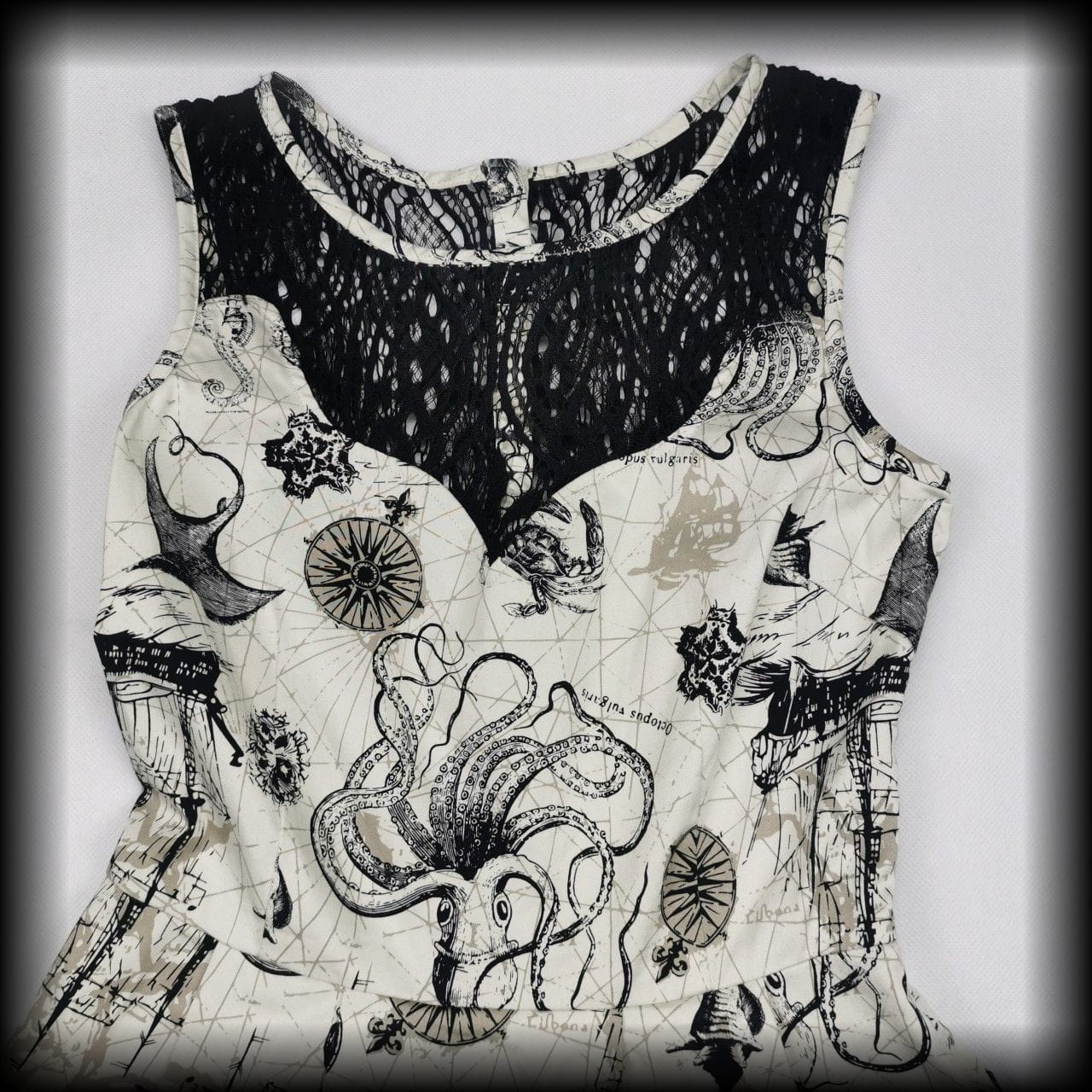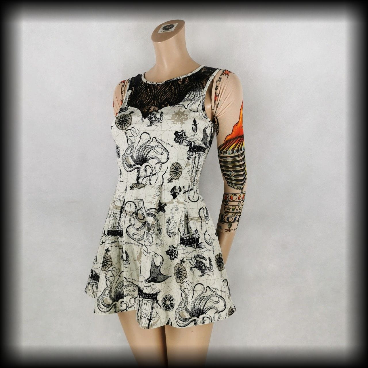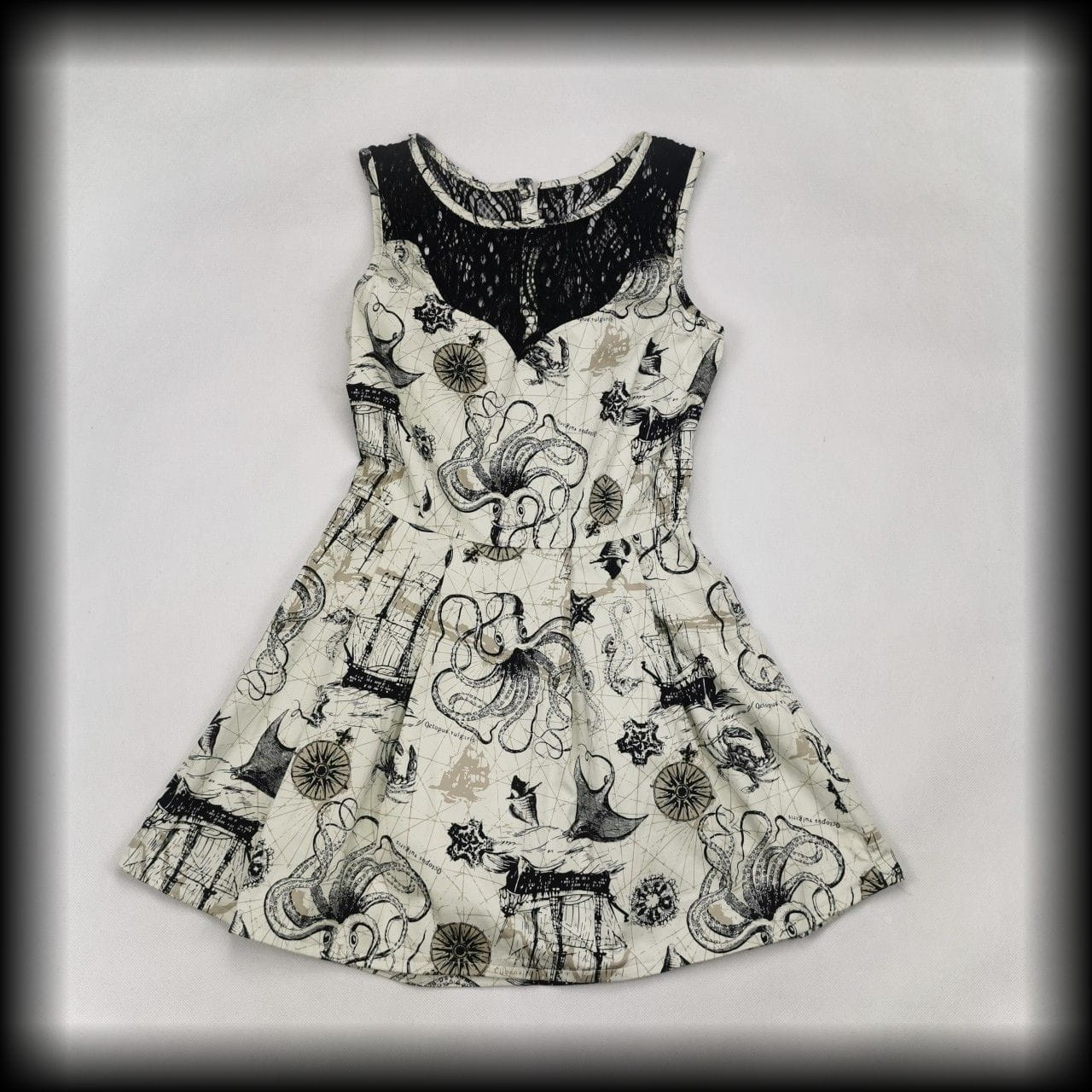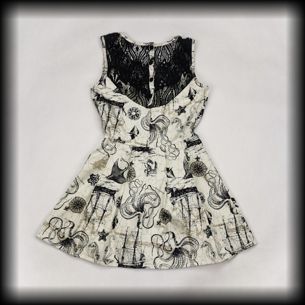Kremowa lekko rozkloszowana sukienka mini z czarnymi koronkowymi wykończeniami w unikatowy wzór w morskim klimacie: żaglowce, róże wiatrów, płaszczki, ośmiornice, muszle i inne stwory