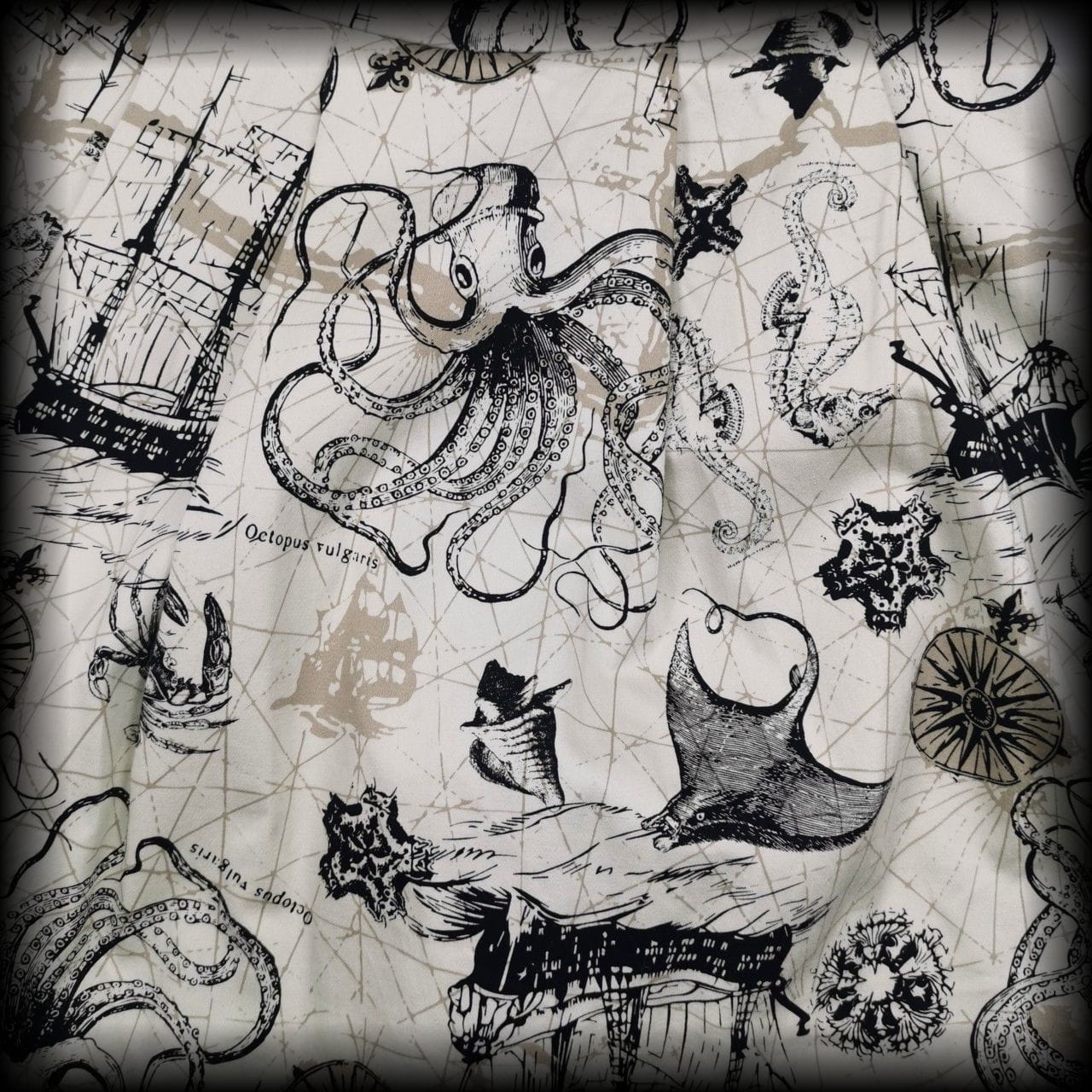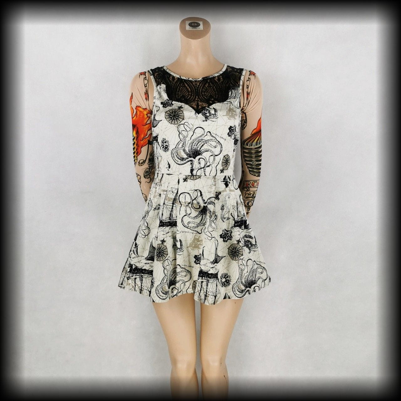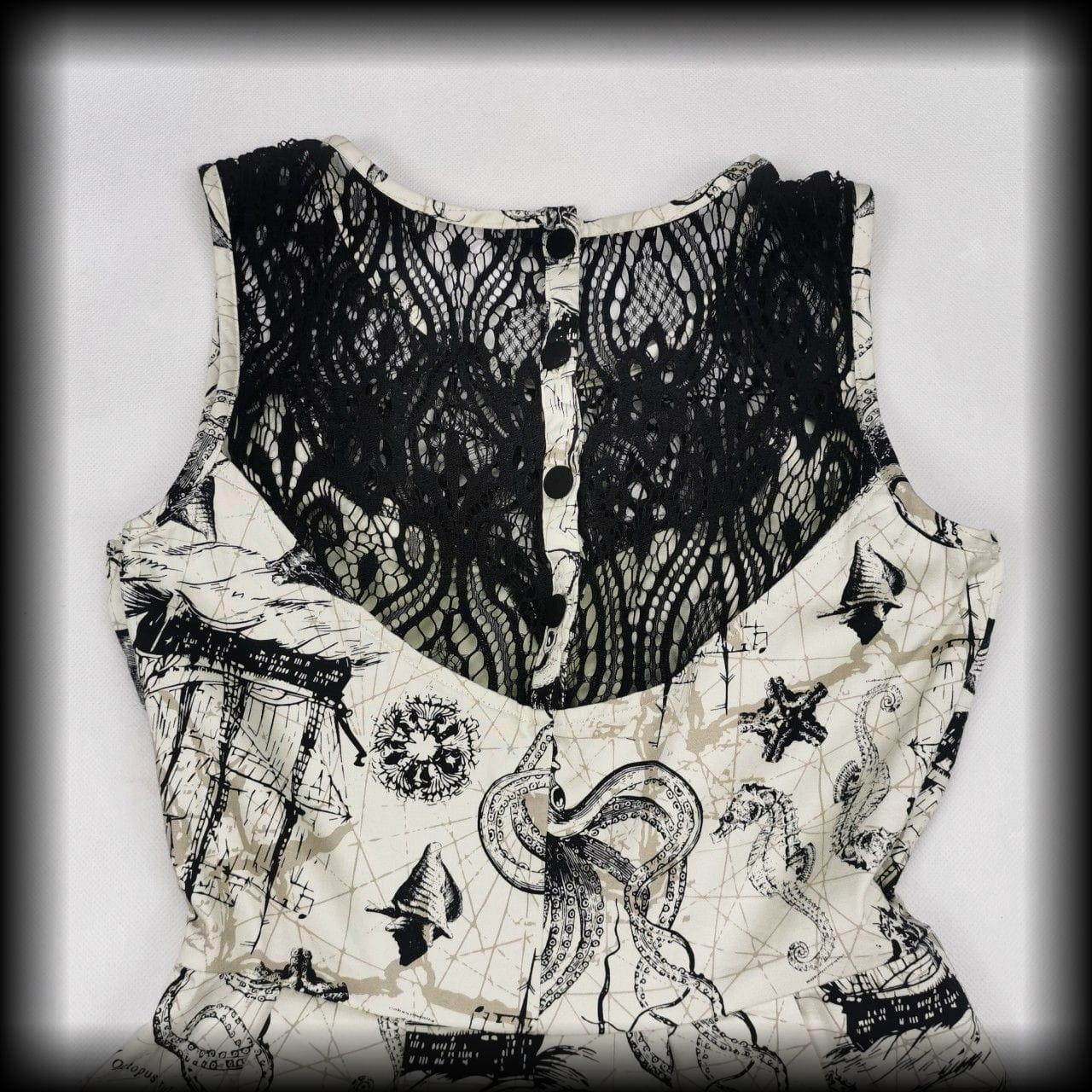 Kremowa lekko rozkloszowana sukienka mini z czarnymi koronkowymi wykończeniami w unikatowy wzór w morskim klimacie: żaglowce, róże wiatrów, płaszczki, ośmiornice, muszle i inne stwory