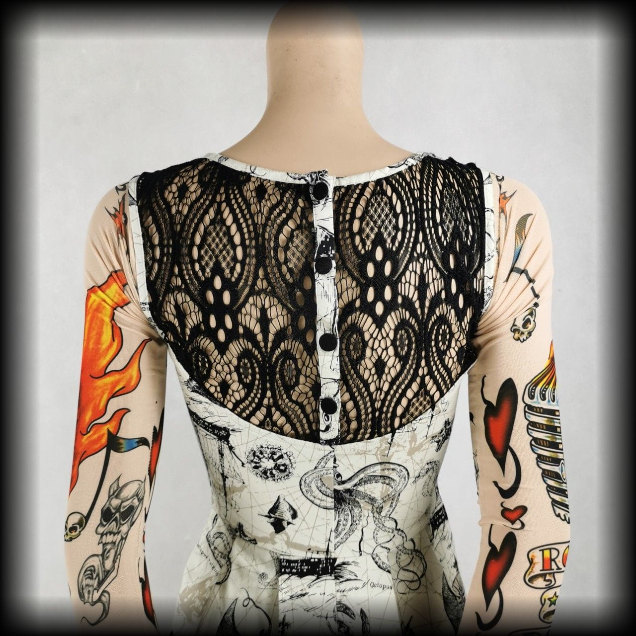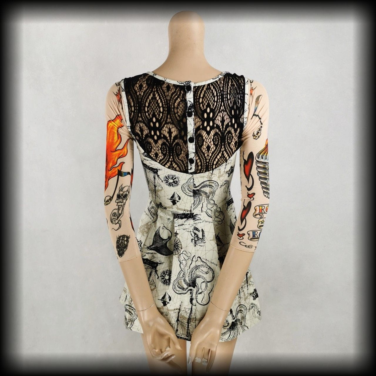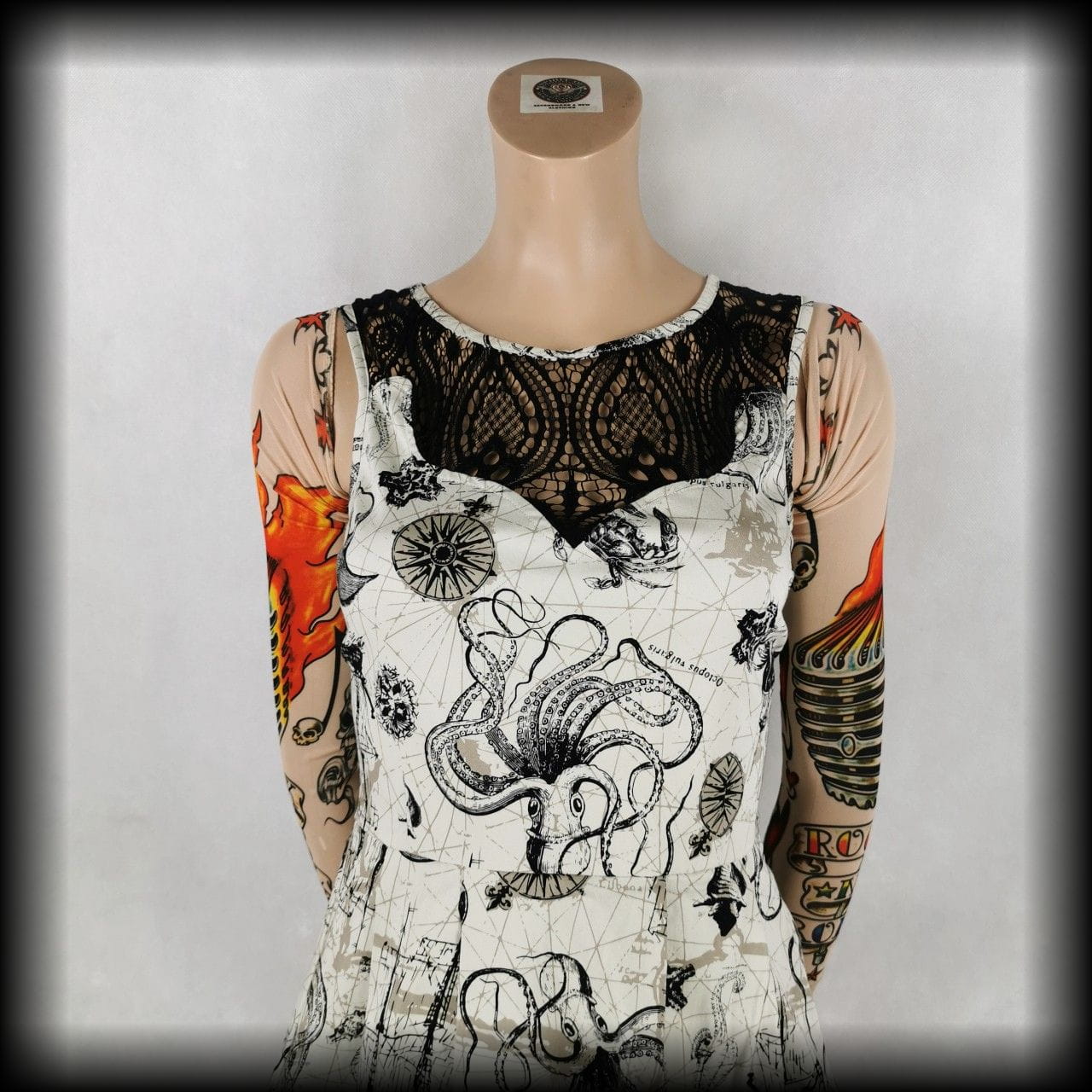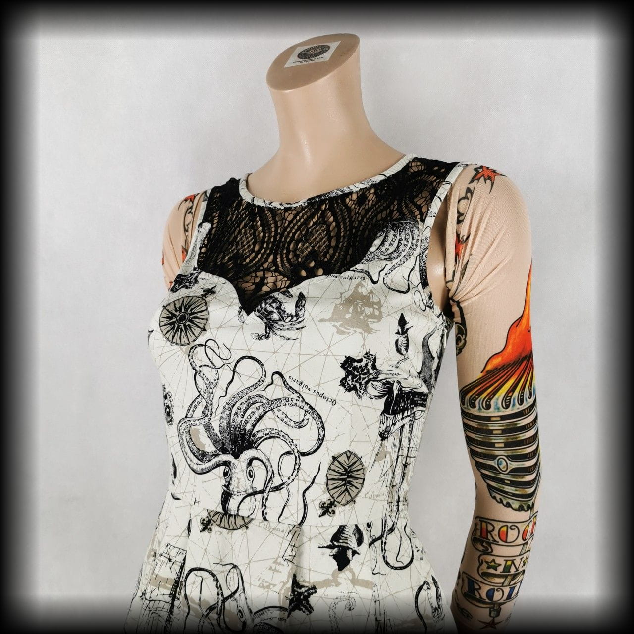 Kremowa lekko rozkloszowana sukienka mini z czarnymi koronkowymi wykończeniami w unikatowy wzór w morskim klimacie: żaglowce, róże wiatrów, płaszczki, ośmiornice, muszle i inne stwory