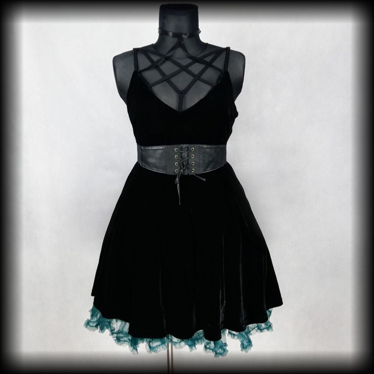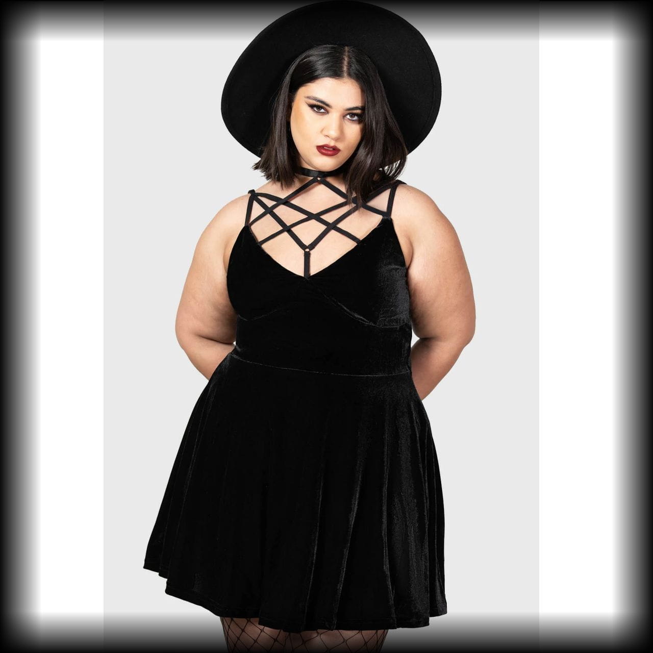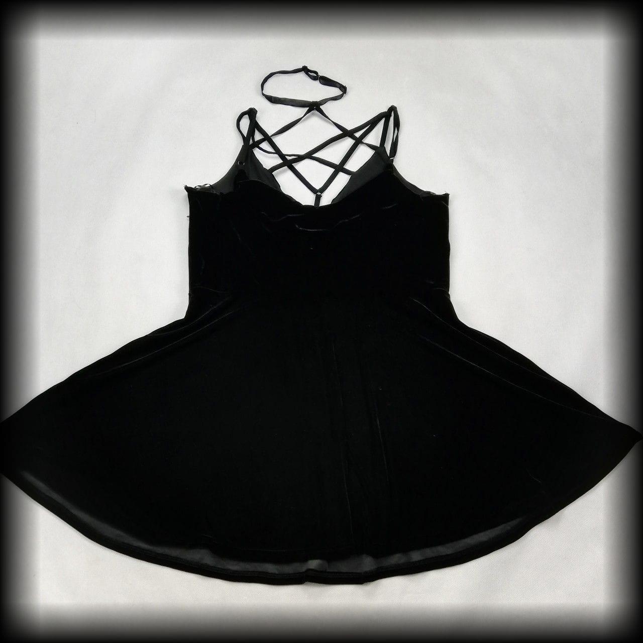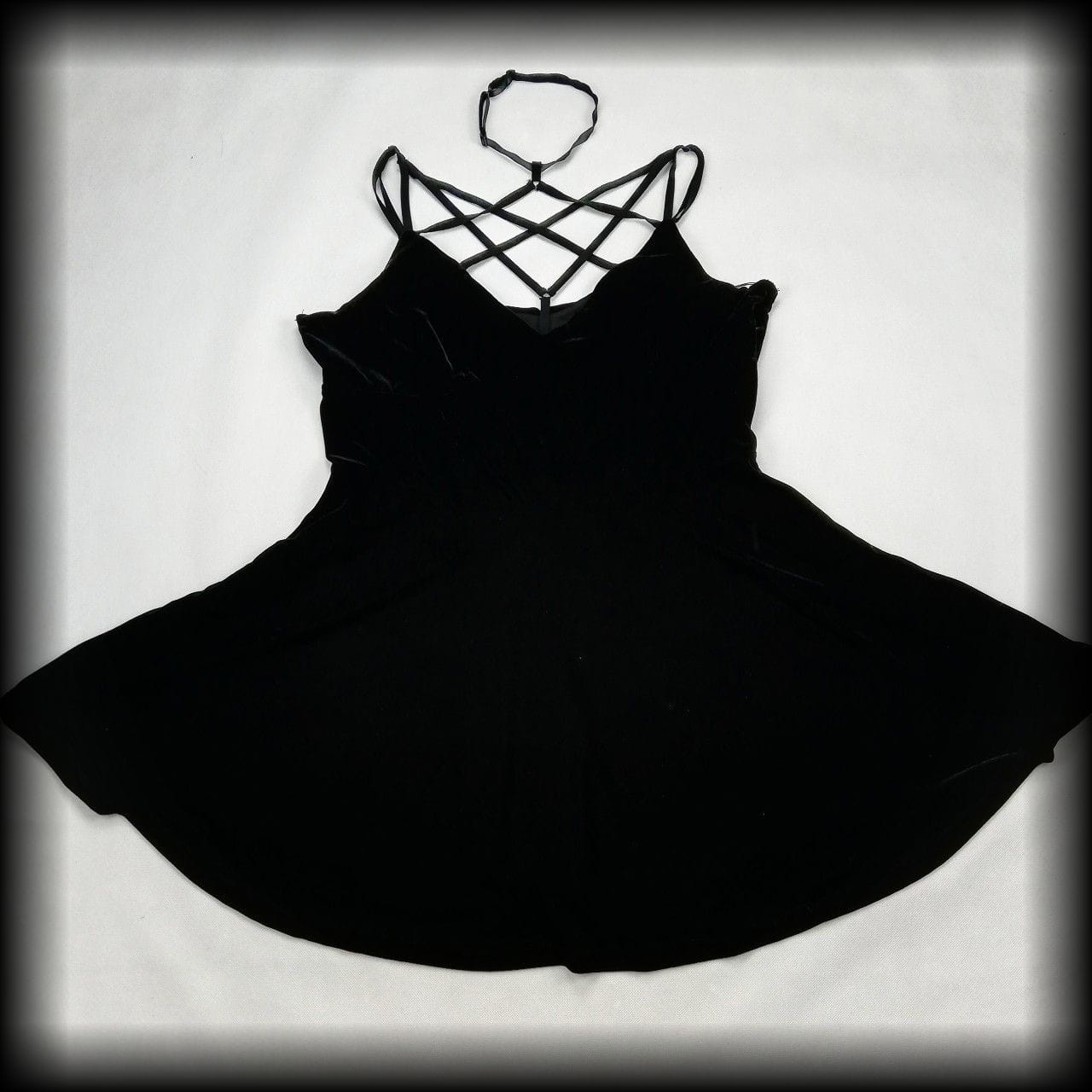 Welurowa, czarna i rozkloszowana sukienka na ramiączkach z paskami w kształcie heksagramu na dekolcie oraz z chokerem