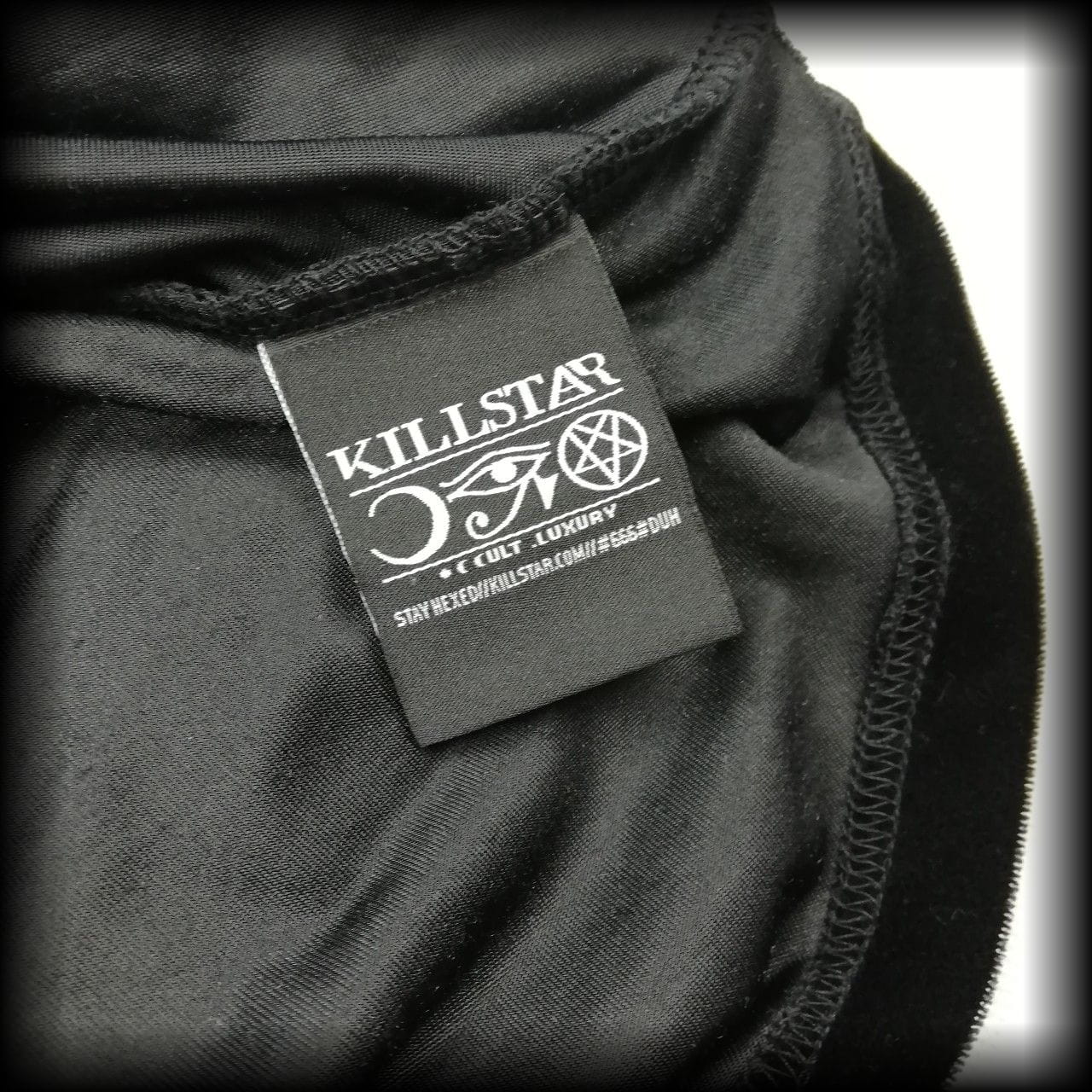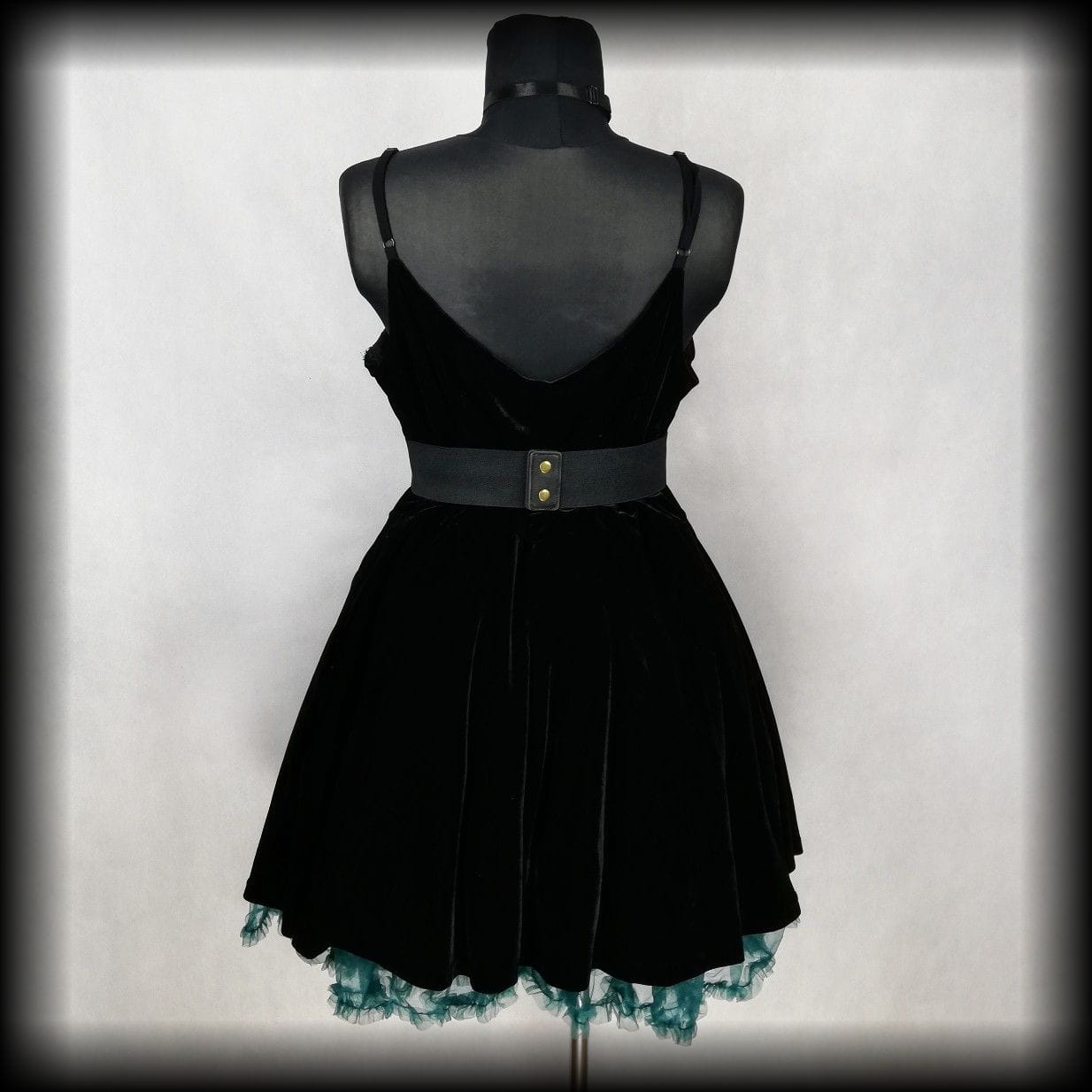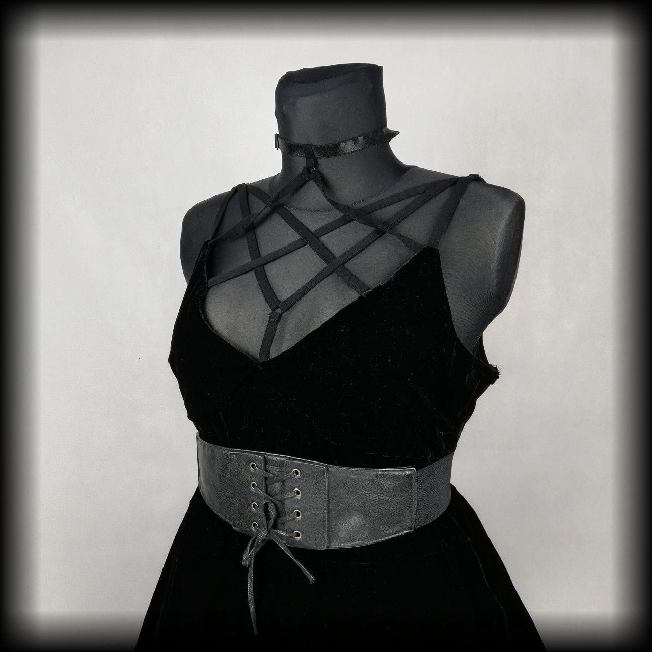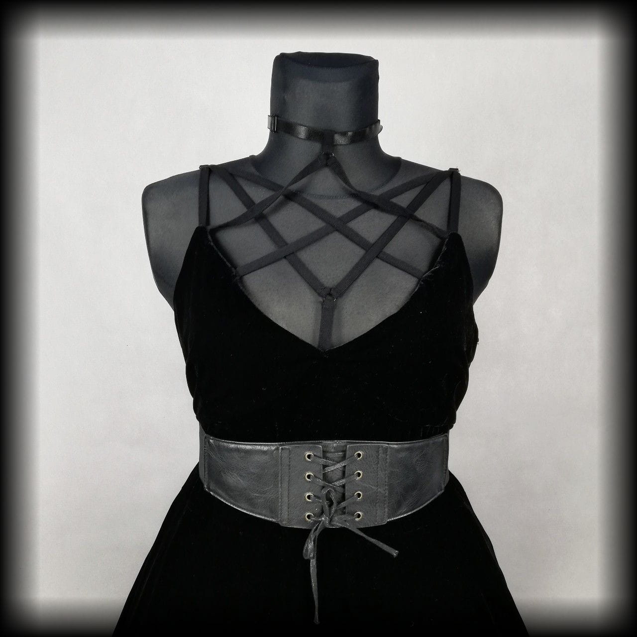 Welurowa, czarna i rozkloszowana sukienka na ramiączkach z paskami w kształcie heksagramu na dekolcie oraz z chokerem