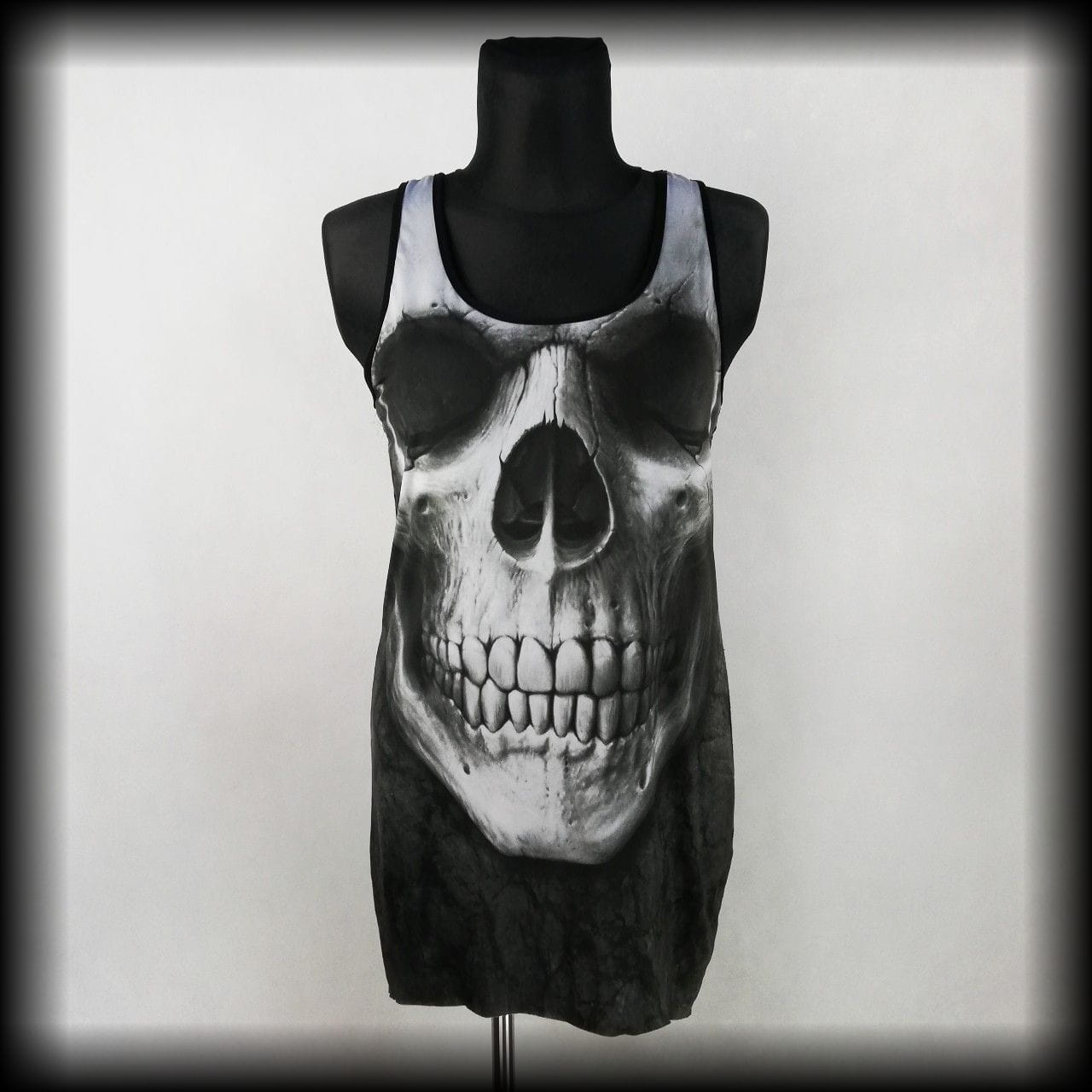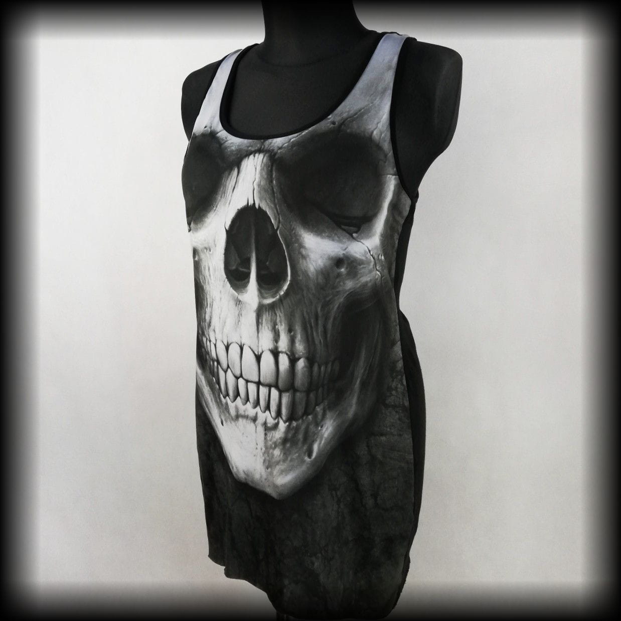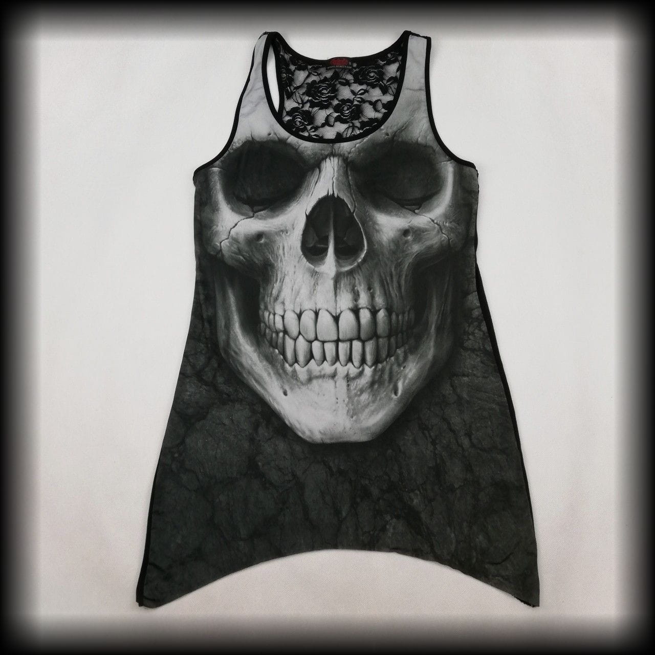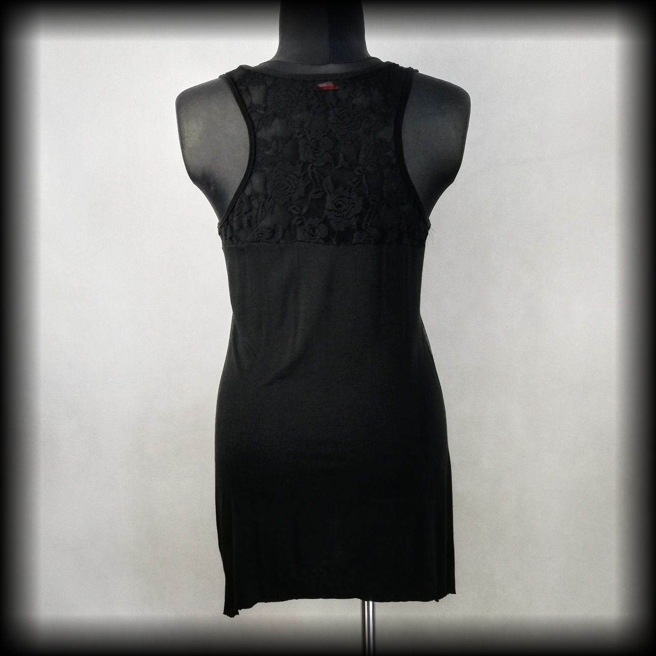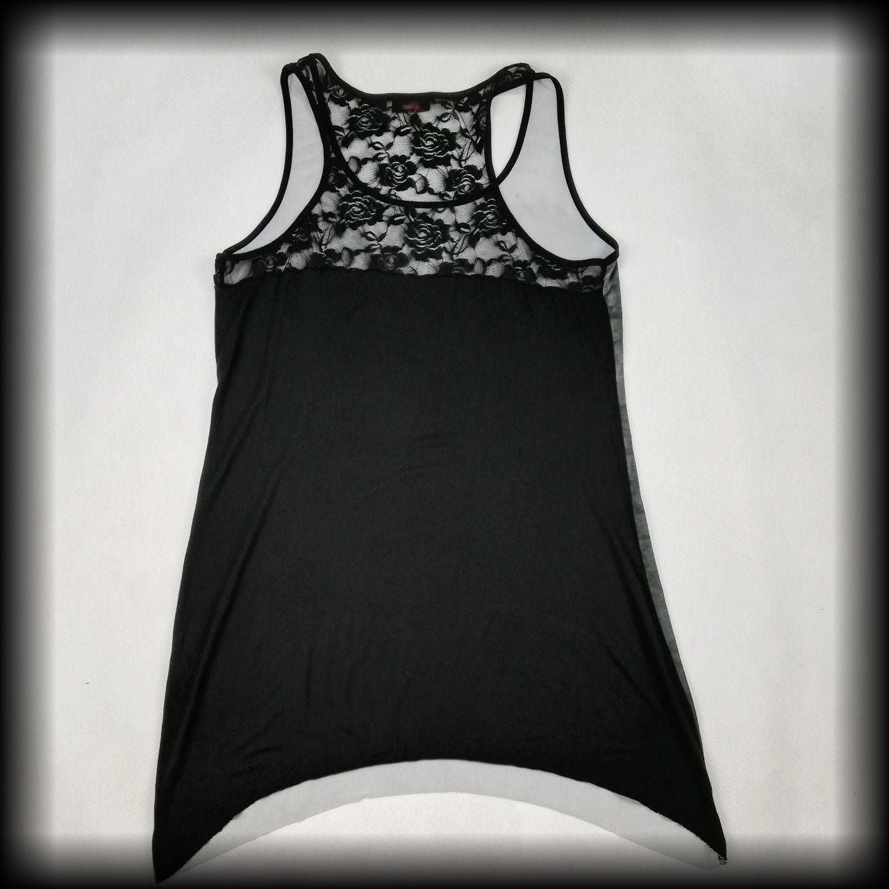 Czarna mini z bez rękawów. Z przodu wielka czacha, z tyłu czarna z koronkową górą