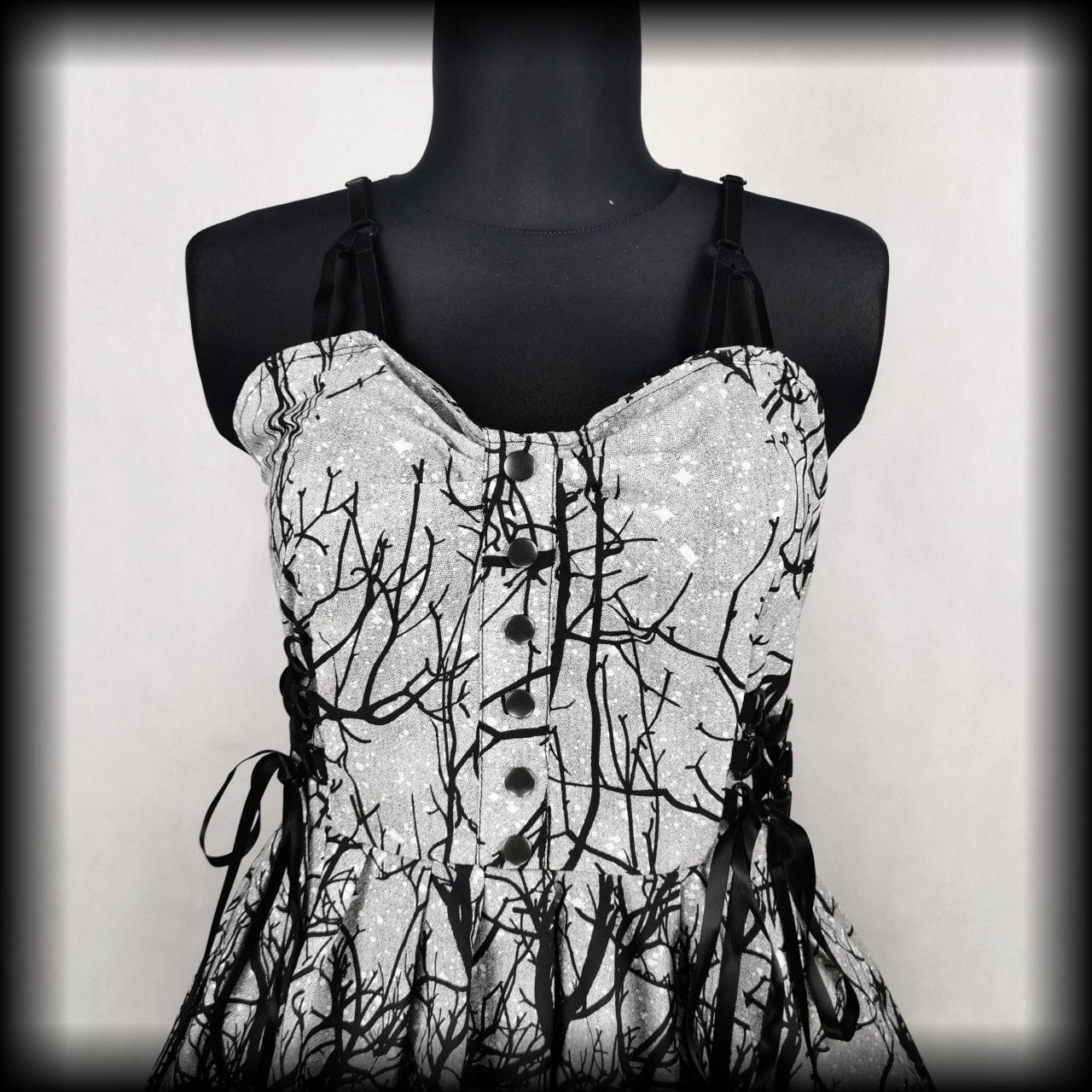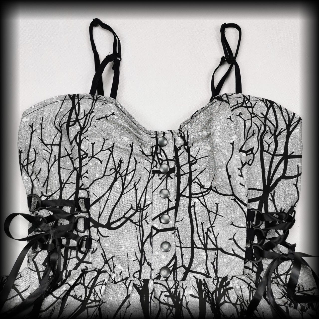 Z przodu po bokach ozdobne wiązania gorsetowe