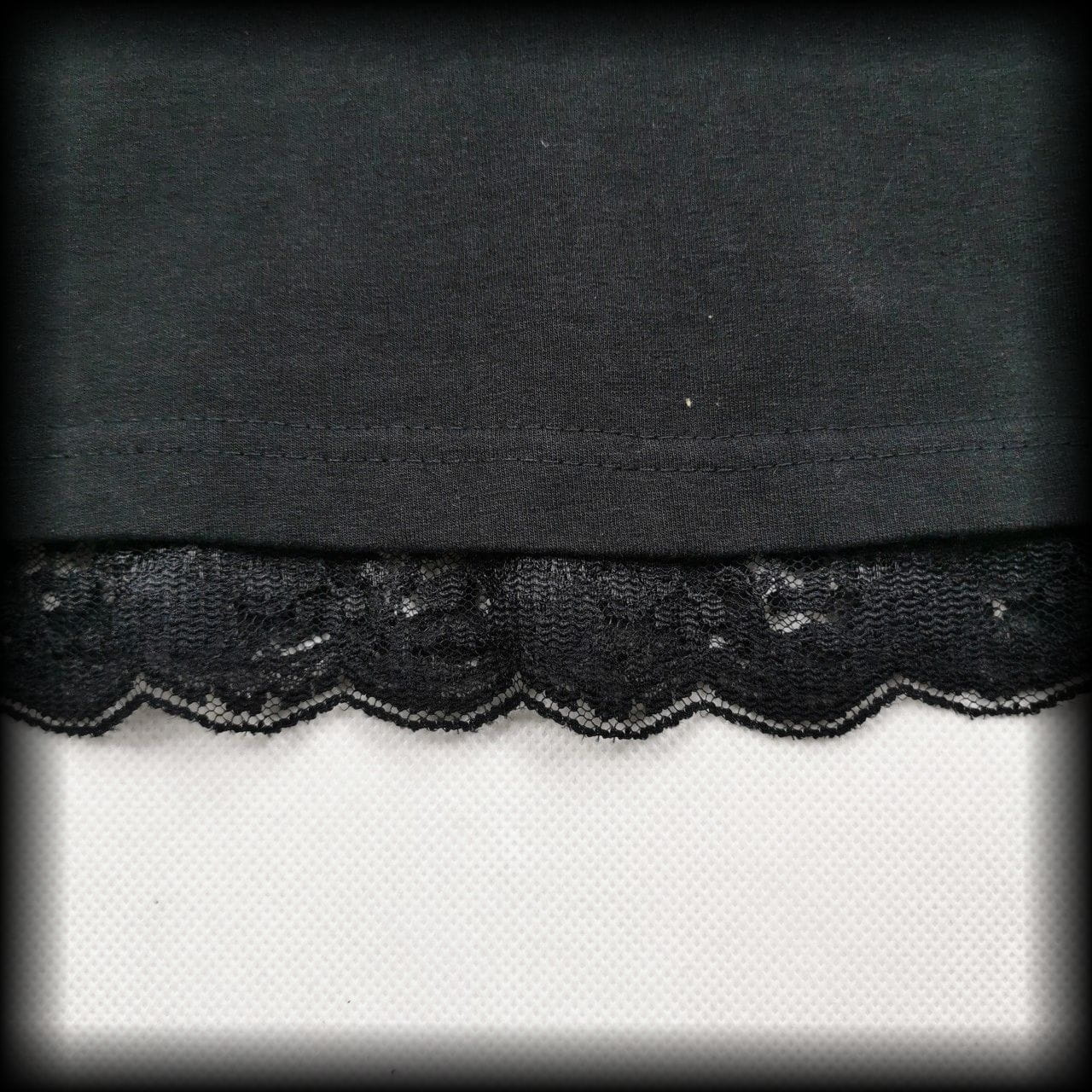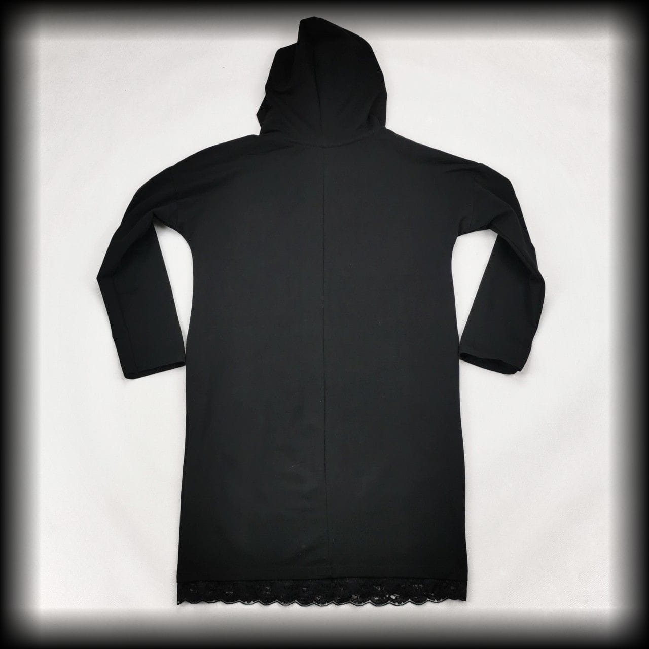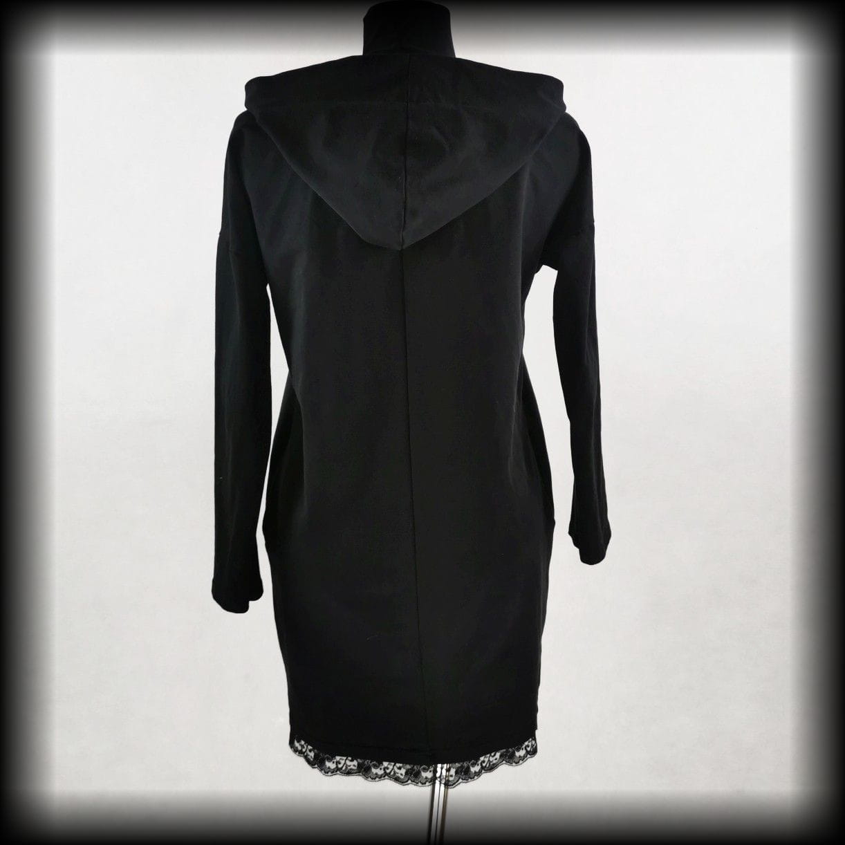 Czarna sukienka oversize z kapturem i ozdobną koronką na dole
