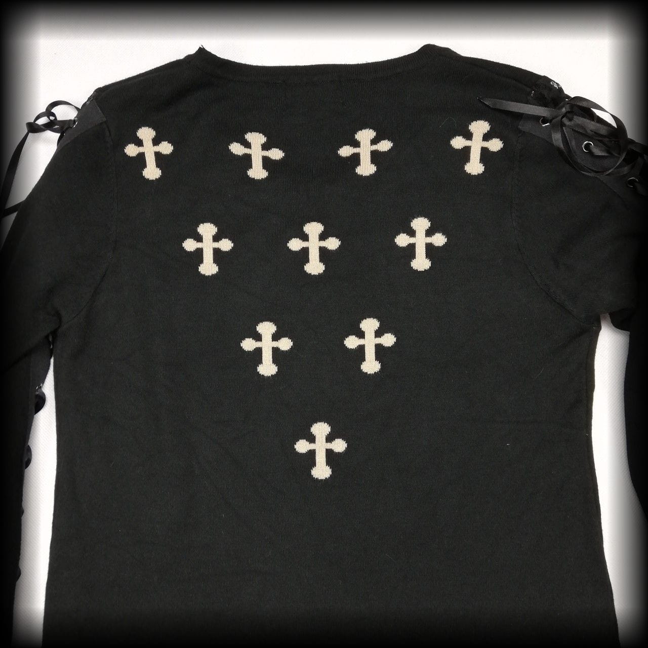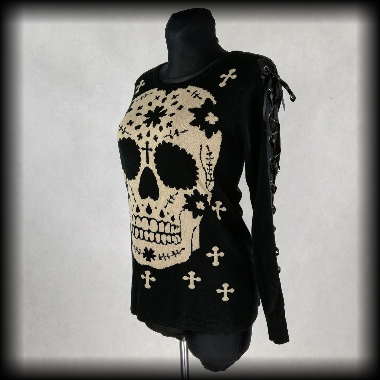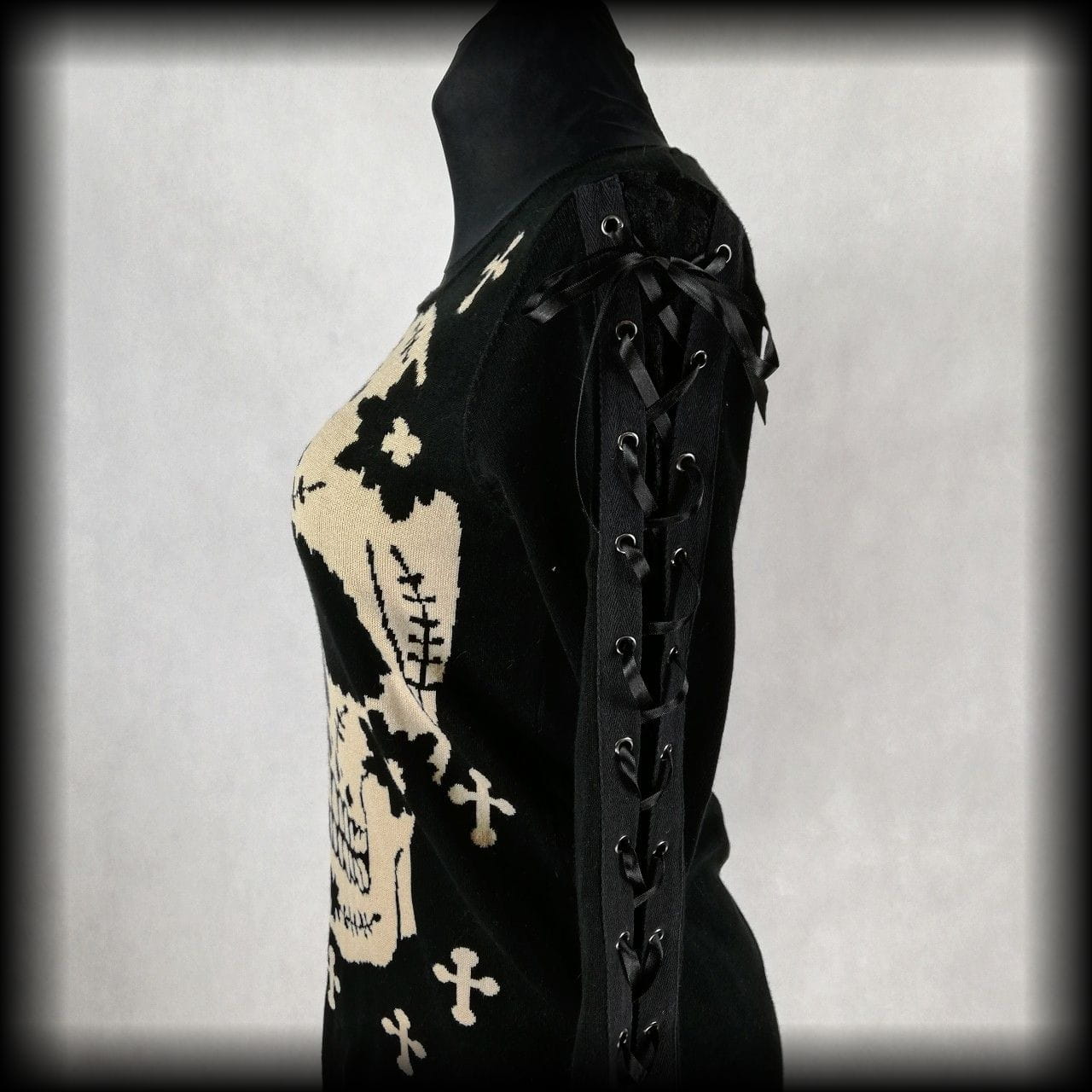 Czarny sweter z dużą czachą i krzyżami. Po bokach rękawów wiązania gorsetowe