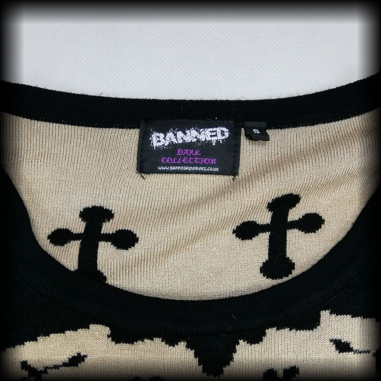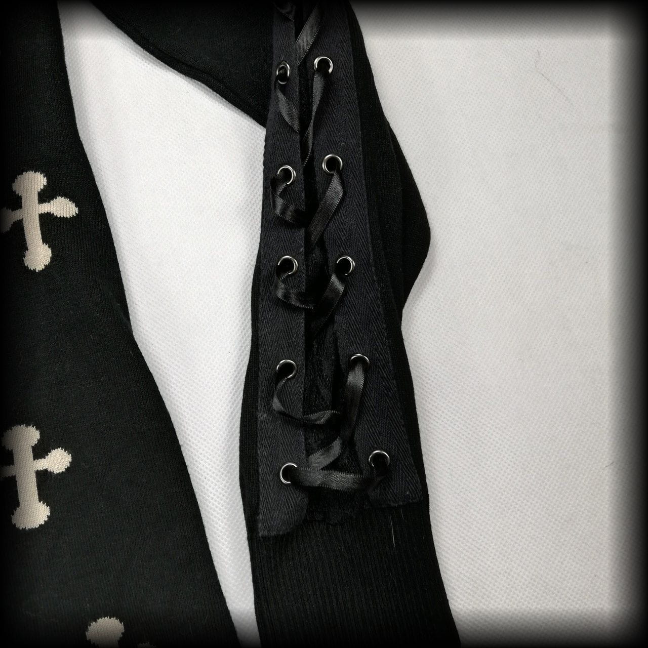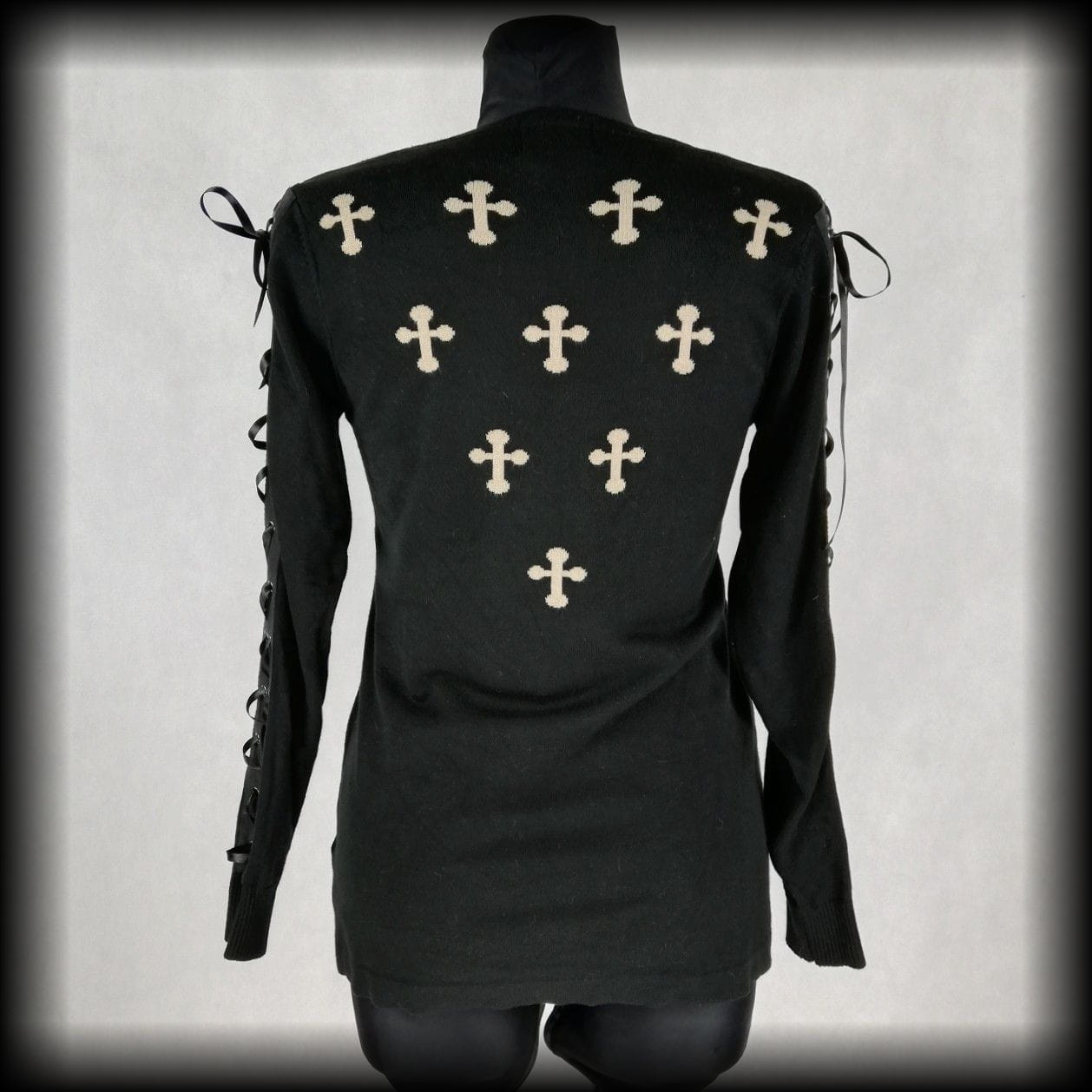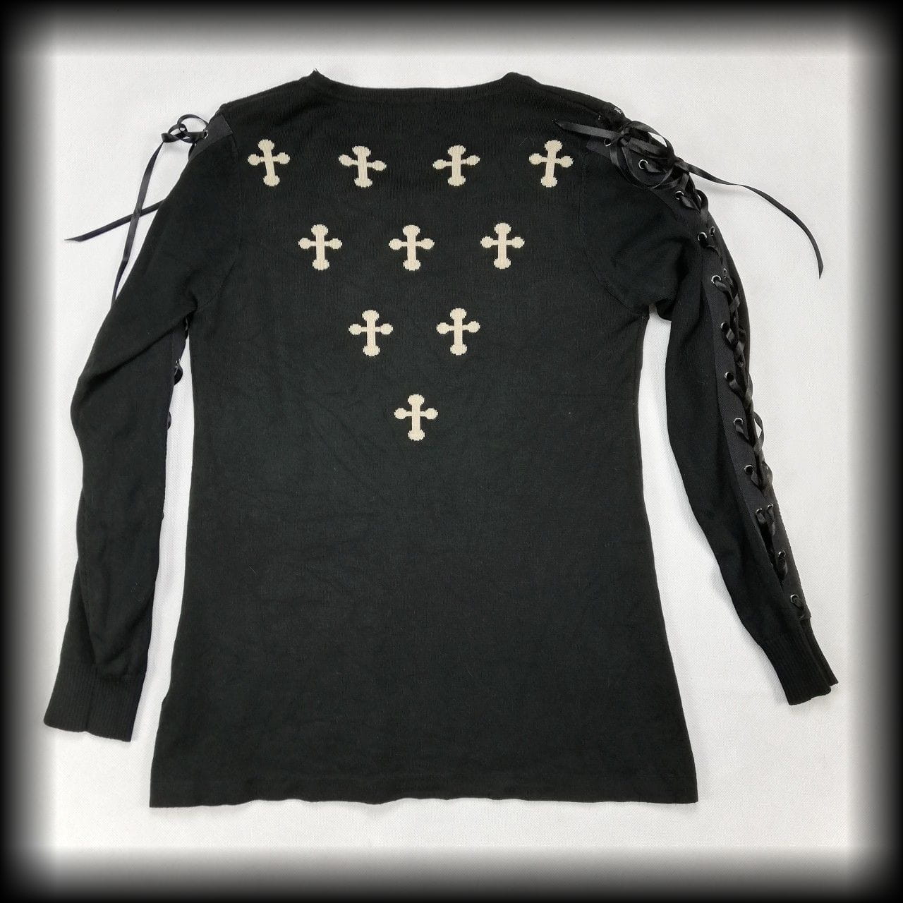 Czarny sweter z dużą czachą i krzyżami. Po bokach rękawów wiązania gorsetowe