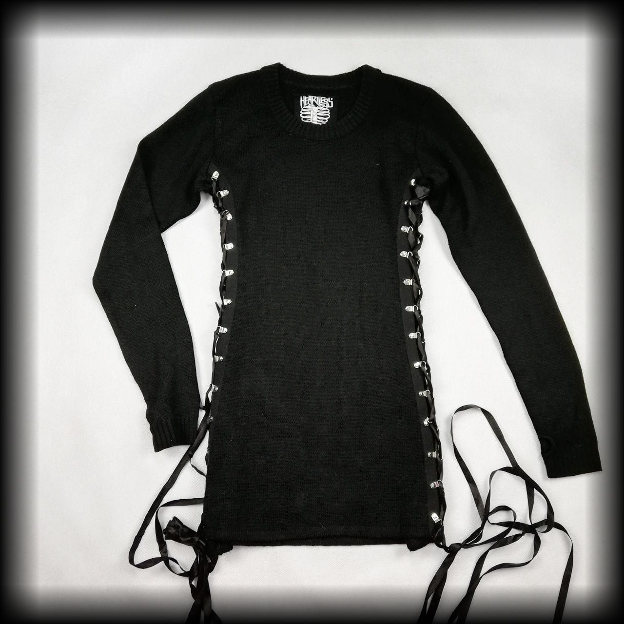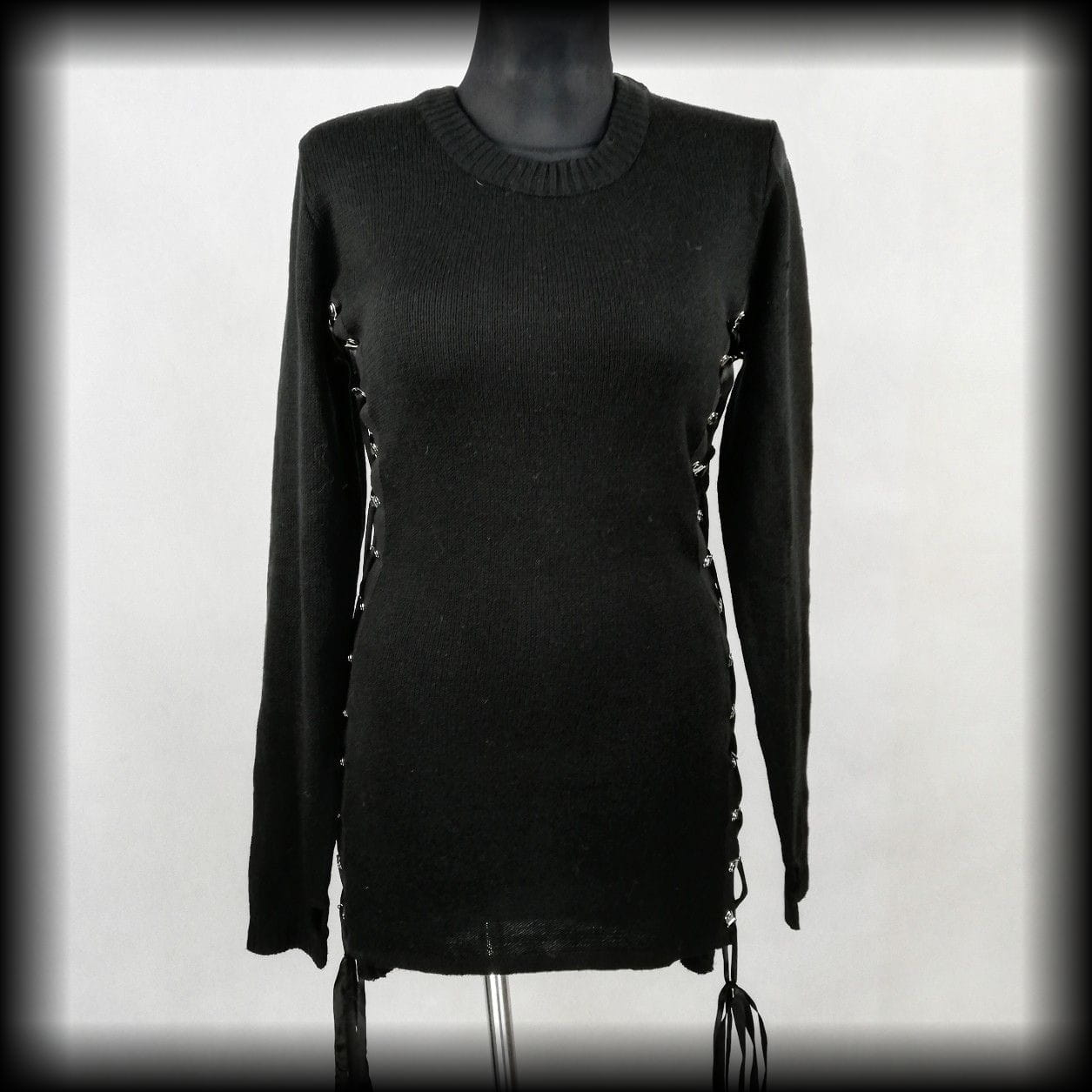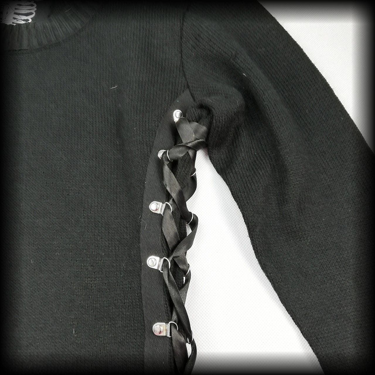 Czarny długi sweter. Po bokach wiązania gorsetowe