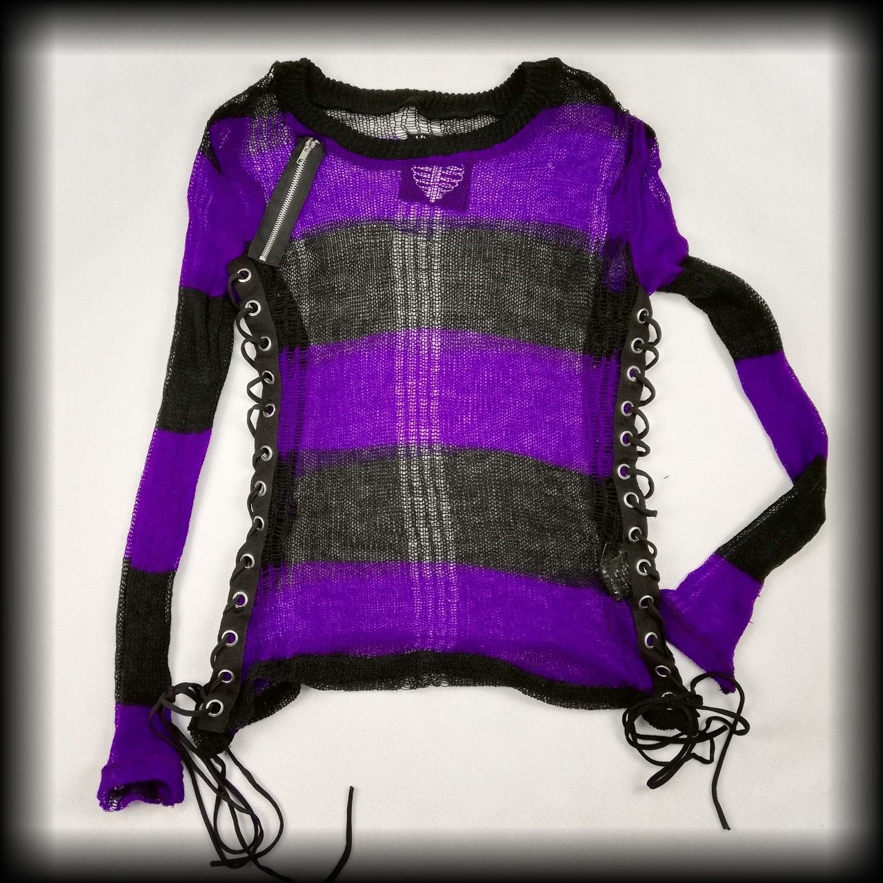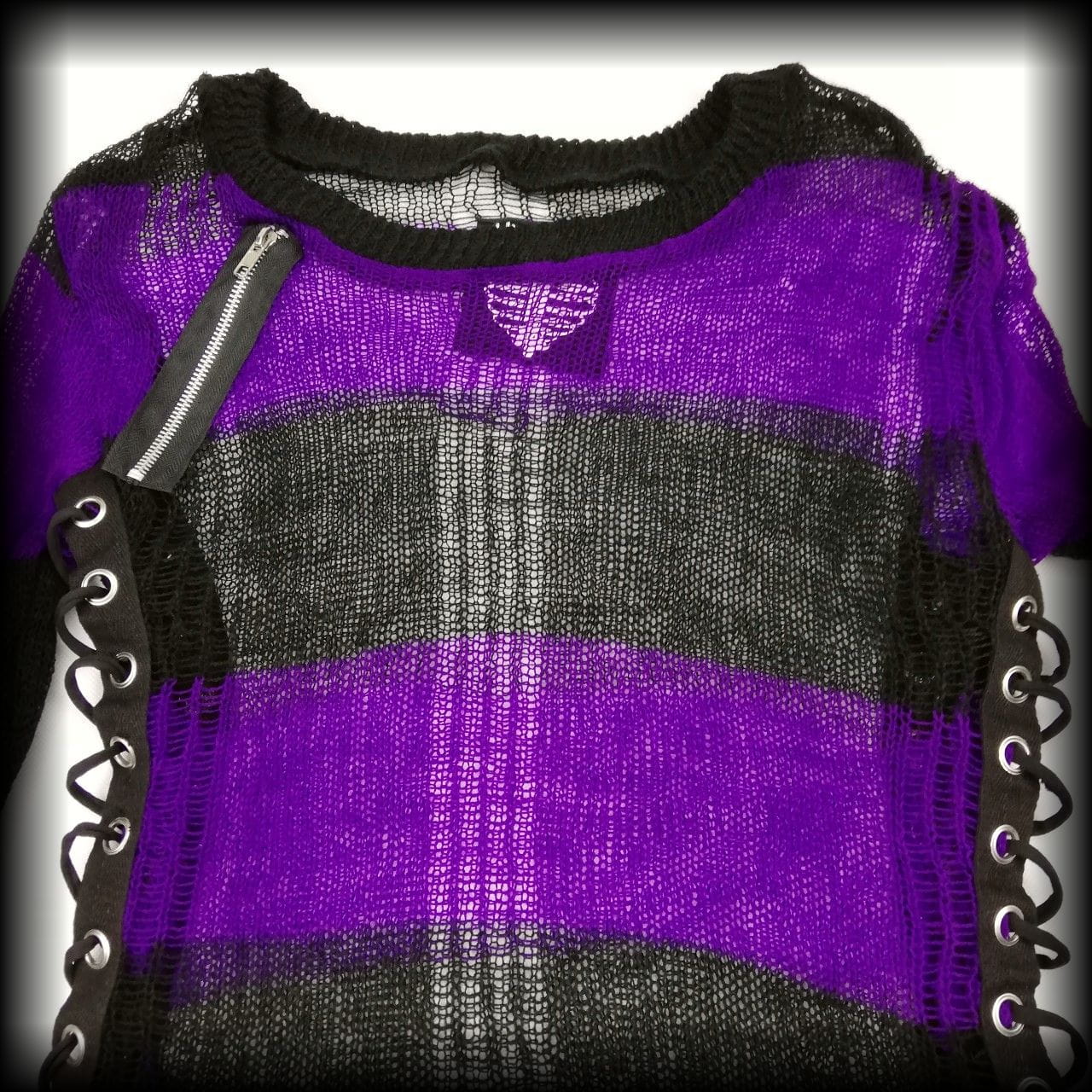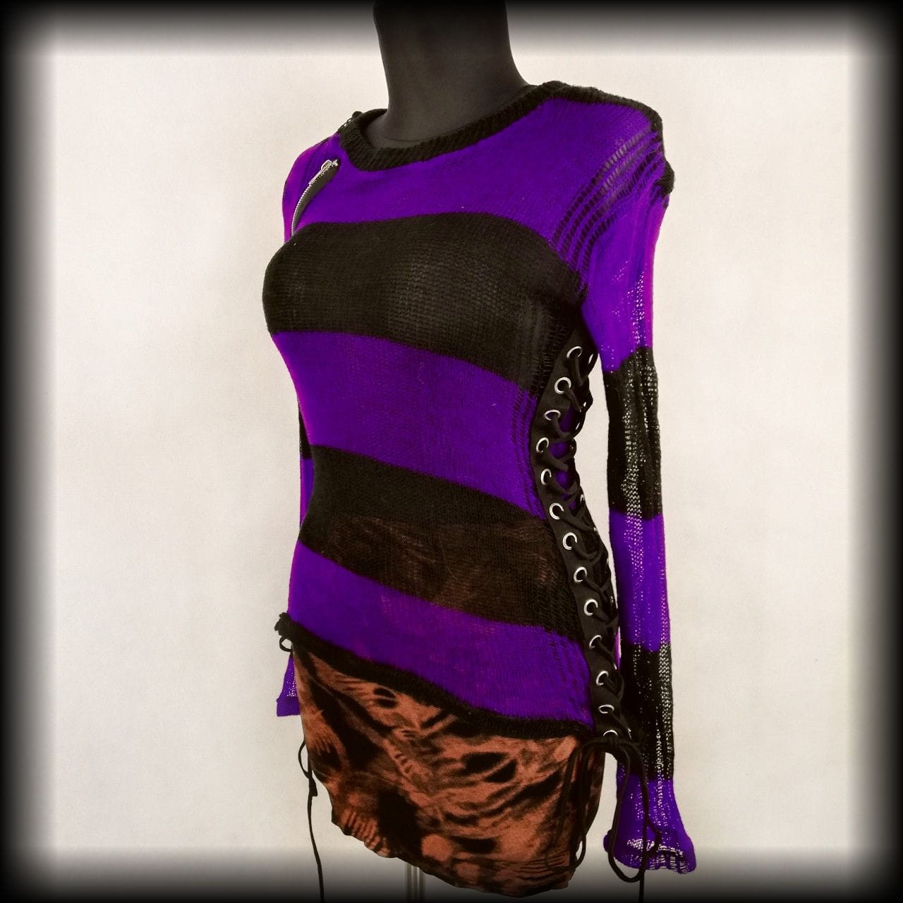 Czarno fioletowy ażurowy sweter w paski. Po bokach wiązania gorsetowe