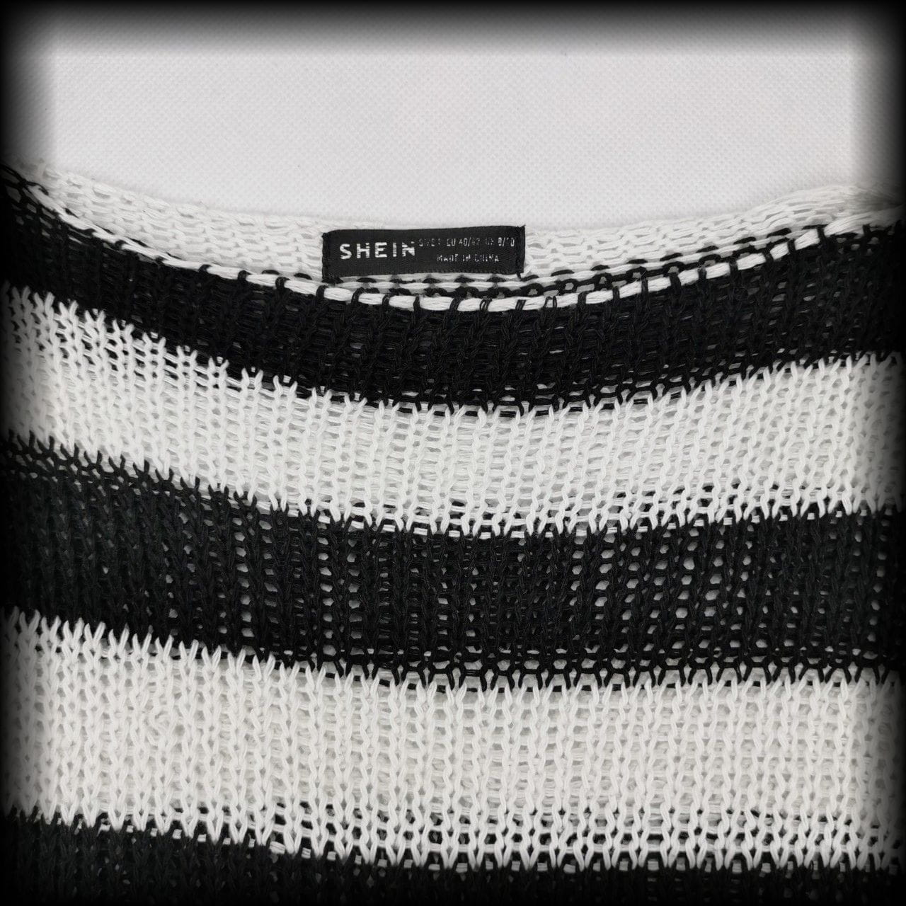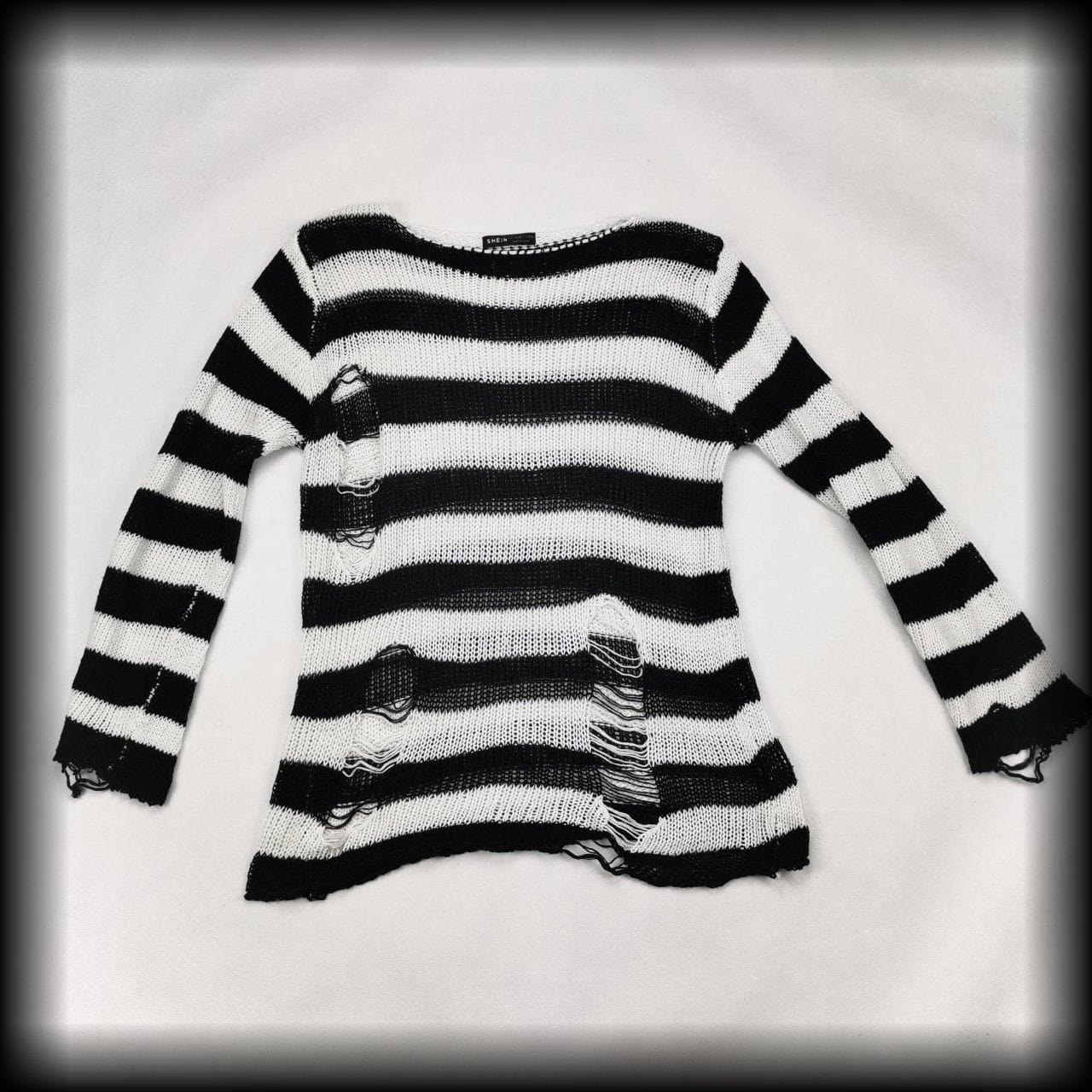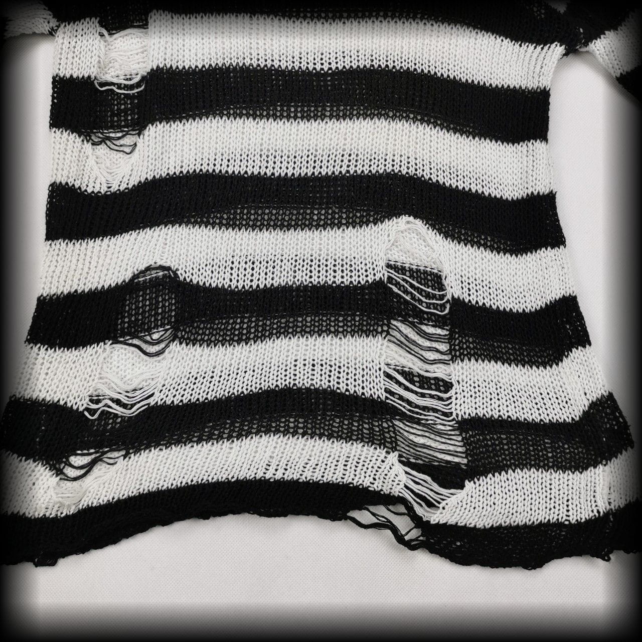 Czarno biały ażurowy sweter w paski z fabrycznymi dziurami