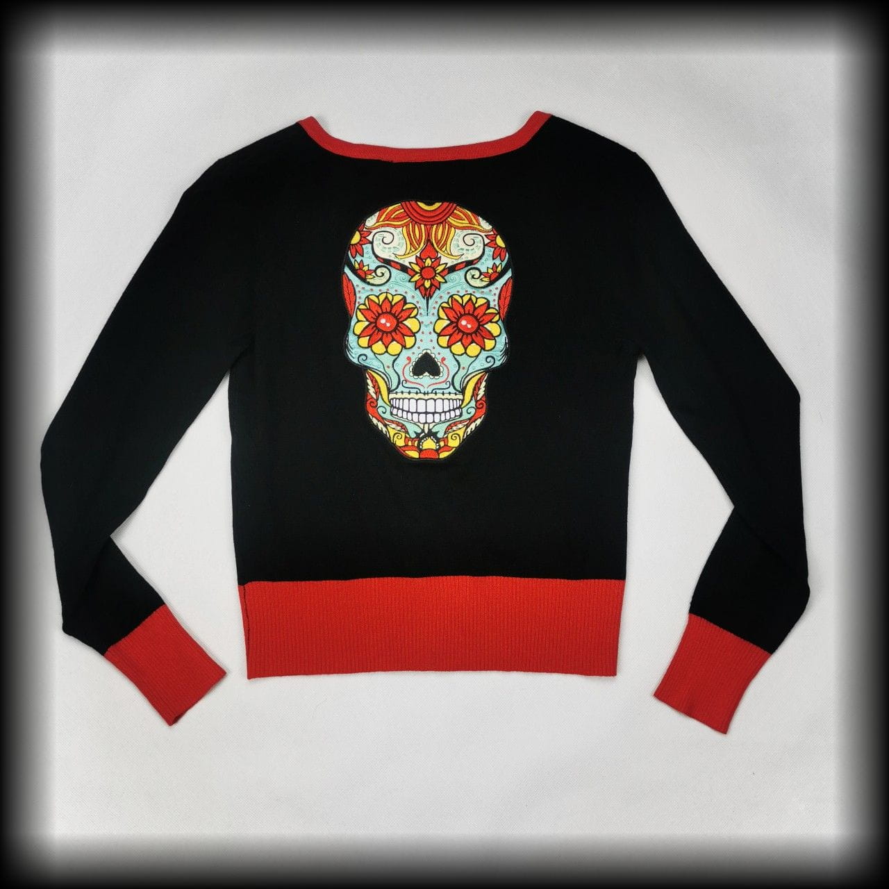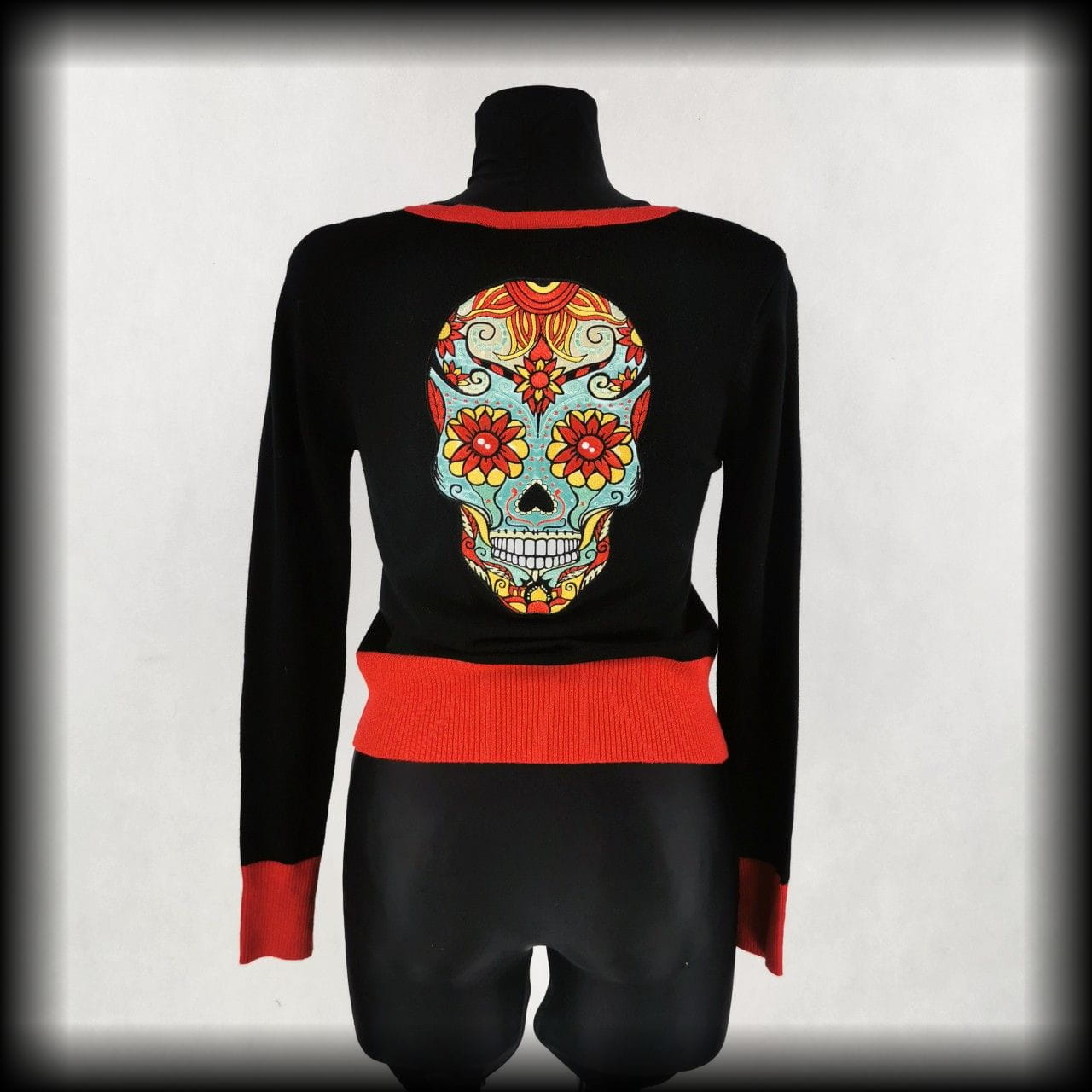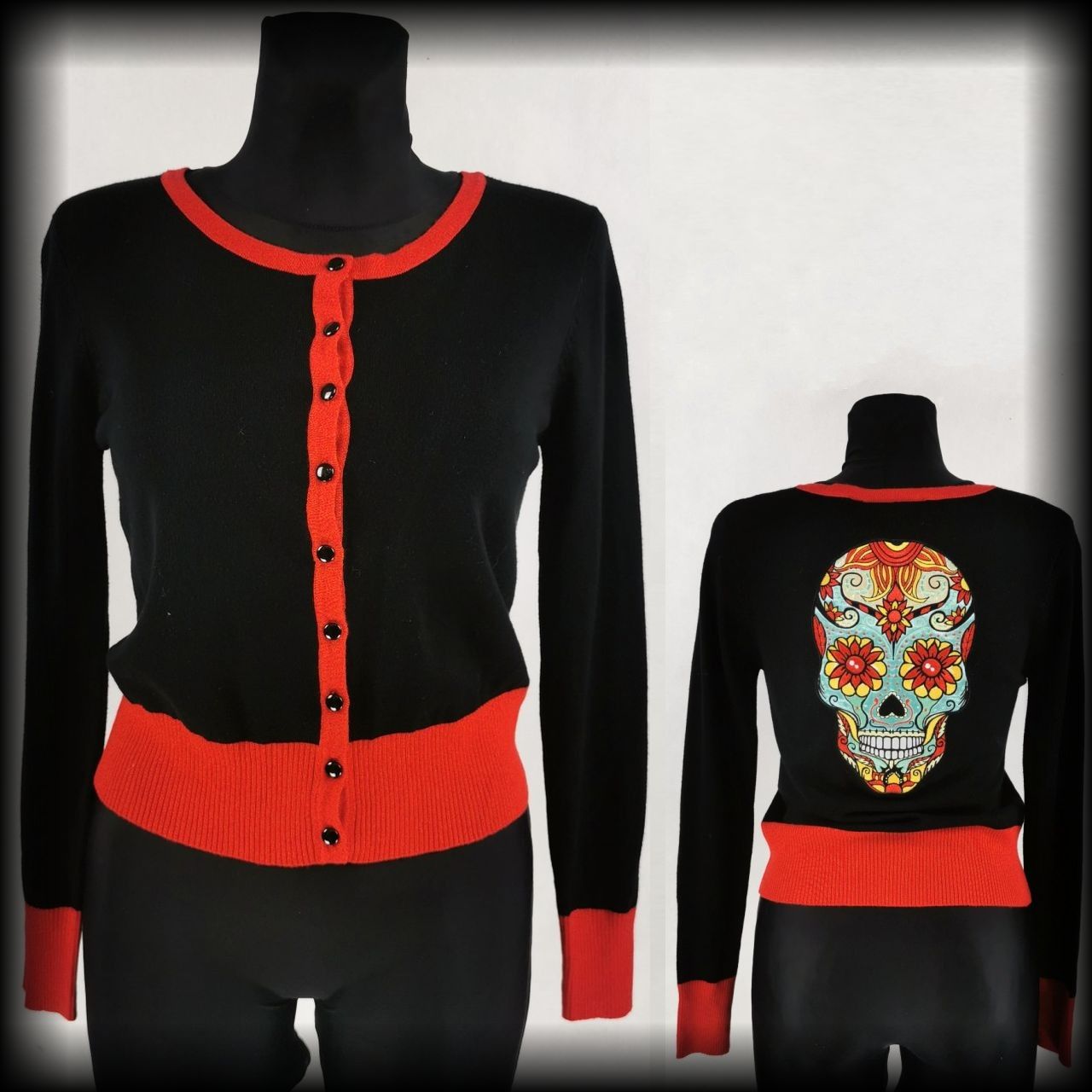 Czarno czerwony rozpinany sweterek z dużą aplikacją czaszką na plecach