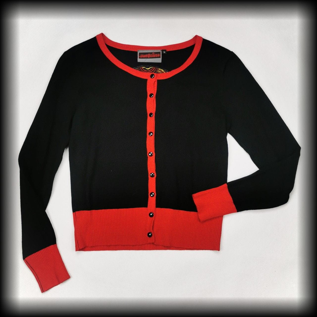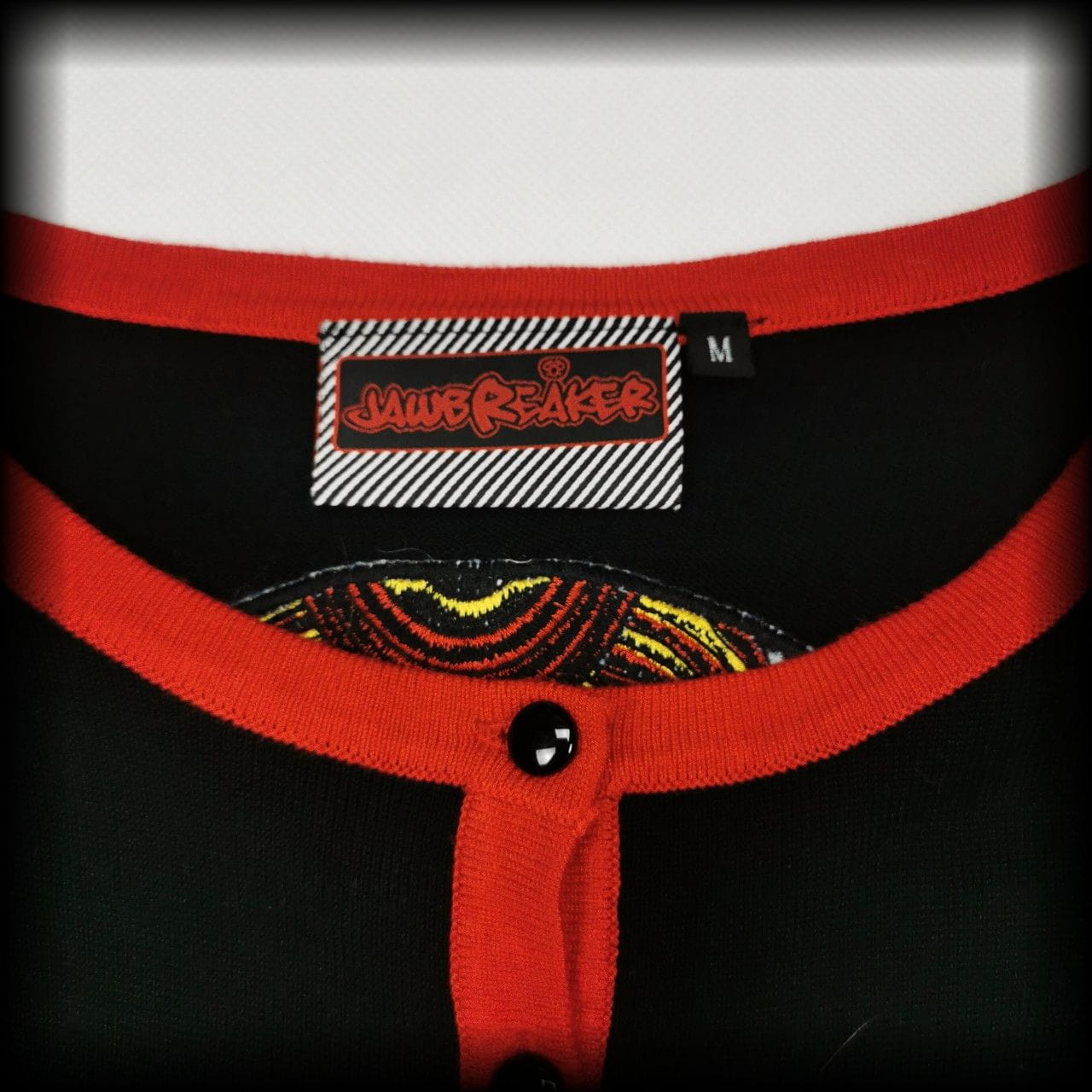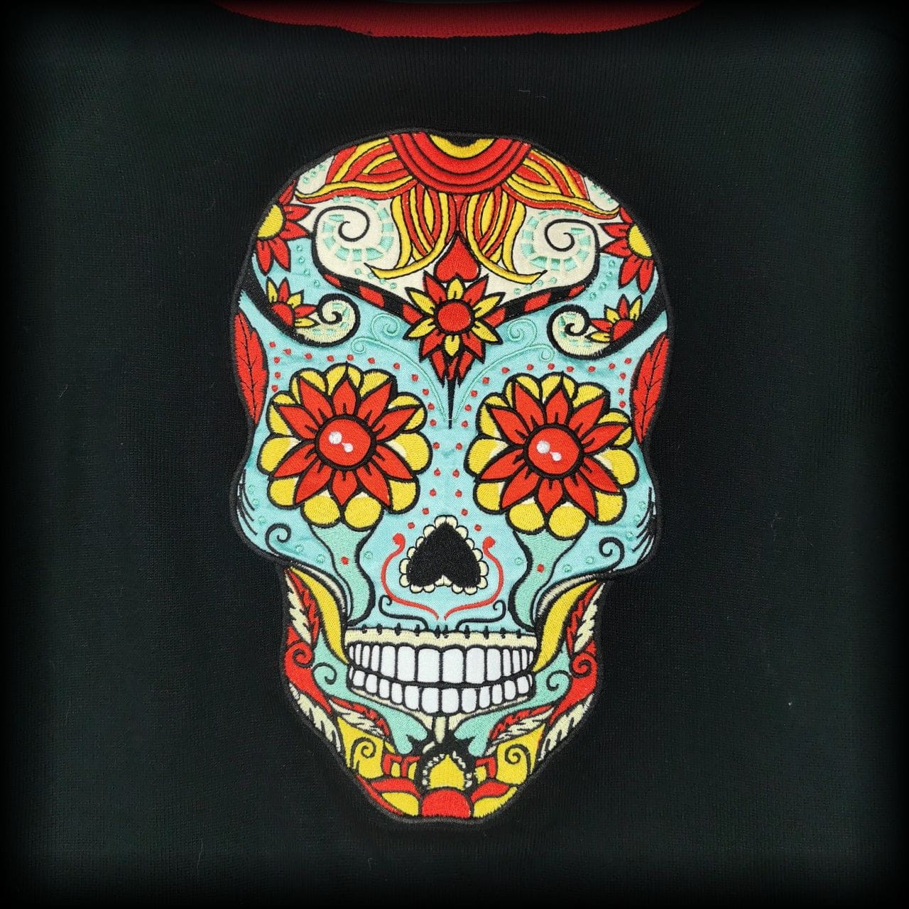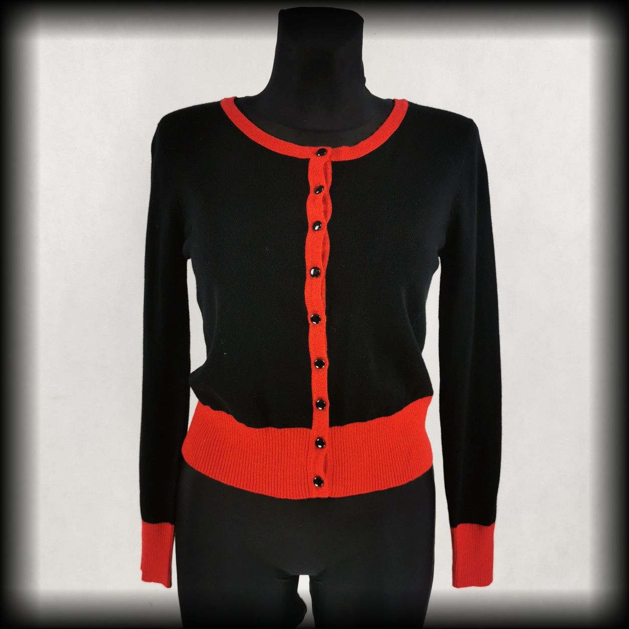 Czarno czerwony rozpinany sweterek z dużą aplikacją czaszką na plecach
