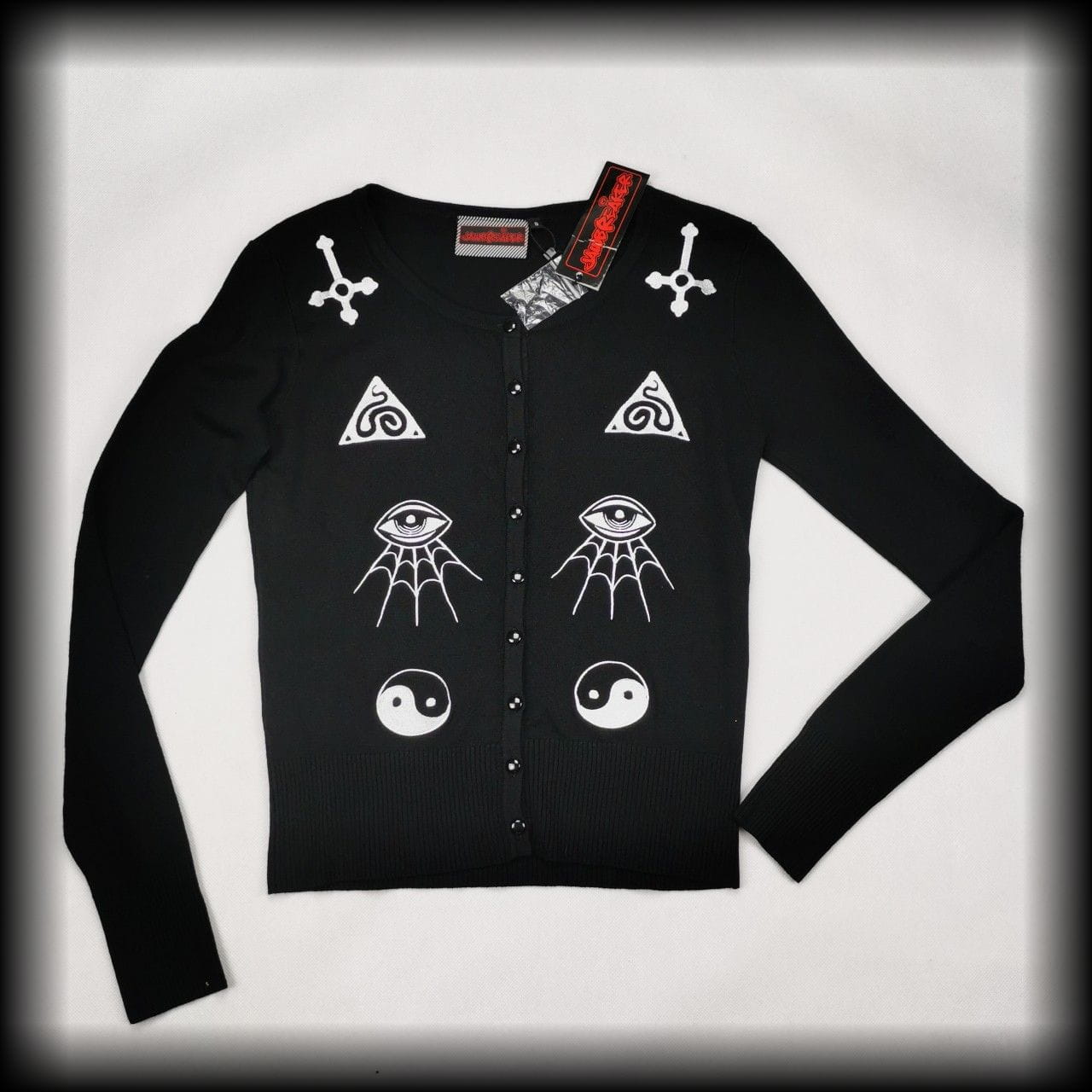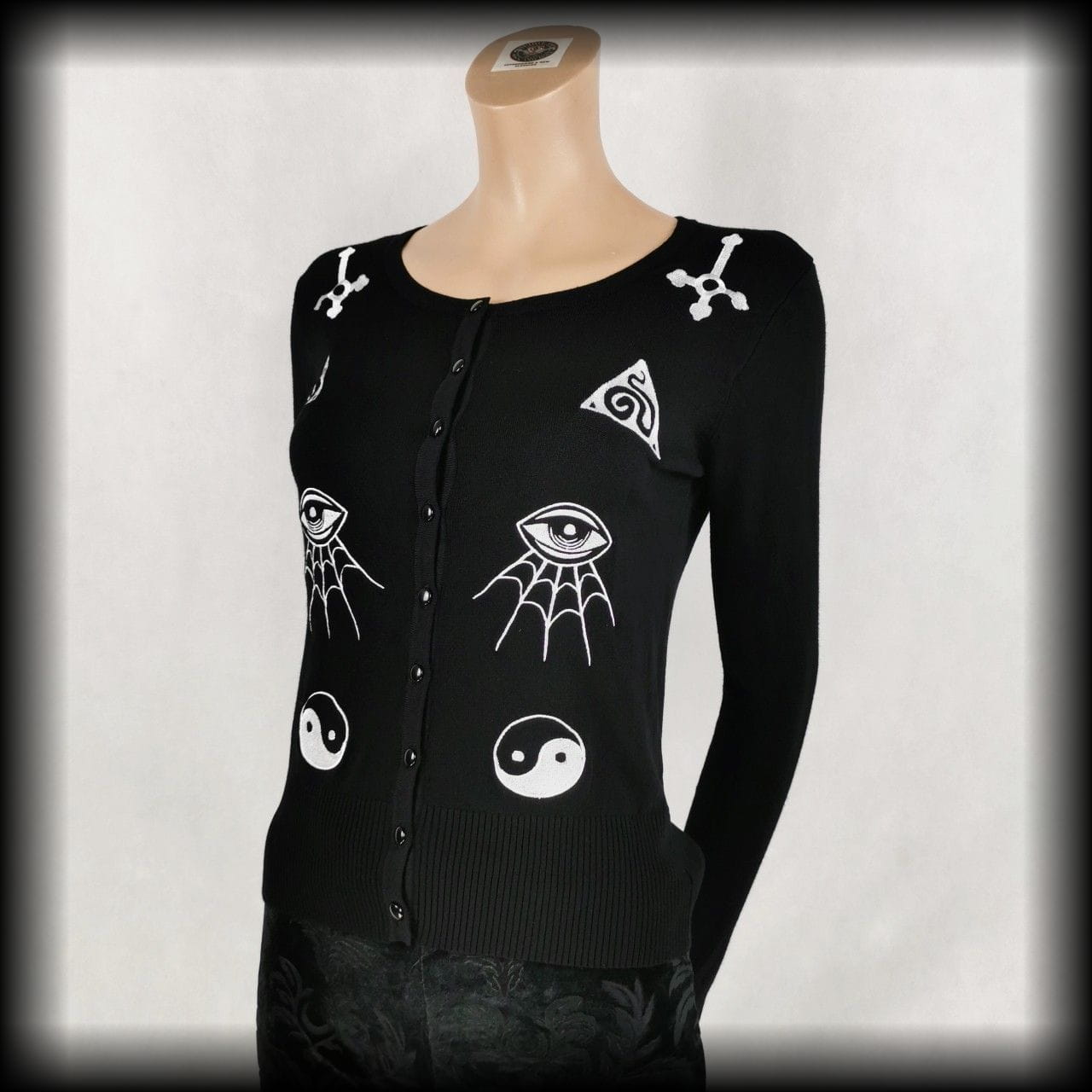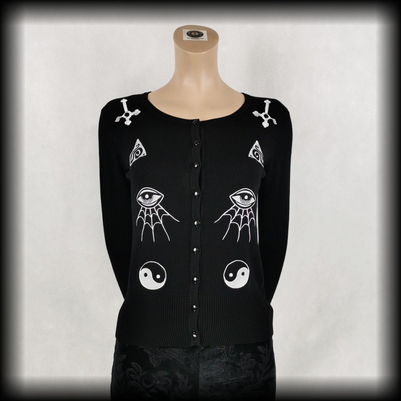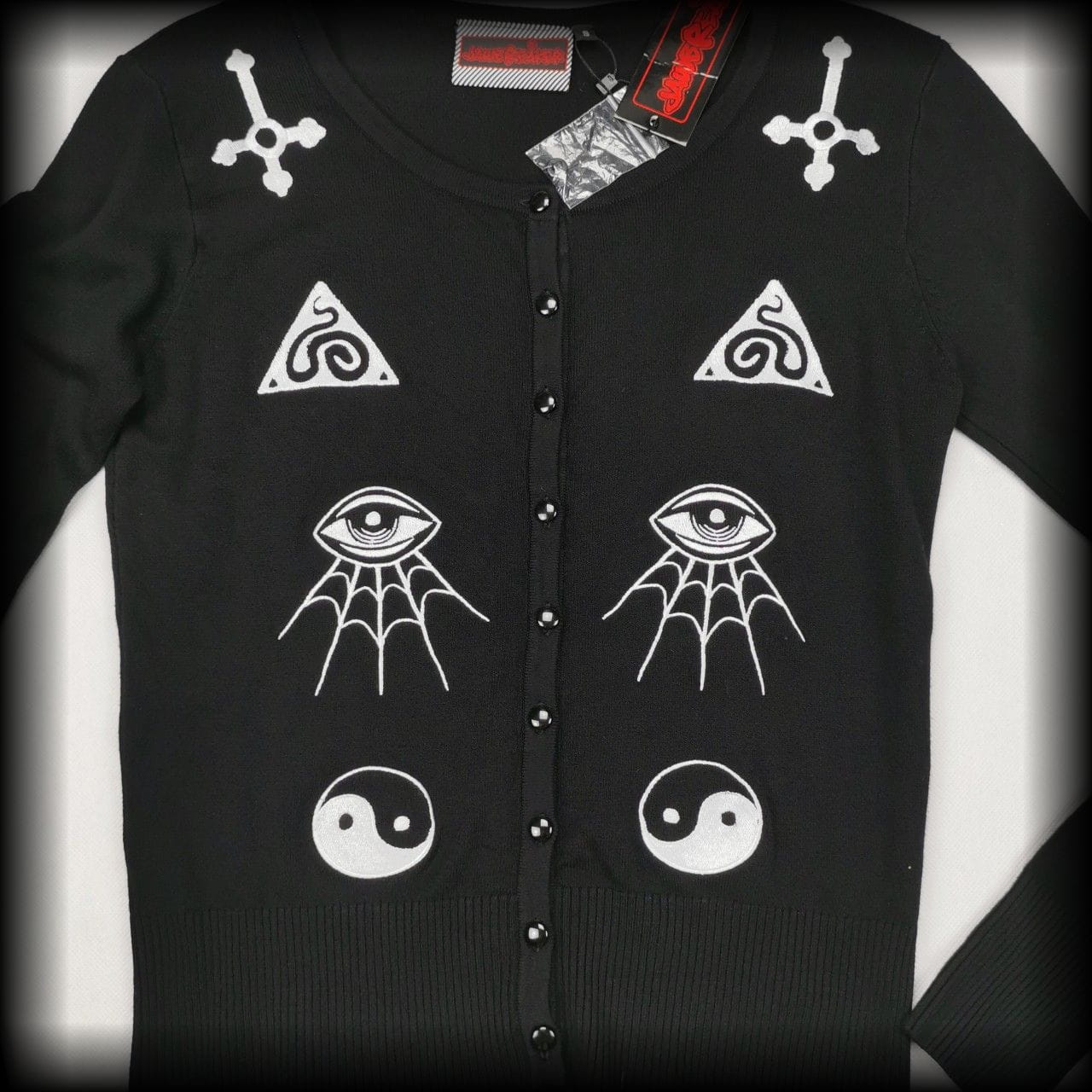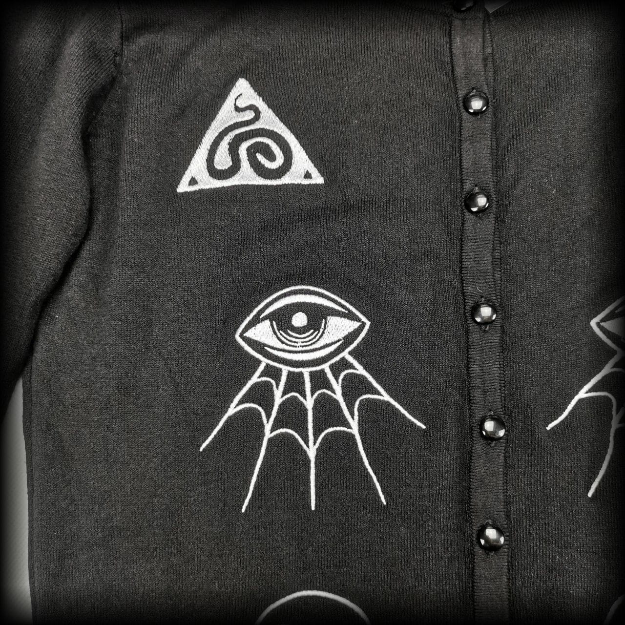 Czarny rozpinany sweterek oversize z okultystycznymi aplikacjami