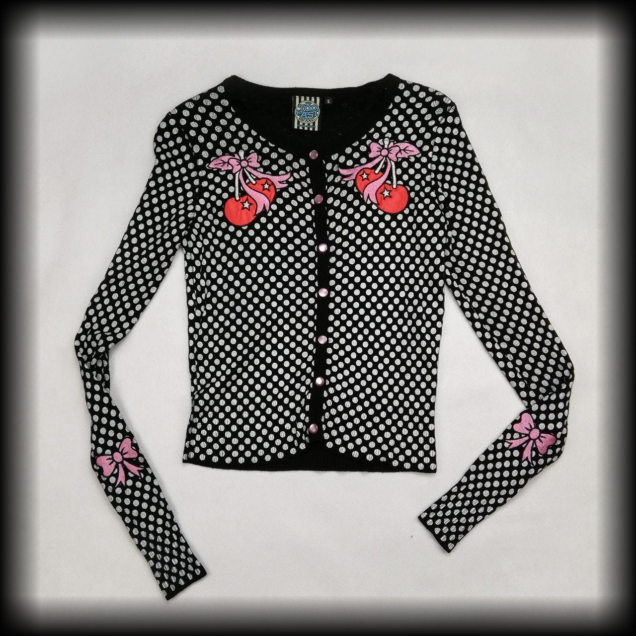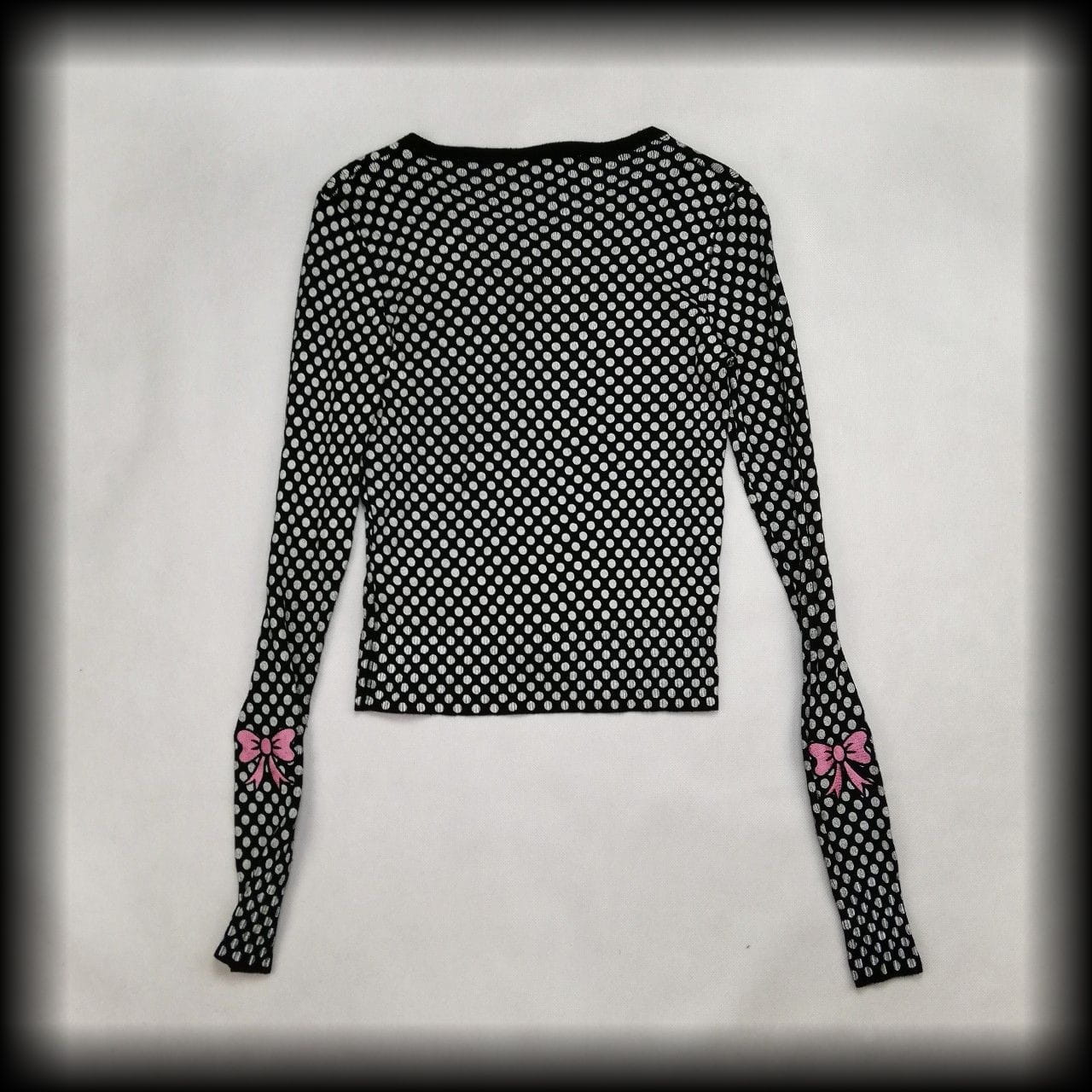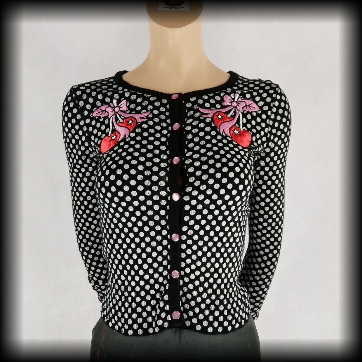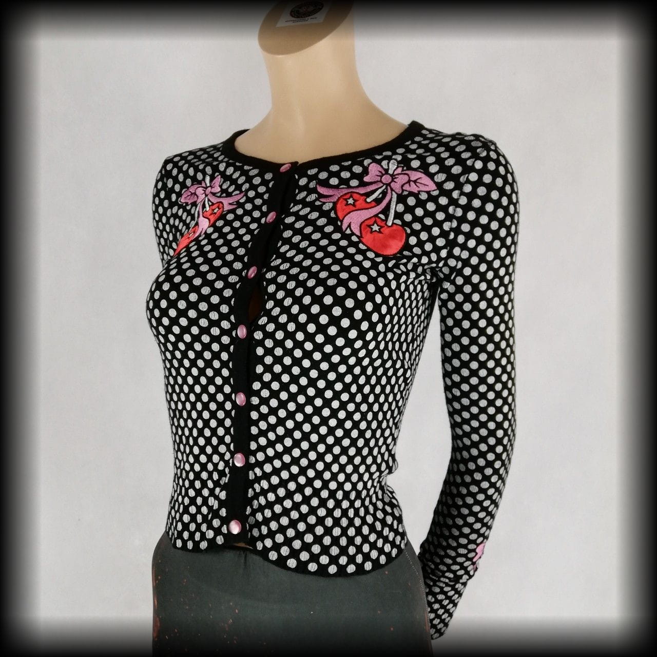 Czarny sweterek w białe groszki i aplikacje wisienki. Na rękawach aplikacje kokardki