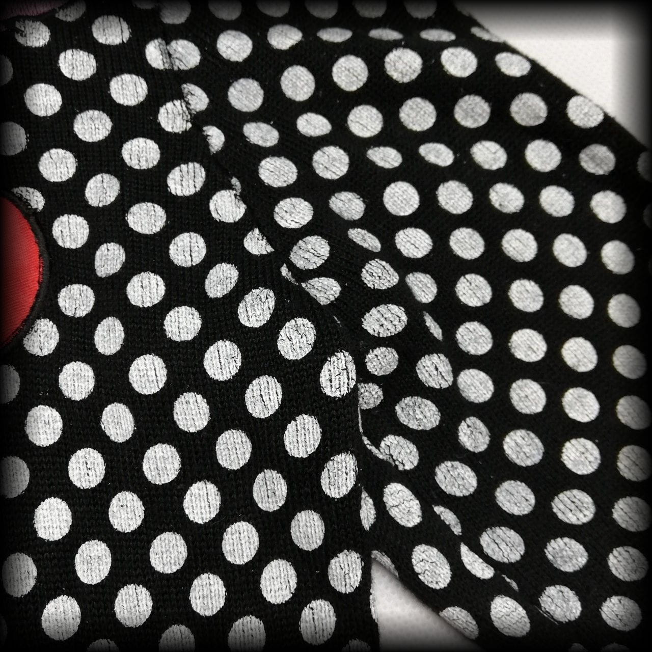 Używany w bardzo dobrym stanie z minusem - z racji elastyczności materiału farba na groszkach jest delikatnie popękana