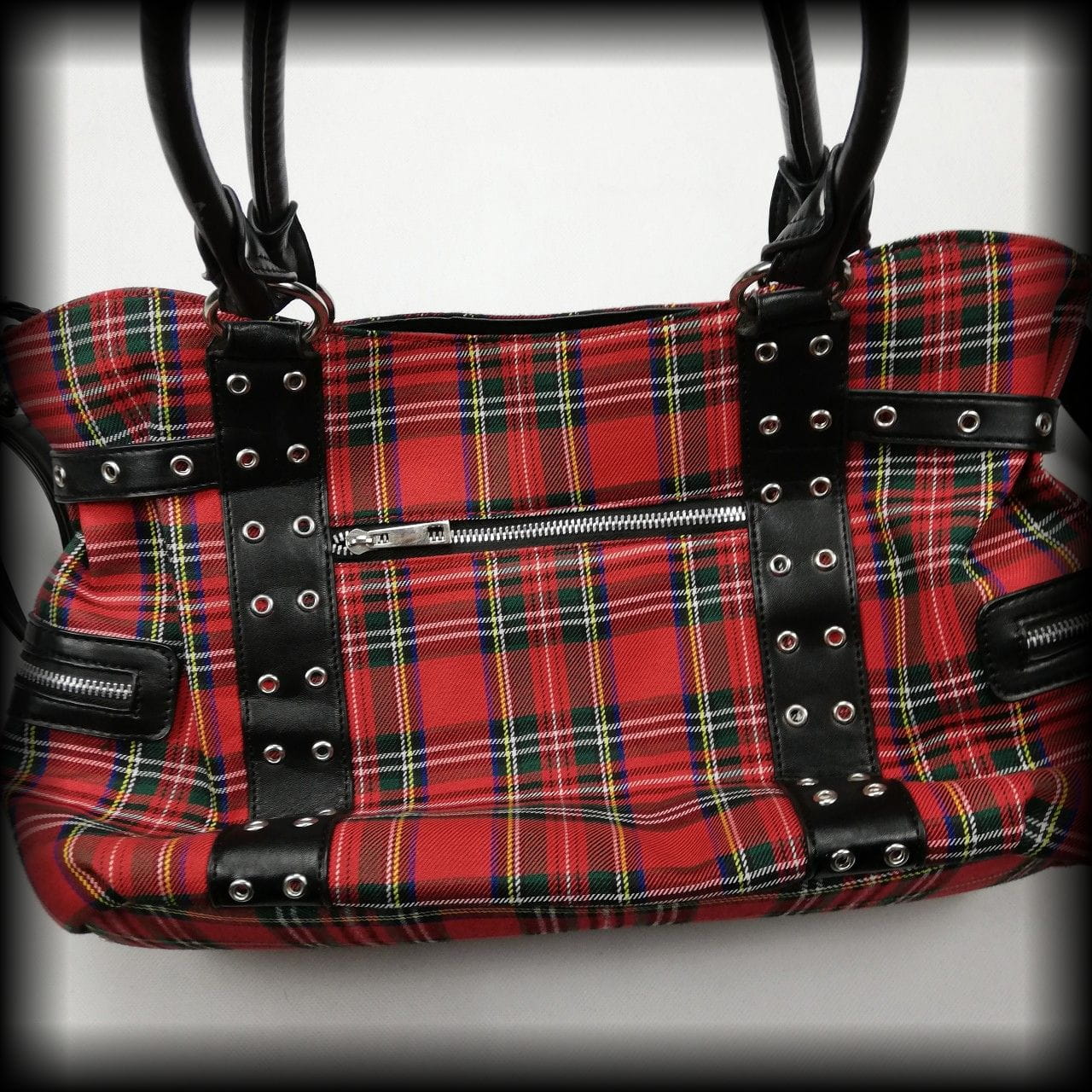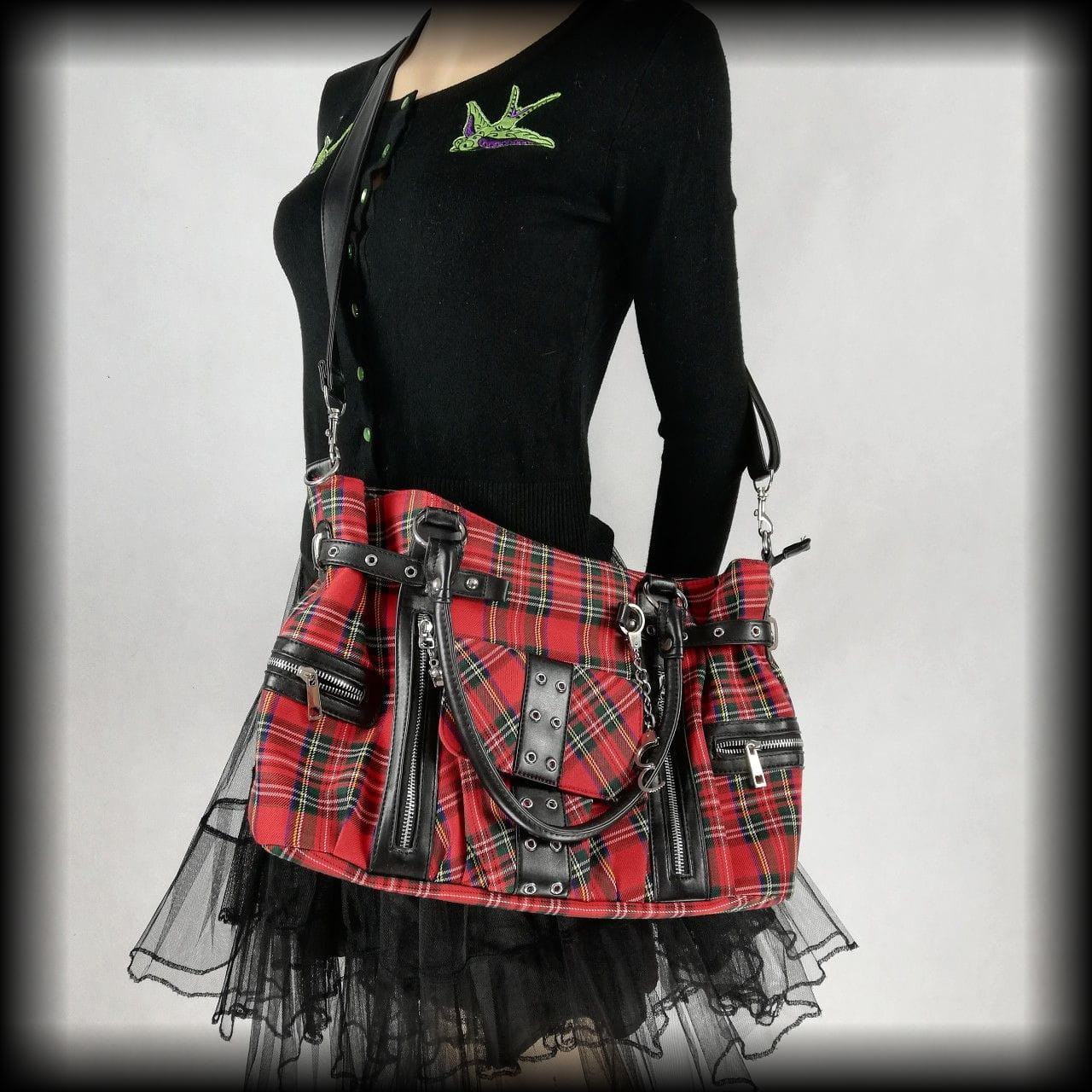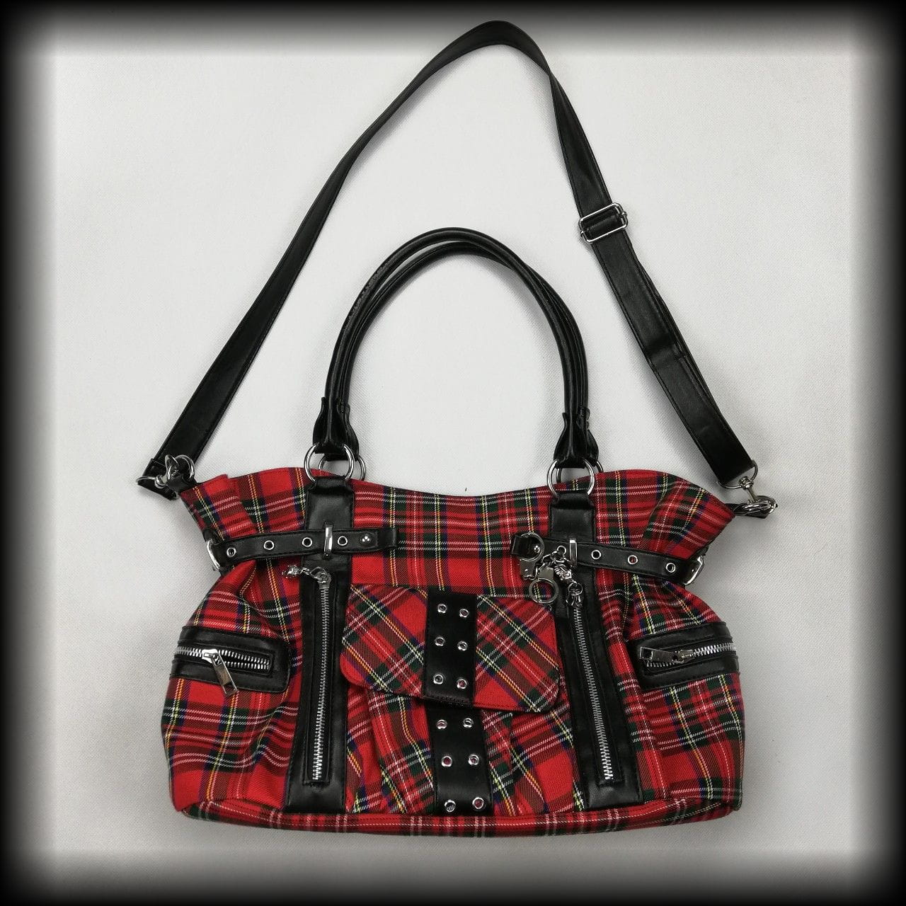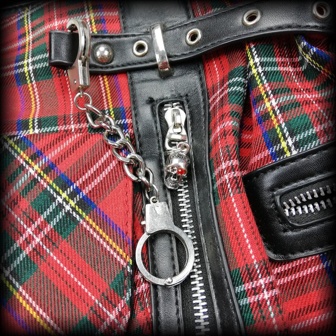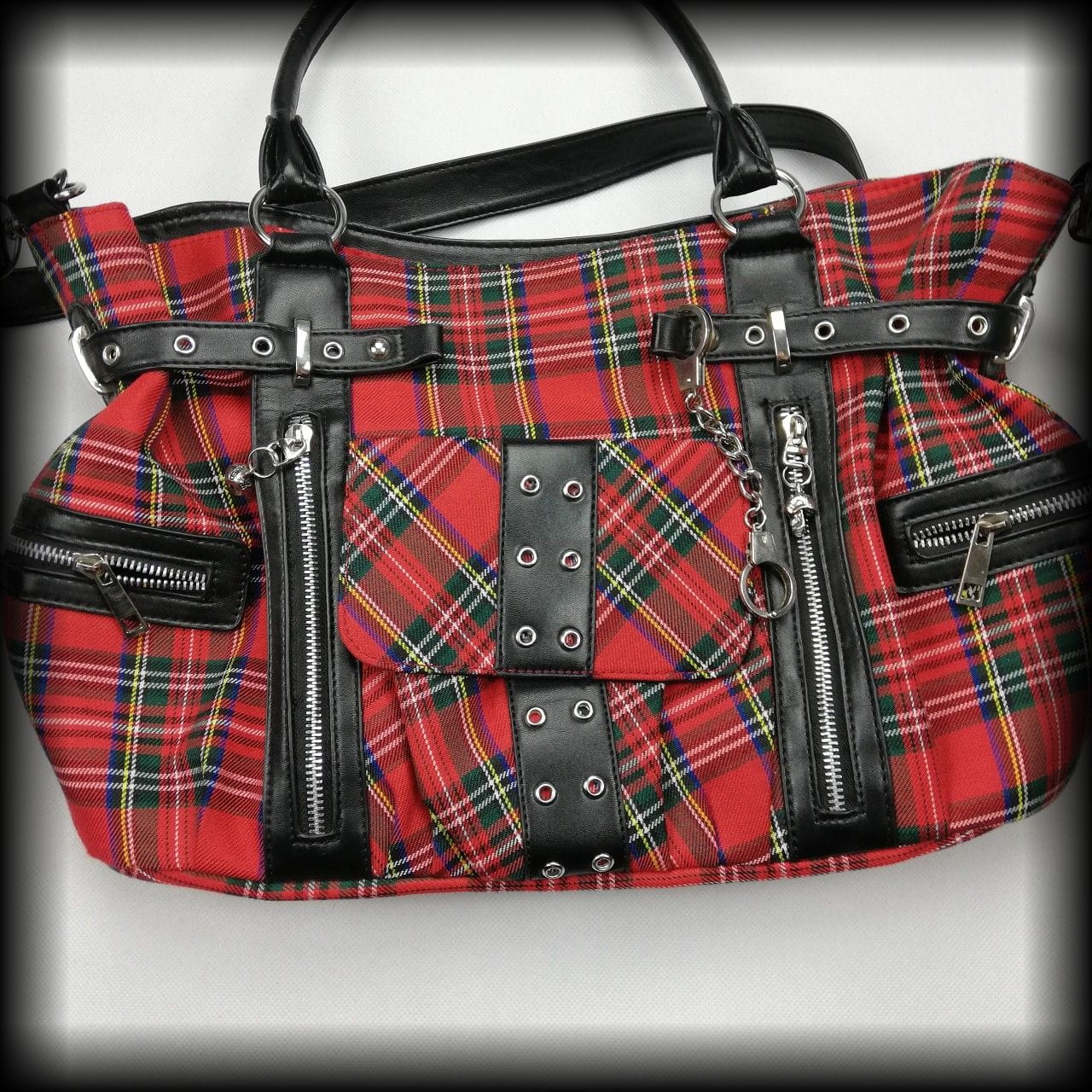 Torba w szkocką kratę z licznymi kieszeniami i grubymi zamkami z czachami
