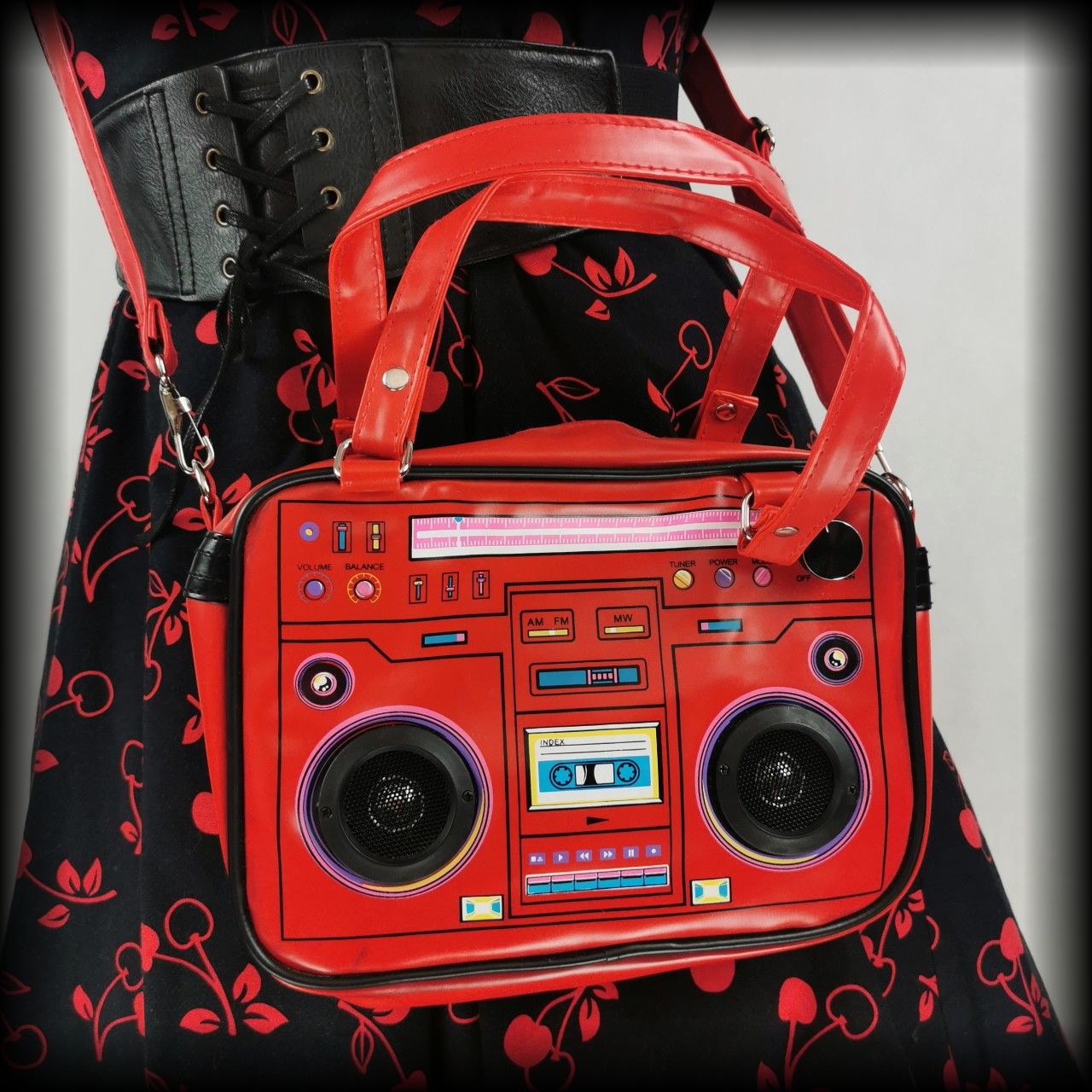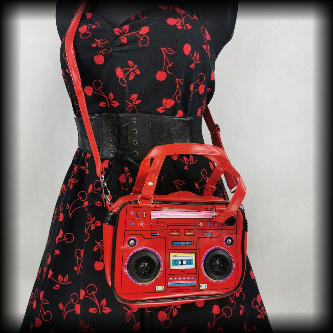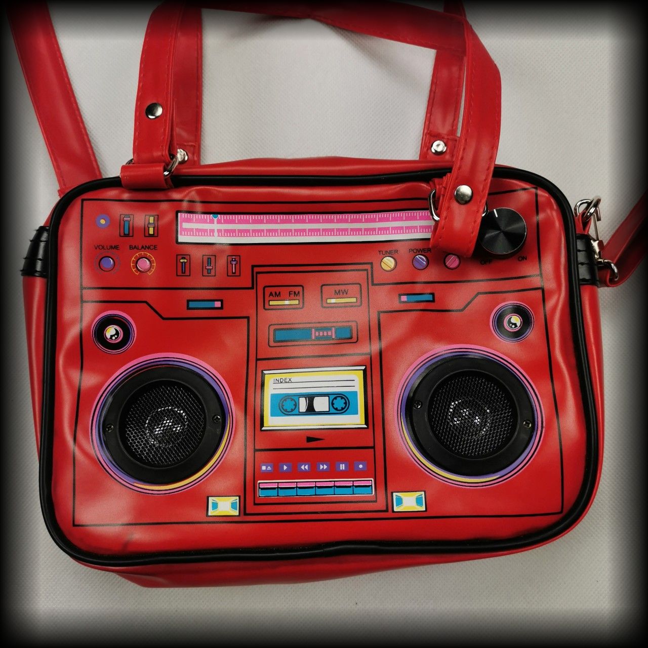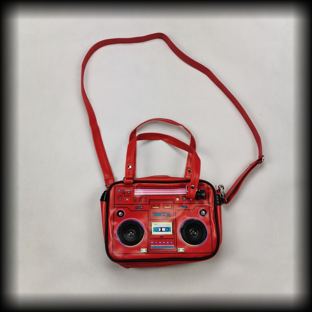 Czerwona torebka jak old schoolowy magnetofon. Posiada wbudowane głośniki (nie sprawdzone czy działają)