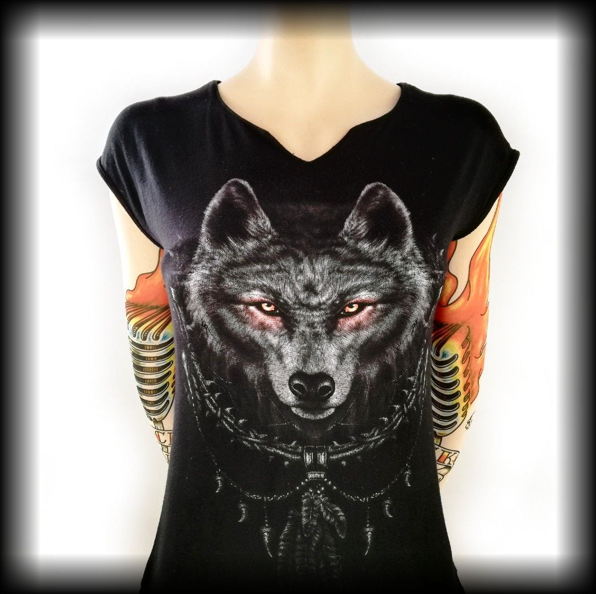 Czarna tunika z dzianiny bez rękawów z motywem wilka